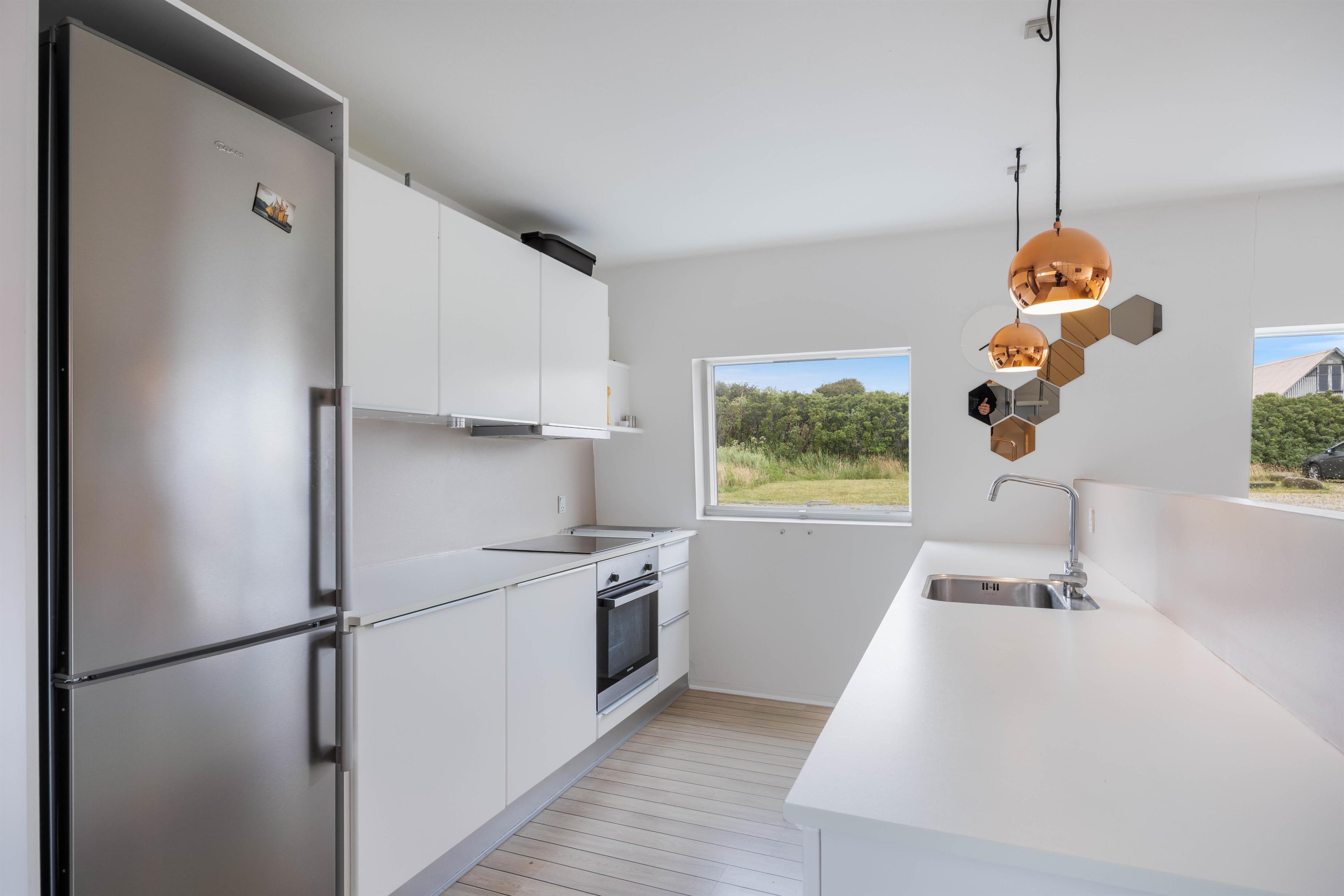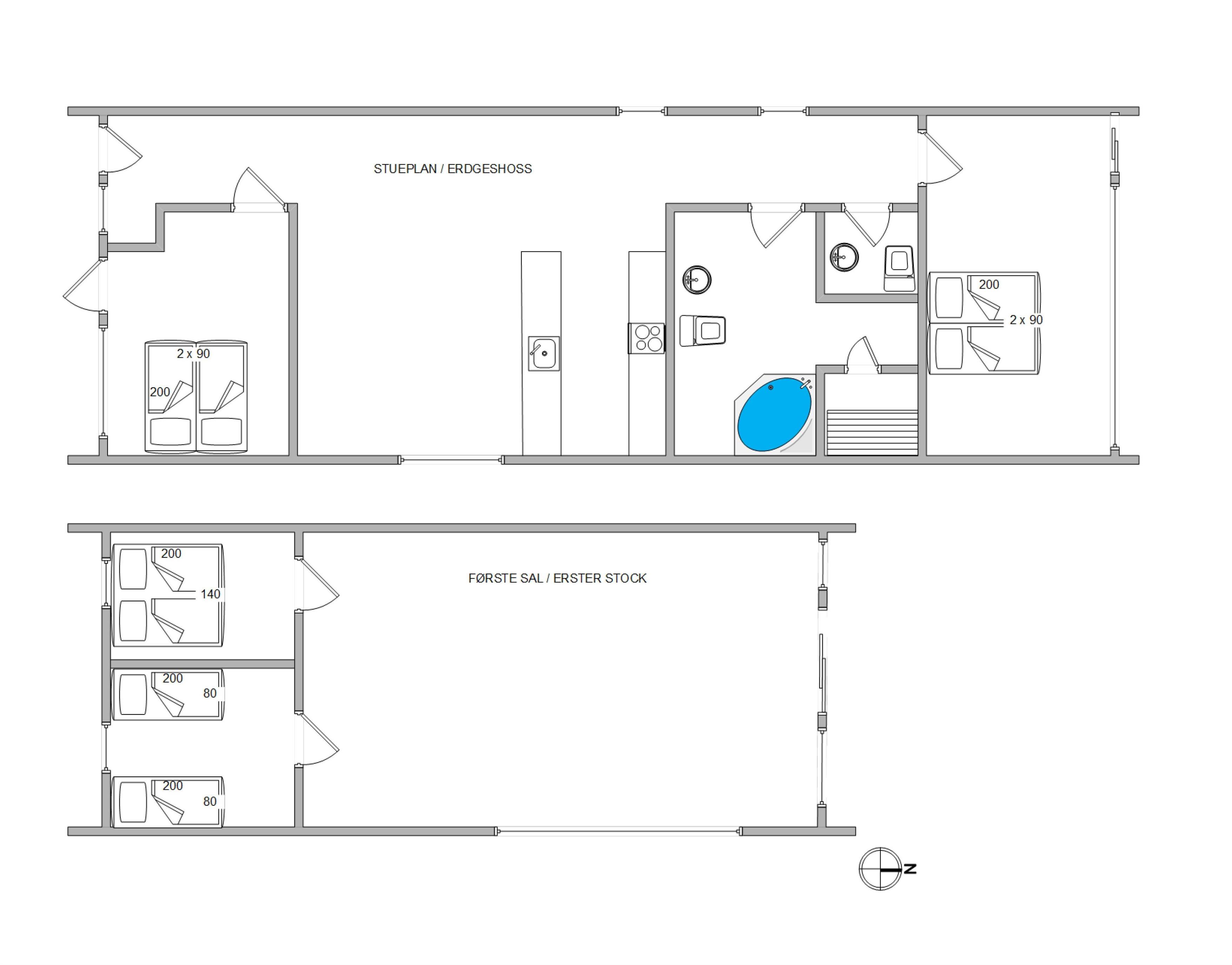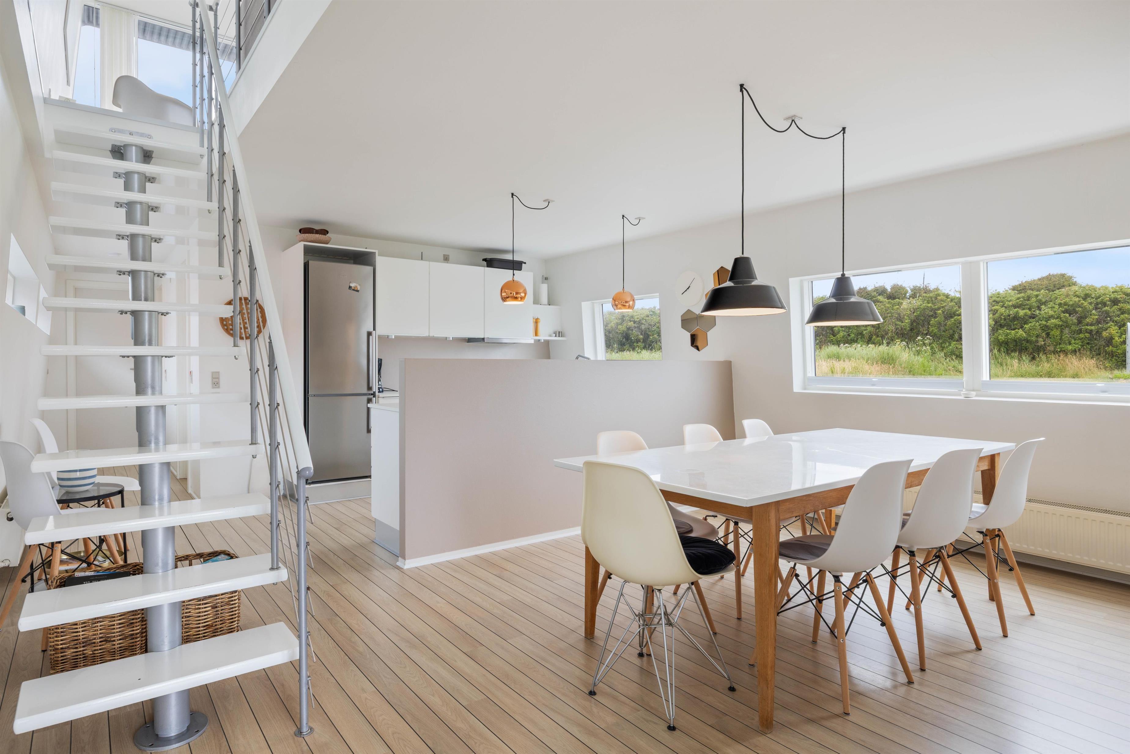 I stueetagen har du et dejligt åbent køkken og spiseafdelingen, hvor du sammen med familien kan hygge omkring madlavningen og måltiderne. Derudover er der to soverum, et praktisk gæstetoilet samt et badeværelse med både spabad og sauna, så der rigtig kan slappes af under ferien.