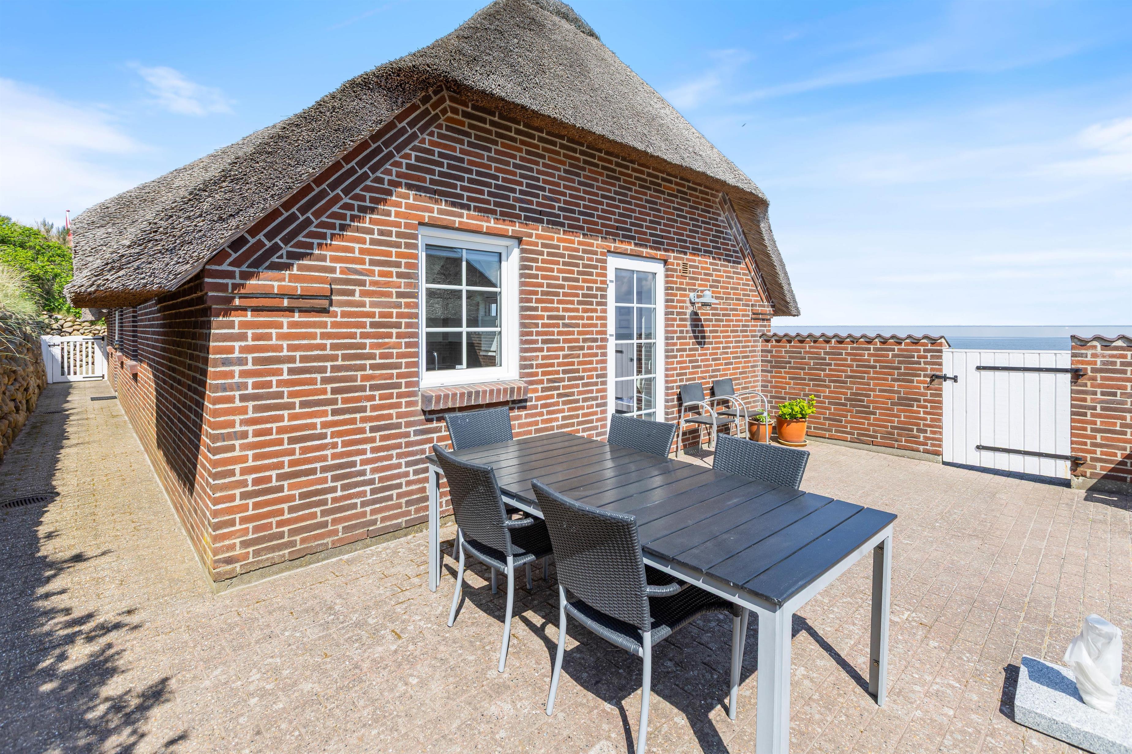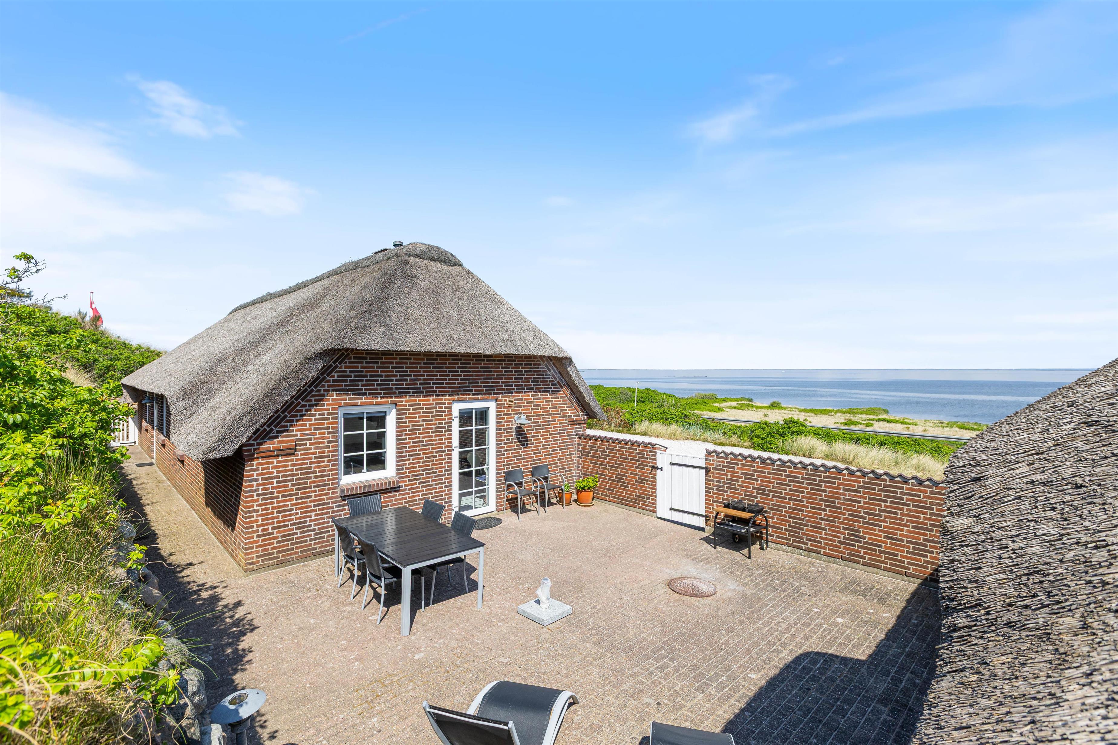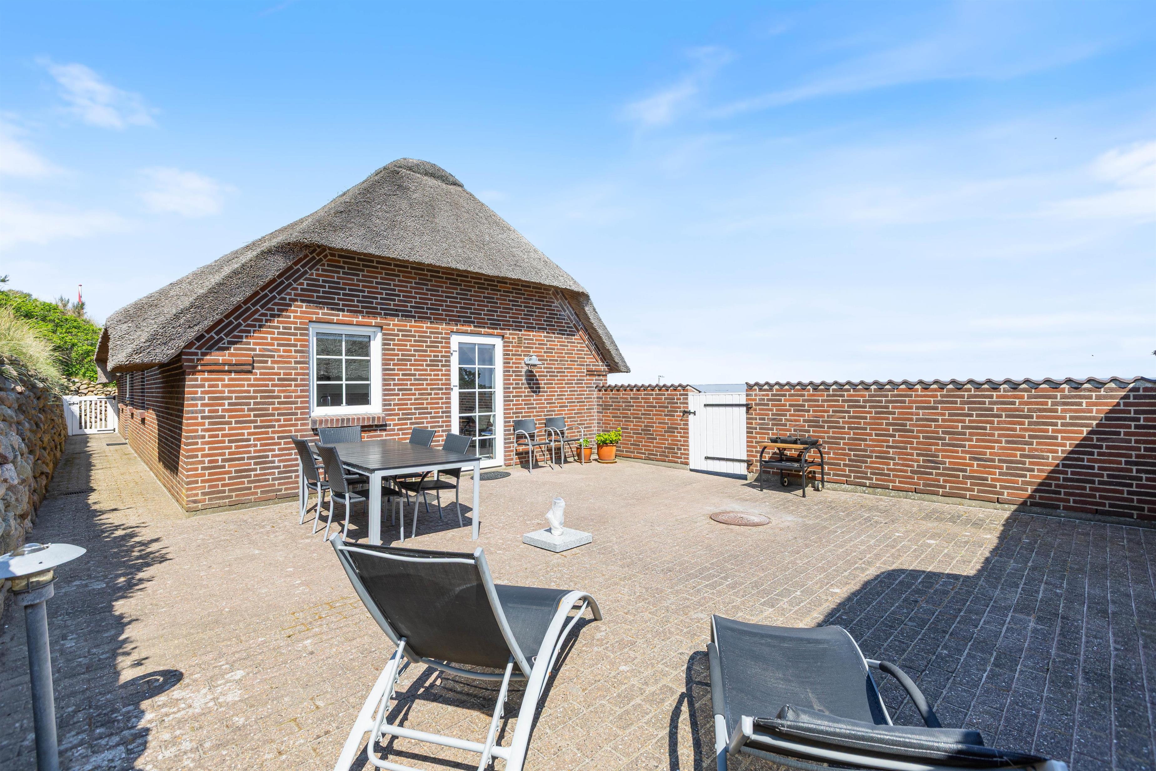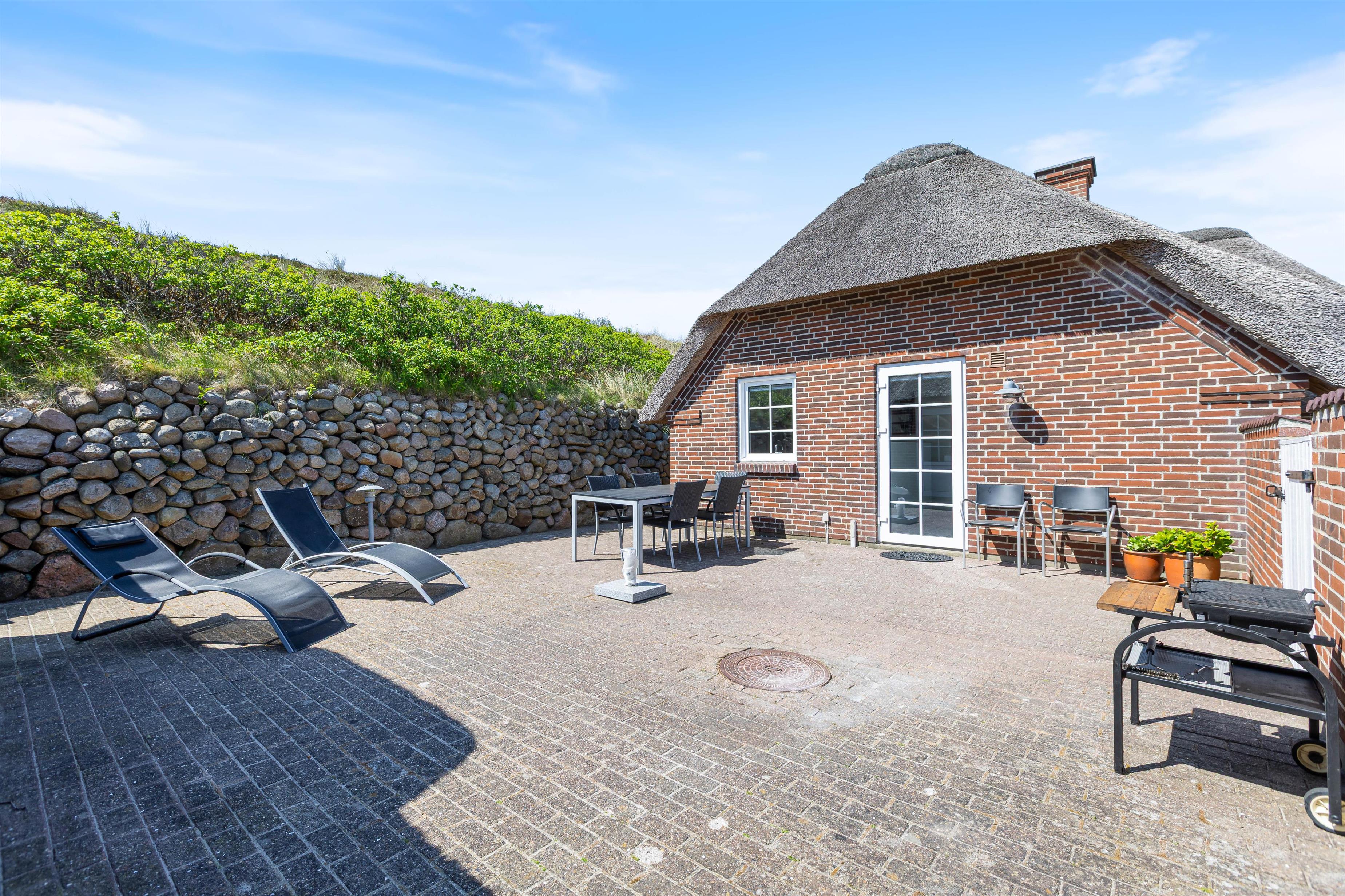 Den lukkede terrasse er primært mellem garagen og huset, og her er man helt for sig selv. Huset er placeret højt, og den store klit mod vest giver både privatliv og læ. Den flotte stensætning op mod klitten viser den detaljeorientering, som er kendetegnende for huset. Foran huset mod øst er der en åben terrasse, som er velegnet til brug i formiddagstimerne.