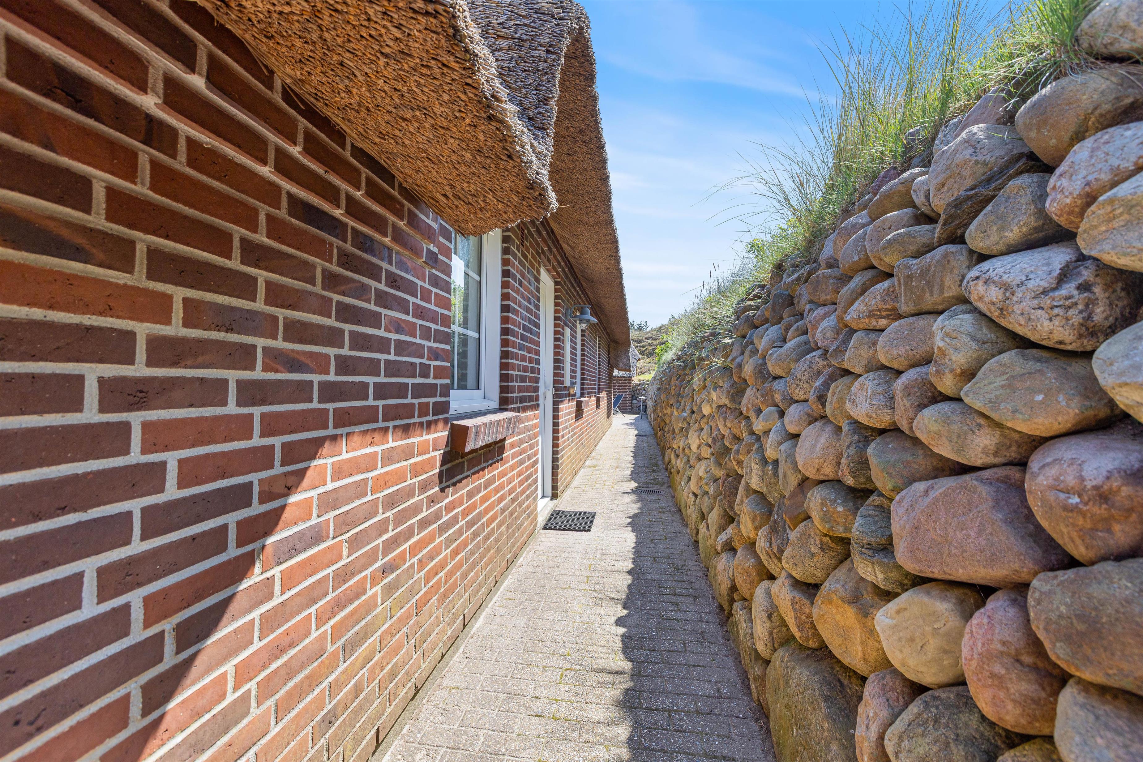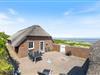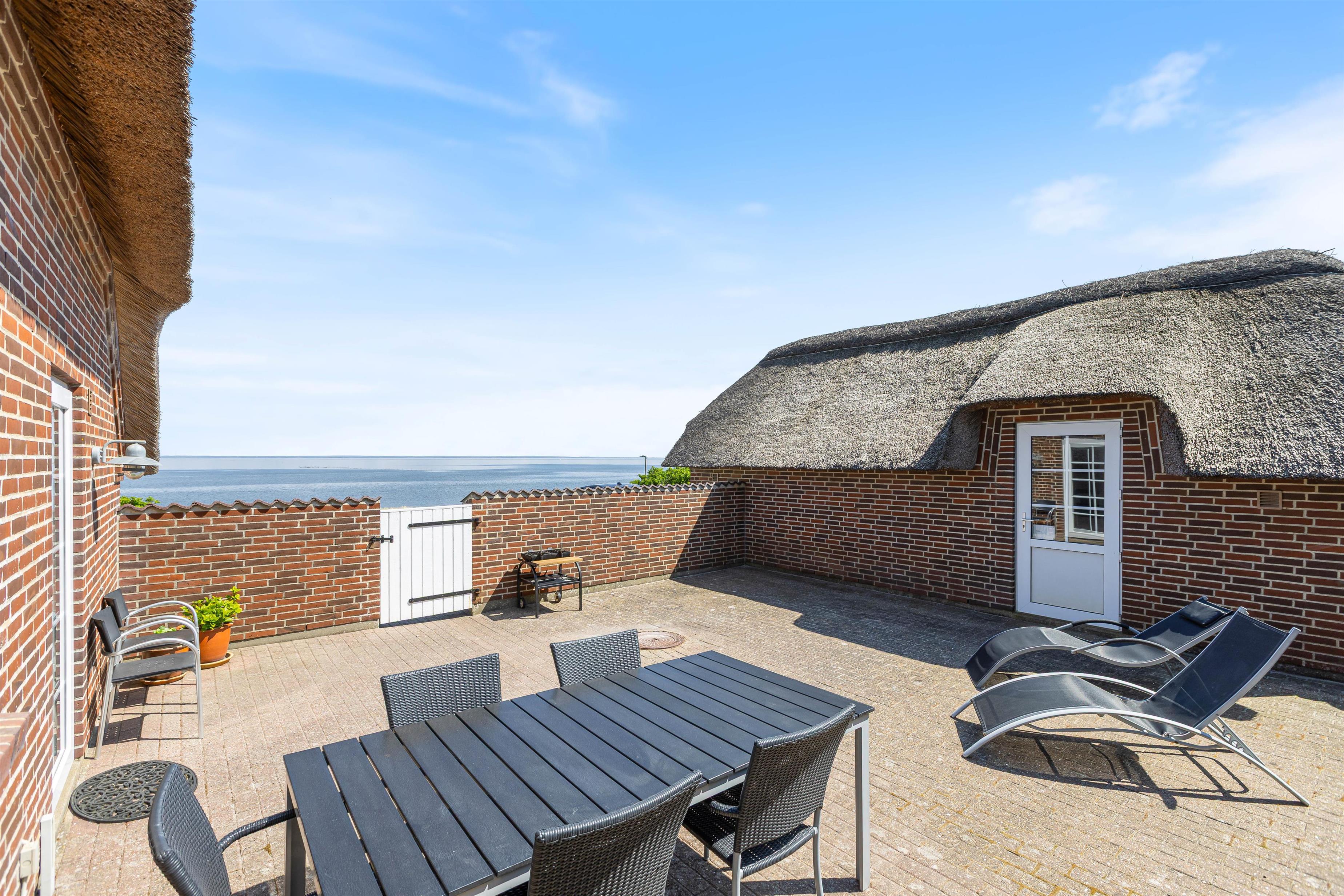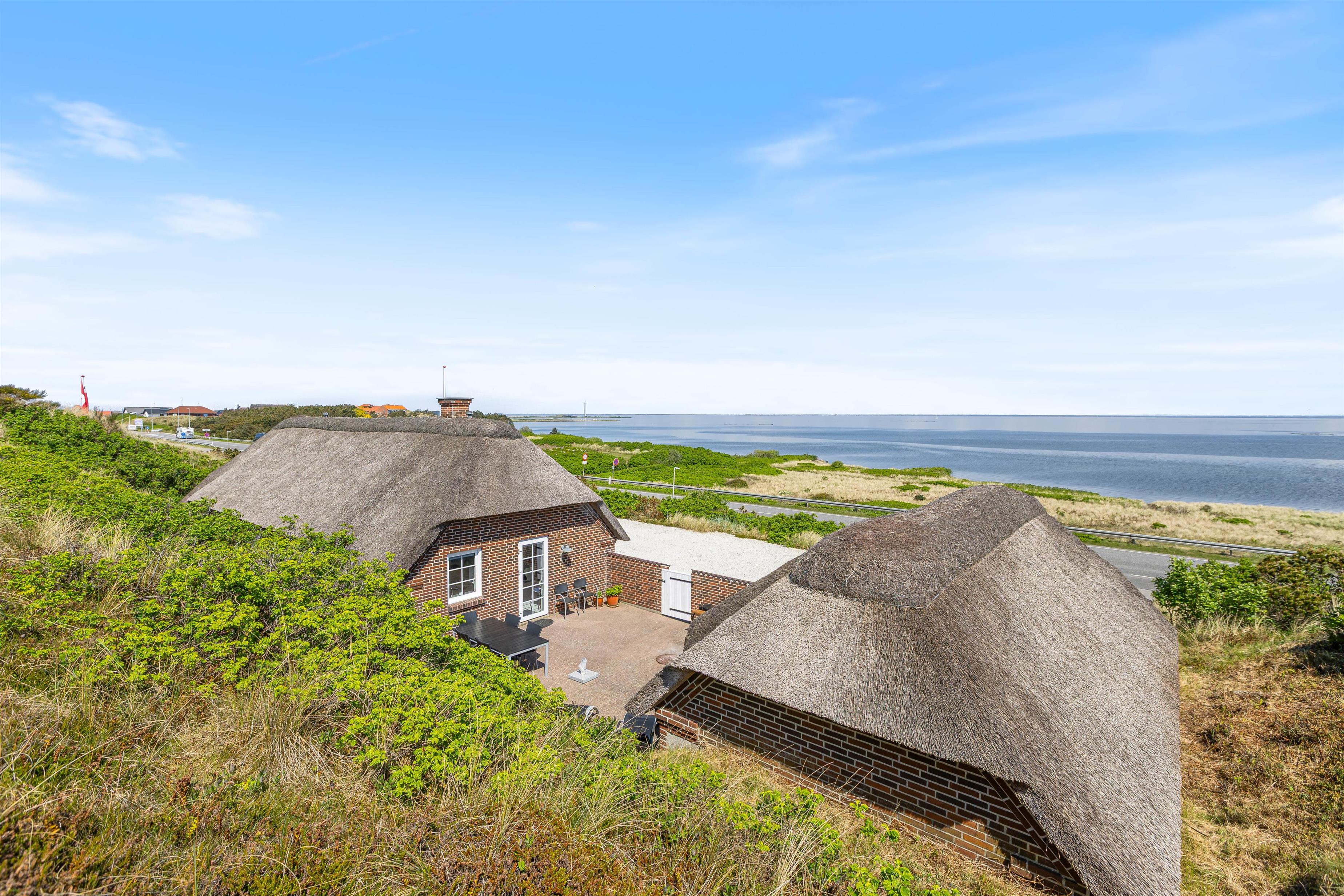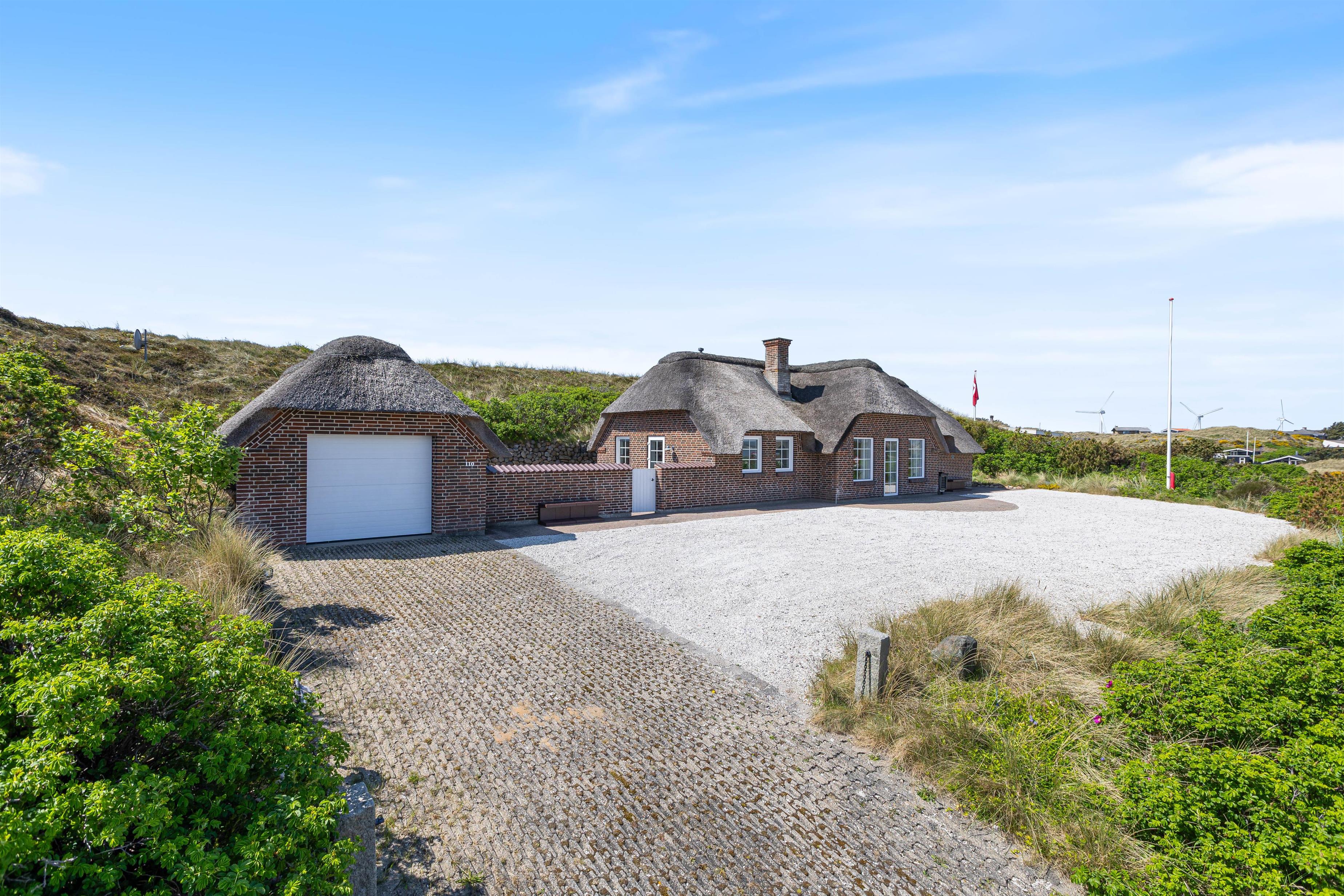 Den lukkede terrasse er primært mellem garagen og huset, og her er man helt for sig selv. Huset er placeret højt, og den store klit mod vest giver både privatliv og læ. Den flotte stensætning op mod klitten viser den detaljeorientering, som er kendetegnende for huset. Foran huset mod øst er der en åben terrasse, som er velegnet til brug i formiddagstimerne.