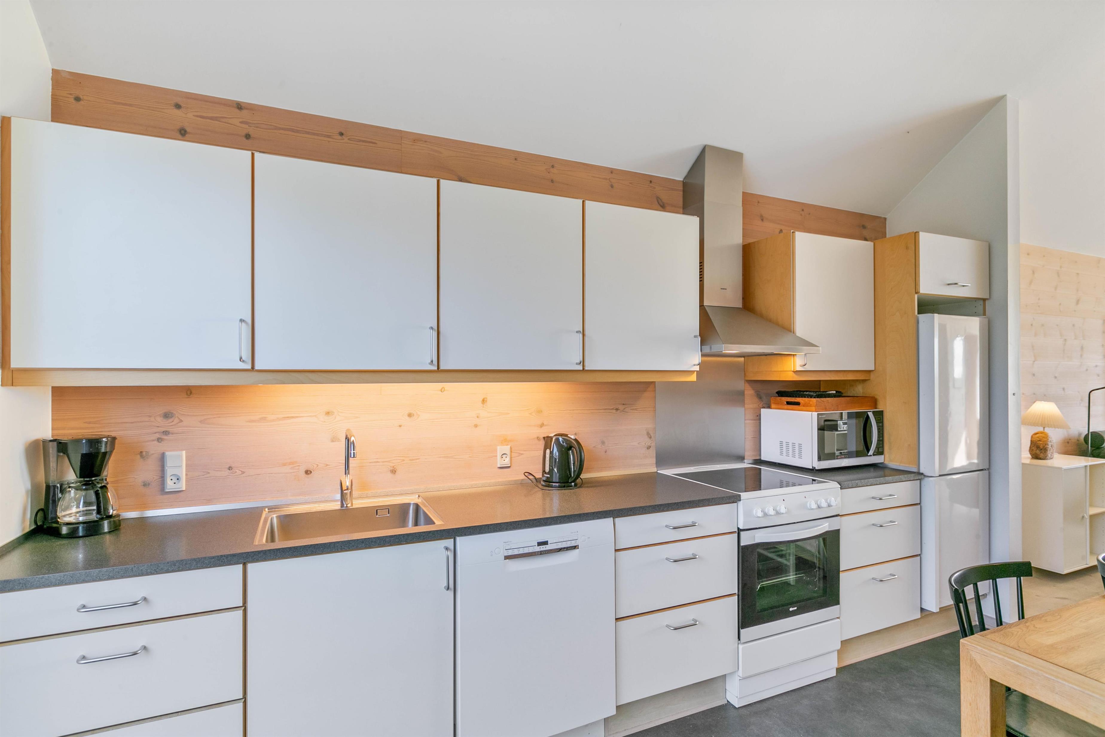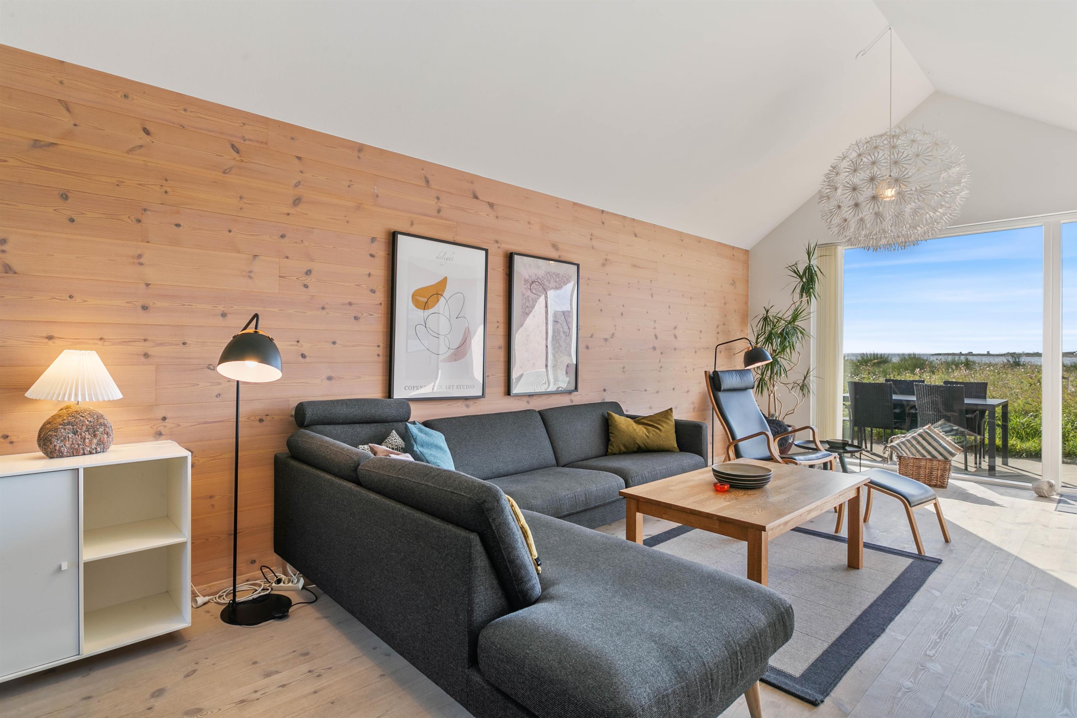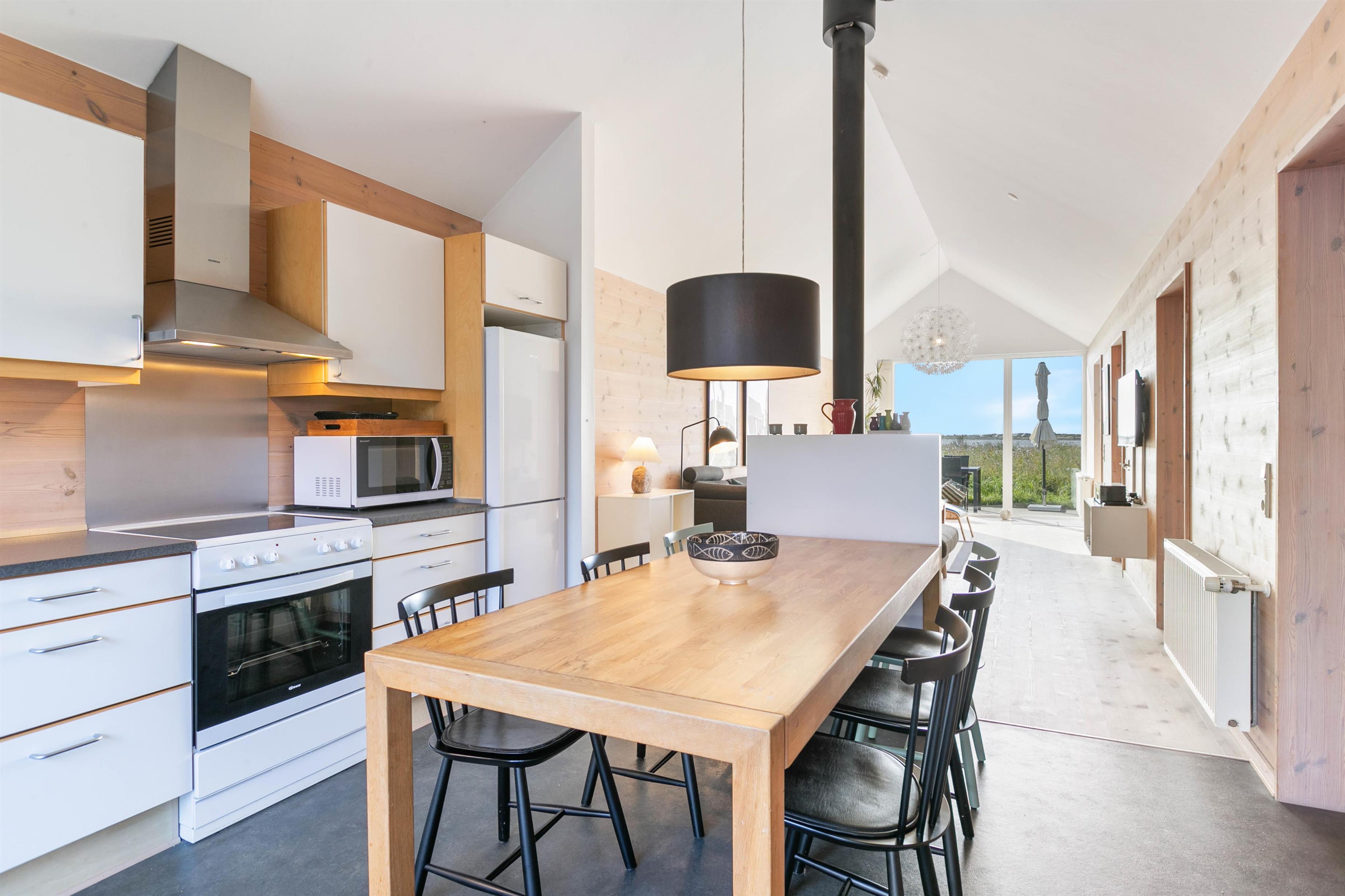 Det dejlige rækkehus er virkelig velindrettet, med store soveværelser og masser af lys og rummelighed. Den smagfulde og magelige møblering bidrager til den perfekte feriestemning. Kryb sammen i sofaen foran brændeovnen, og nyd udsigten til Ringkøbing Fjord på en kold dag, eller find en hyggelig familiefilm, som I kan streame via husets Chromecast. På en sommerdag kan du hygge dig på terrassen med et glas koldt hvidvin eller nyde en herlig friskfanget middag tilberedt på grillen i den lukkede gårdhave mellem huset og garagen.