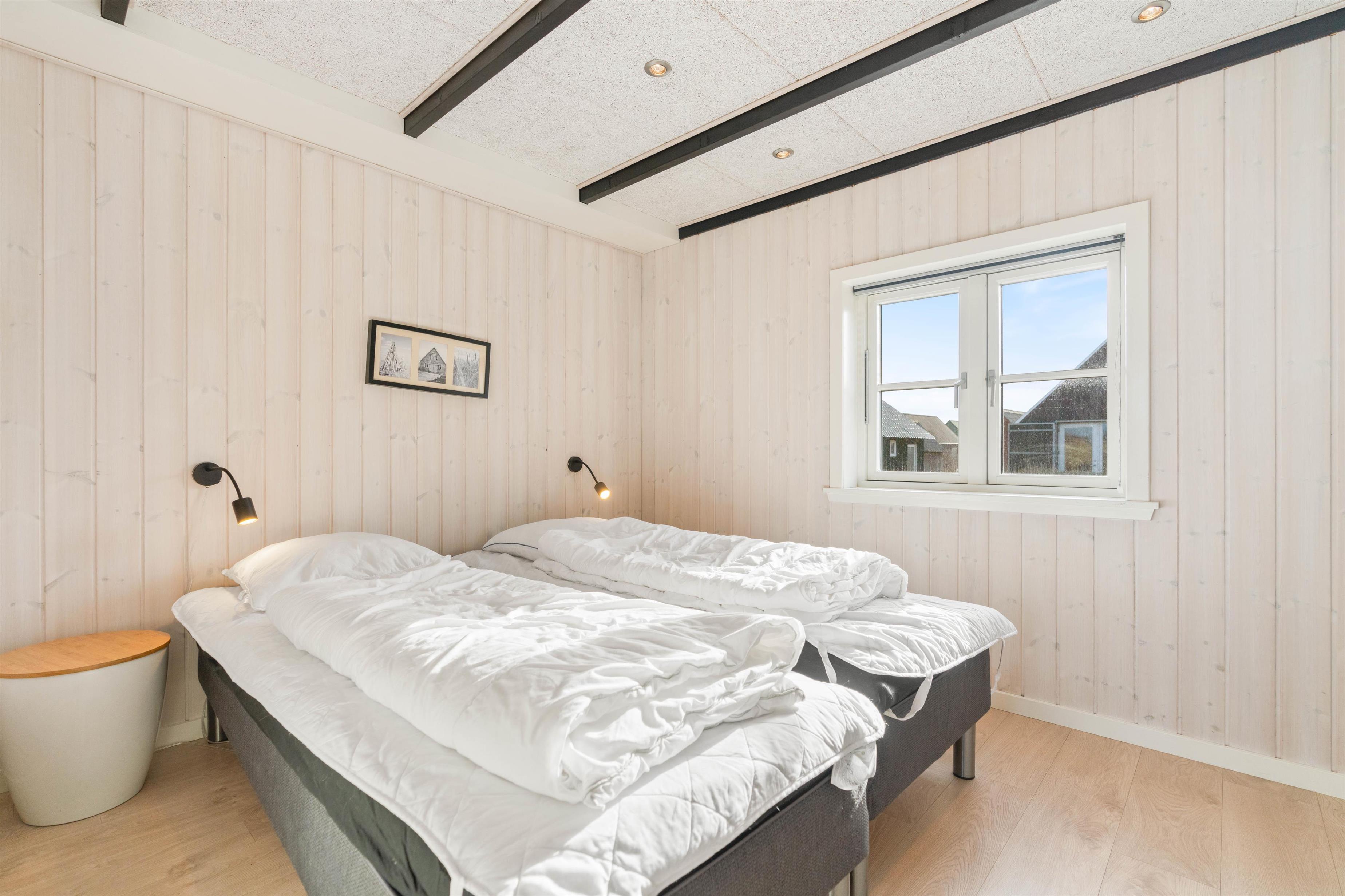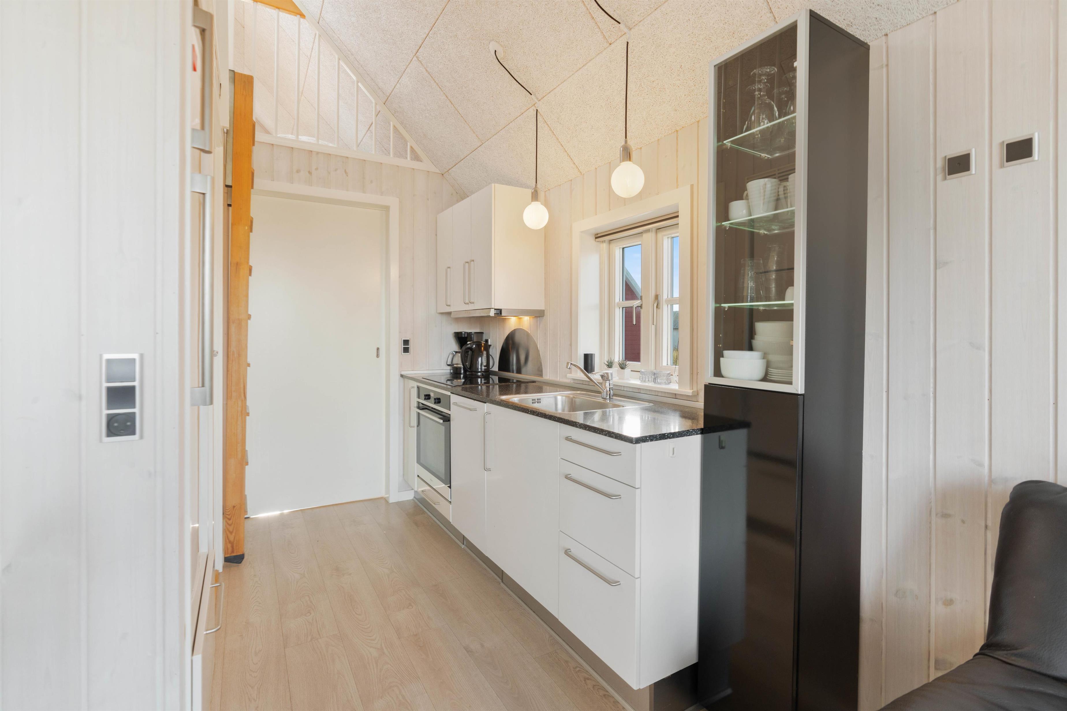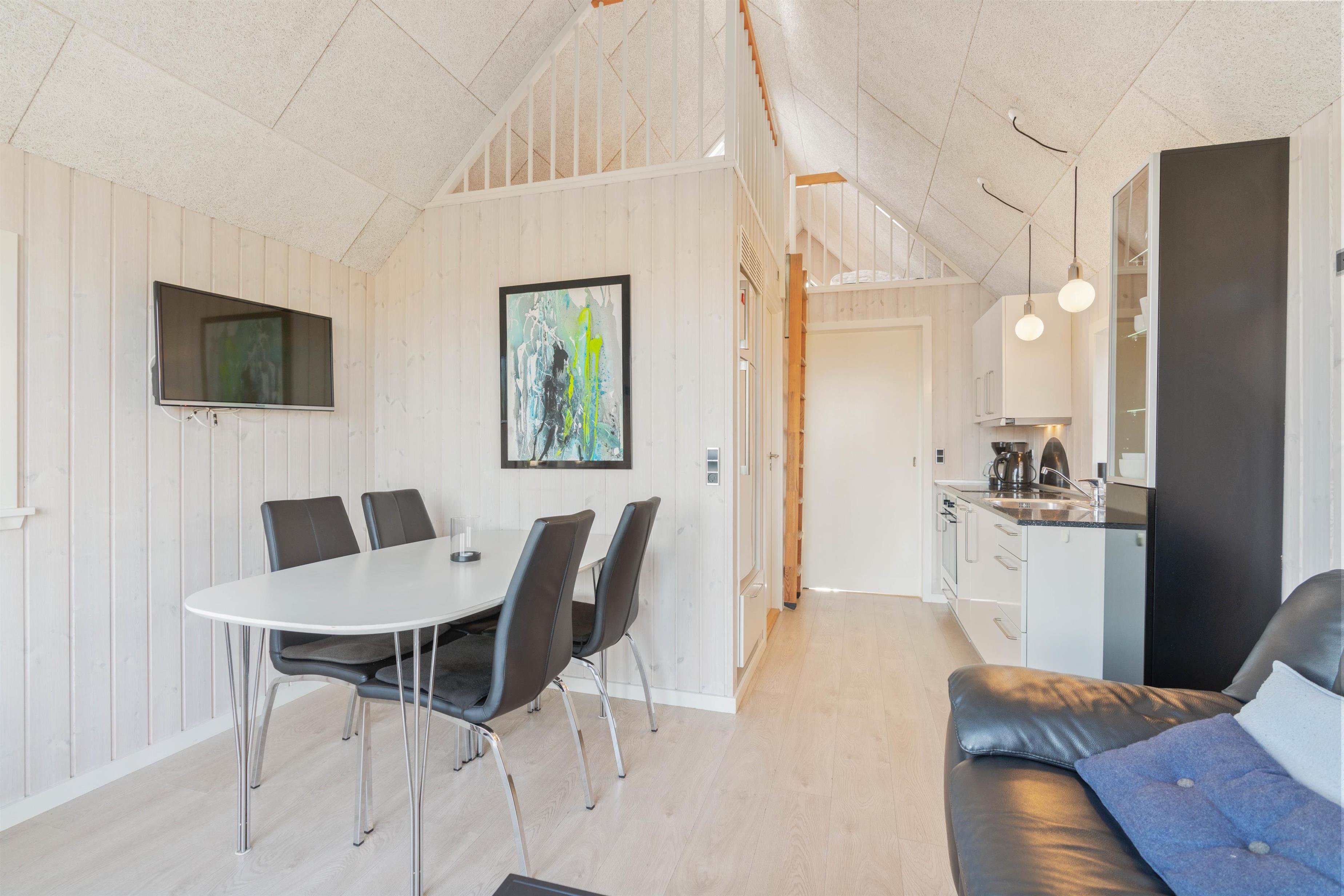 Den hyggelige og moderne hytte er indrettet med et godt soveværelse med dobbeltseng samt 2 sovepladser på hemsen. Hytten har også et pænt og funktionelt badeværelse med bruser. Praktisk indrettet køkken med opvaskemaskine i åben forbindelse med stuen. Stuen er indrettet med gode møbler og fladskærm. Fra køkkenalrummet er der udgang til den hyggeliste lille terrasse, hvor I kan nyde solen og eventuelt de friskfangede fisk, efter de har været en tur på grillen.