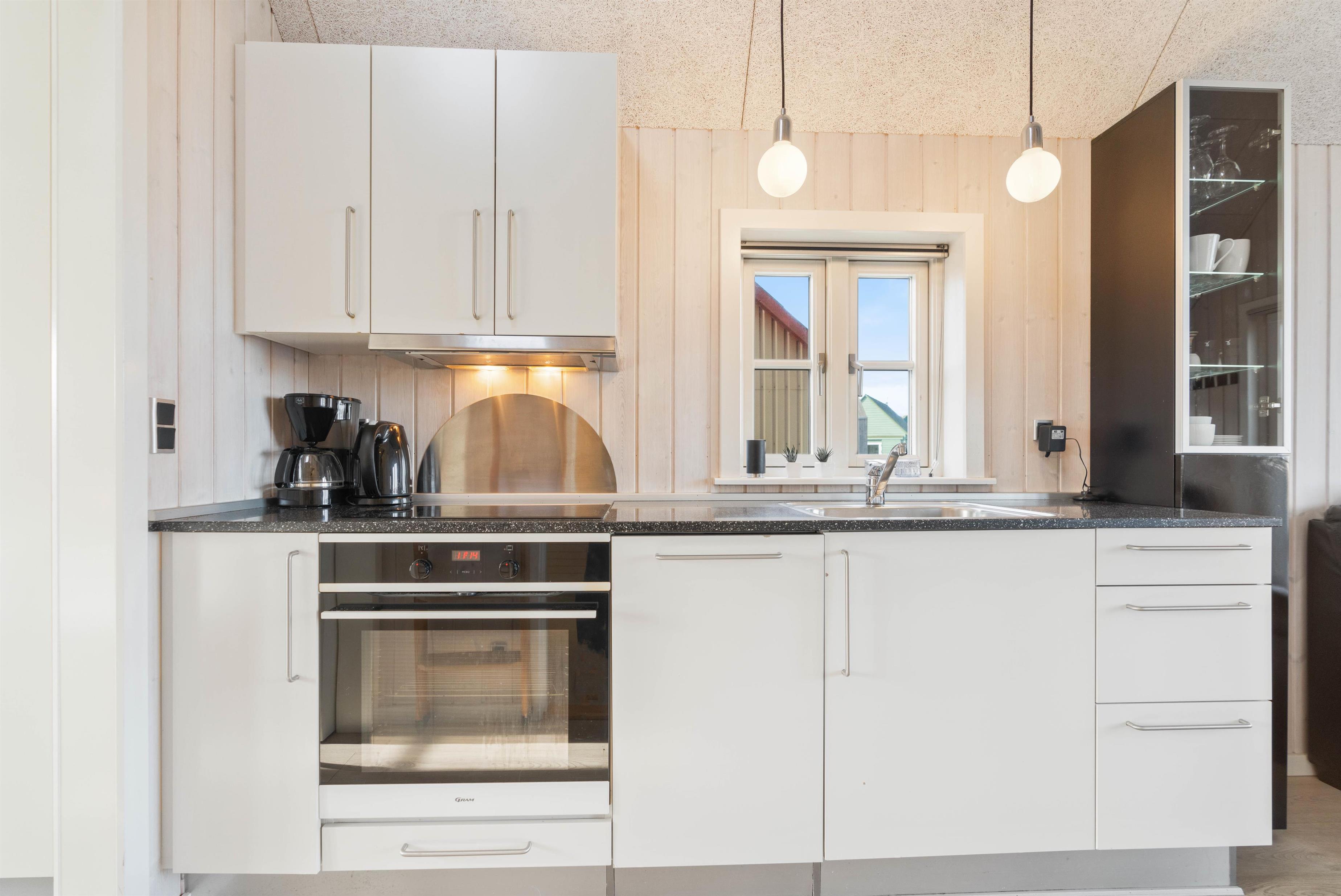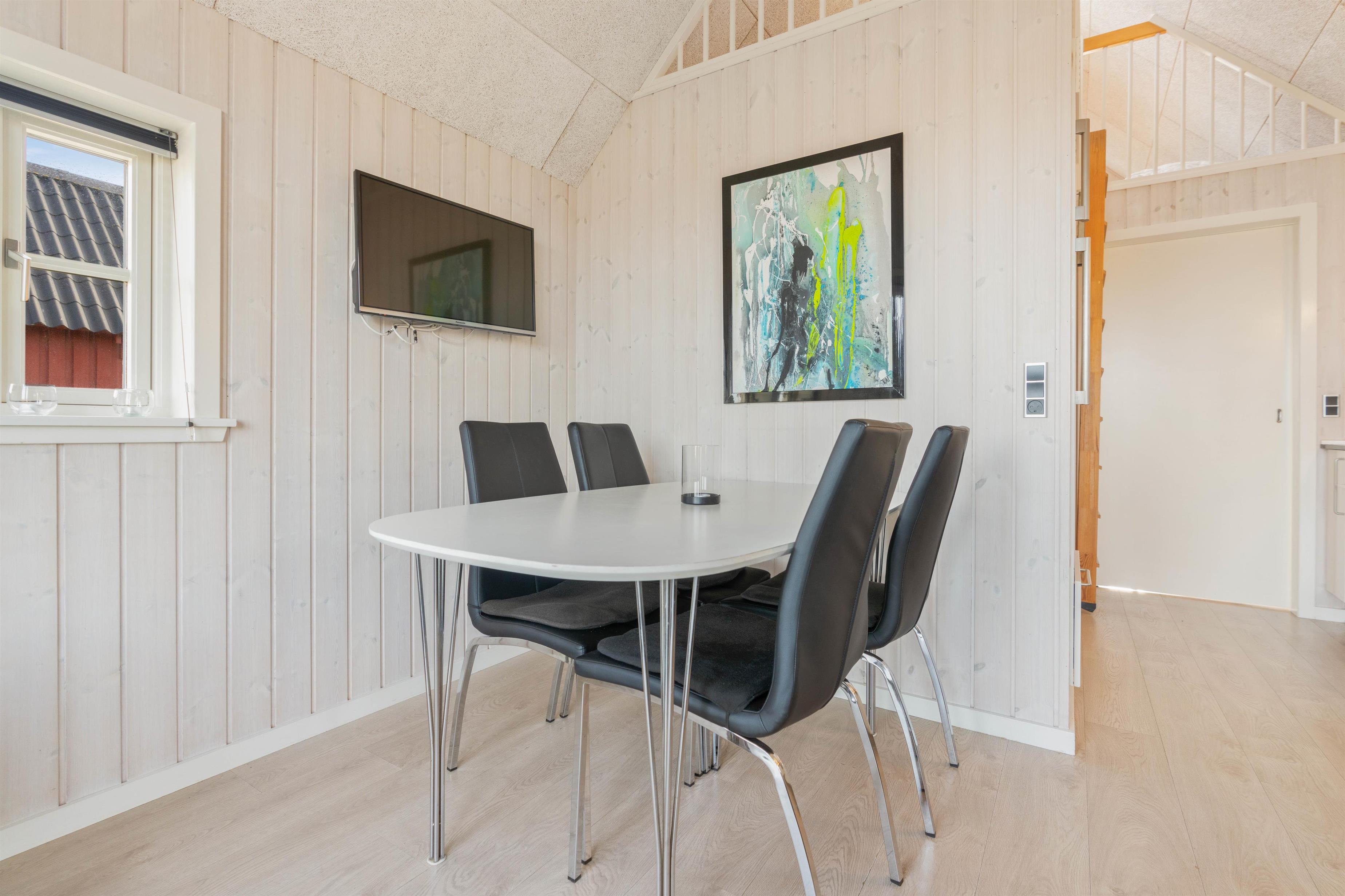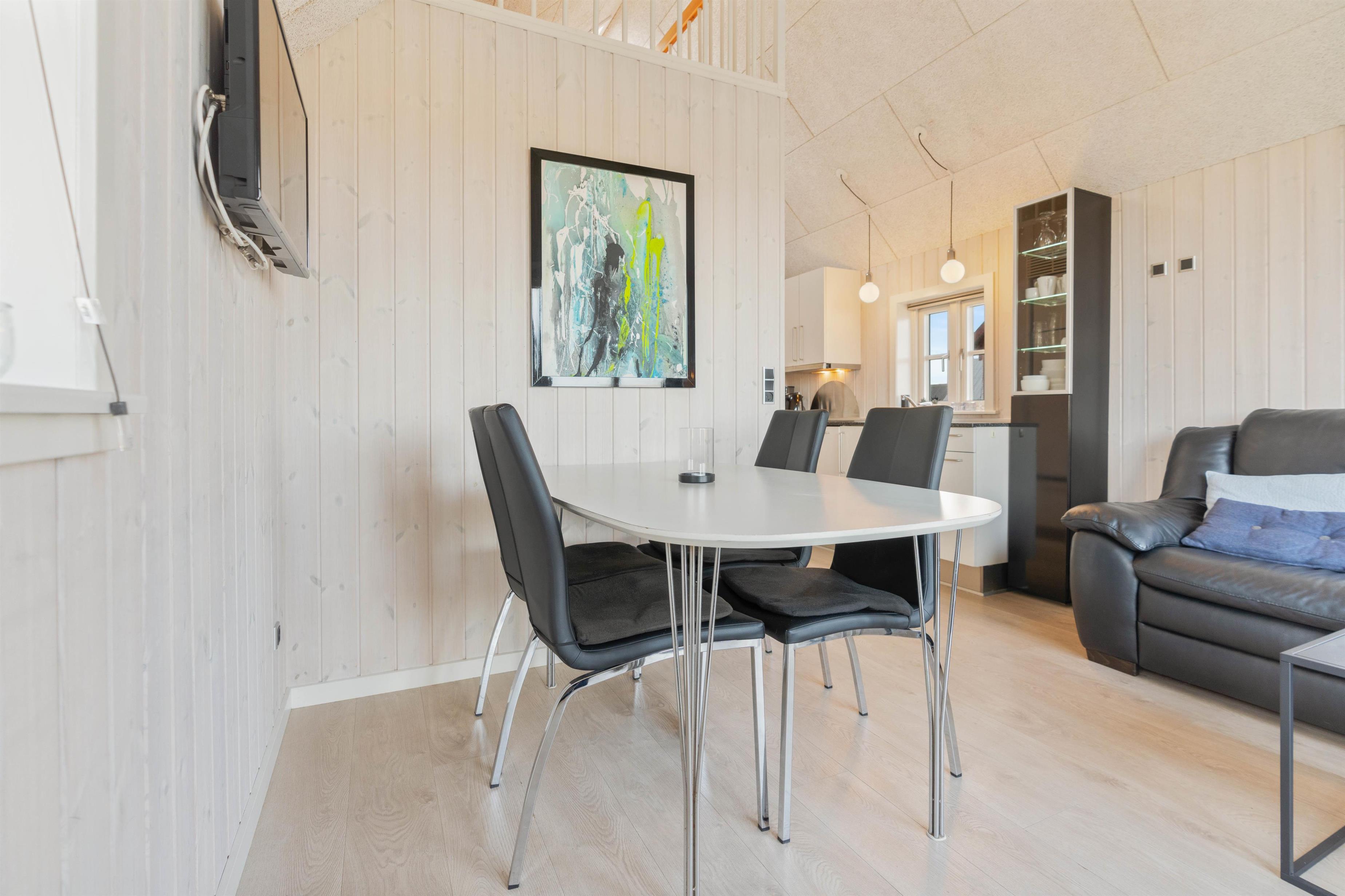 Den hyggelige og moderne hytte er indrettet med et godt soveværelse med dobbeltseng samt 2 sovepladser på hemsen. Hytten har også et pænt og funktionelt badeværelse med bruser. Praktisk indrettet køkken med opvaskemaskine i åben forbindelse med stuen. Stuen er indrettet med gode møbler og fladskærm. Fra køkkenalrummet er der udgang til den hyggeliste lille terrasse, hvor I kan nyde solen og eventuelt de friskfangede fisk, efter de har været en tur på grillen.