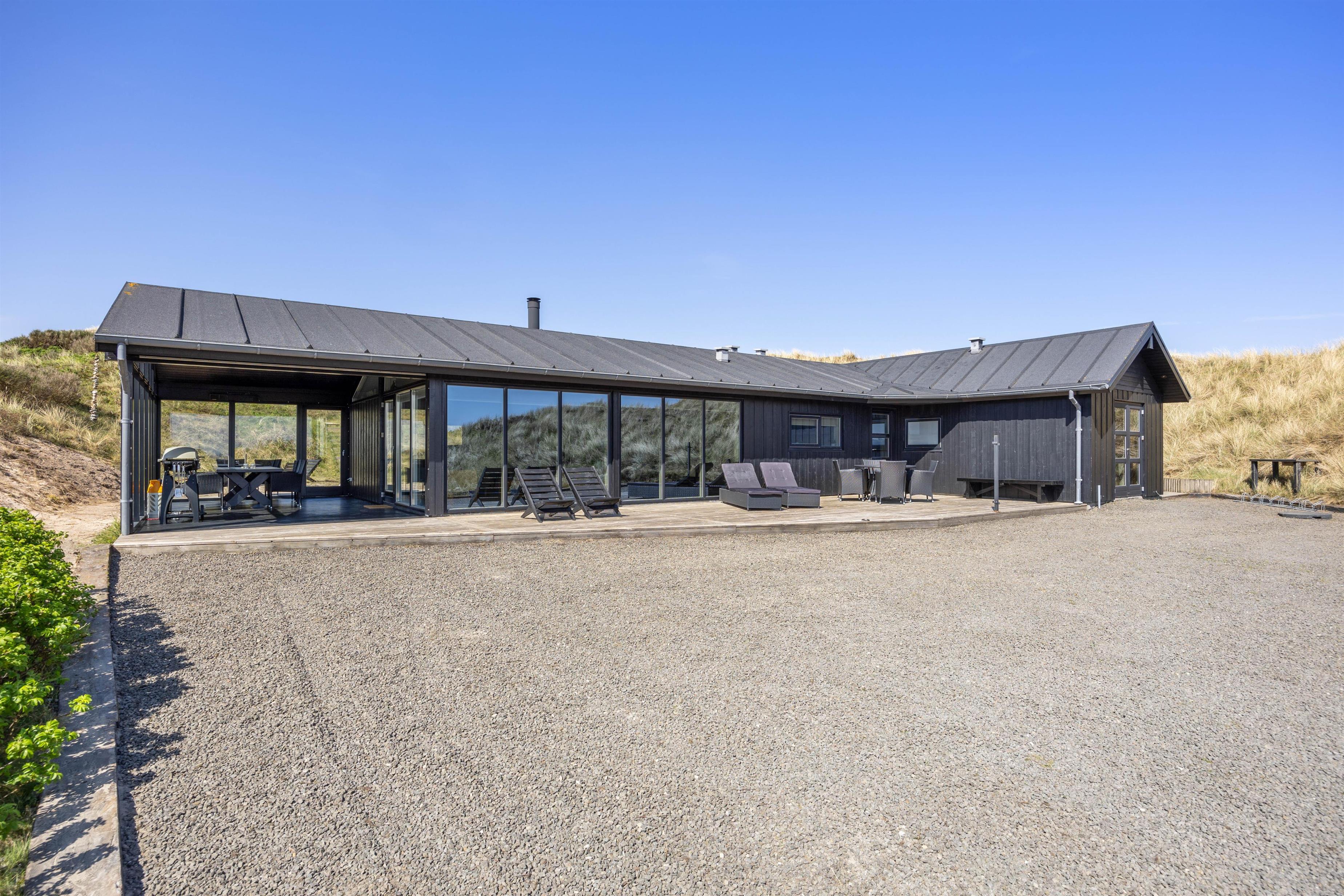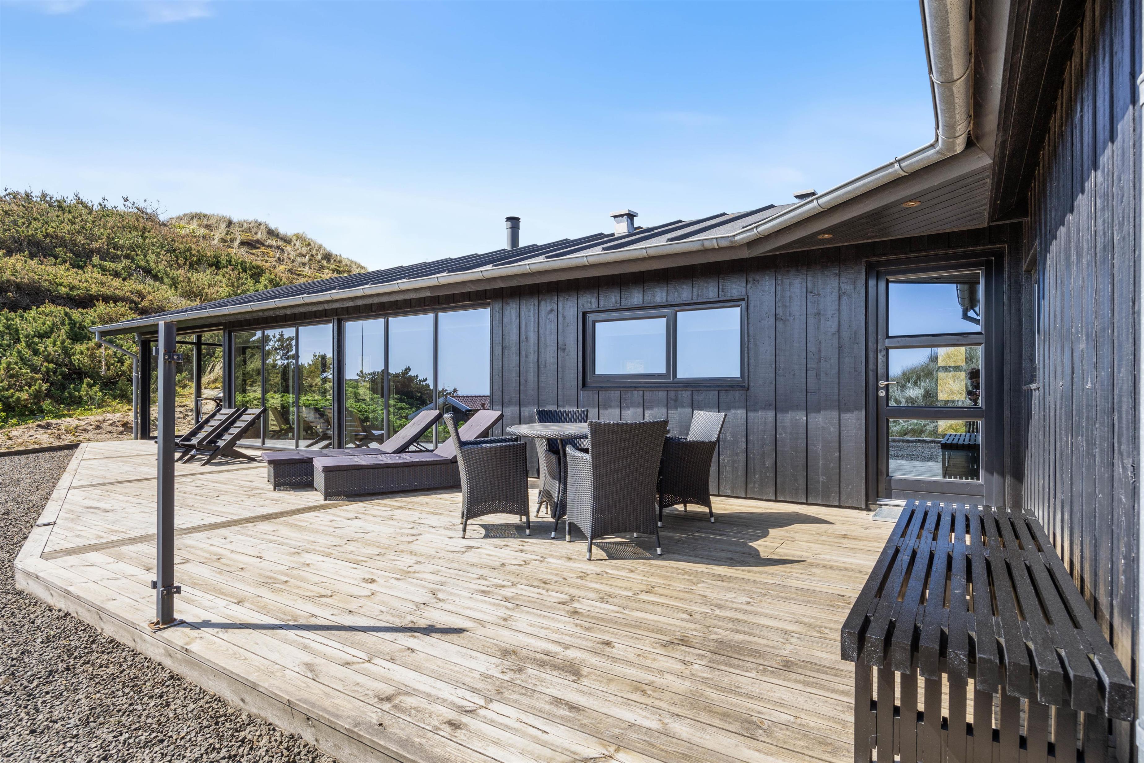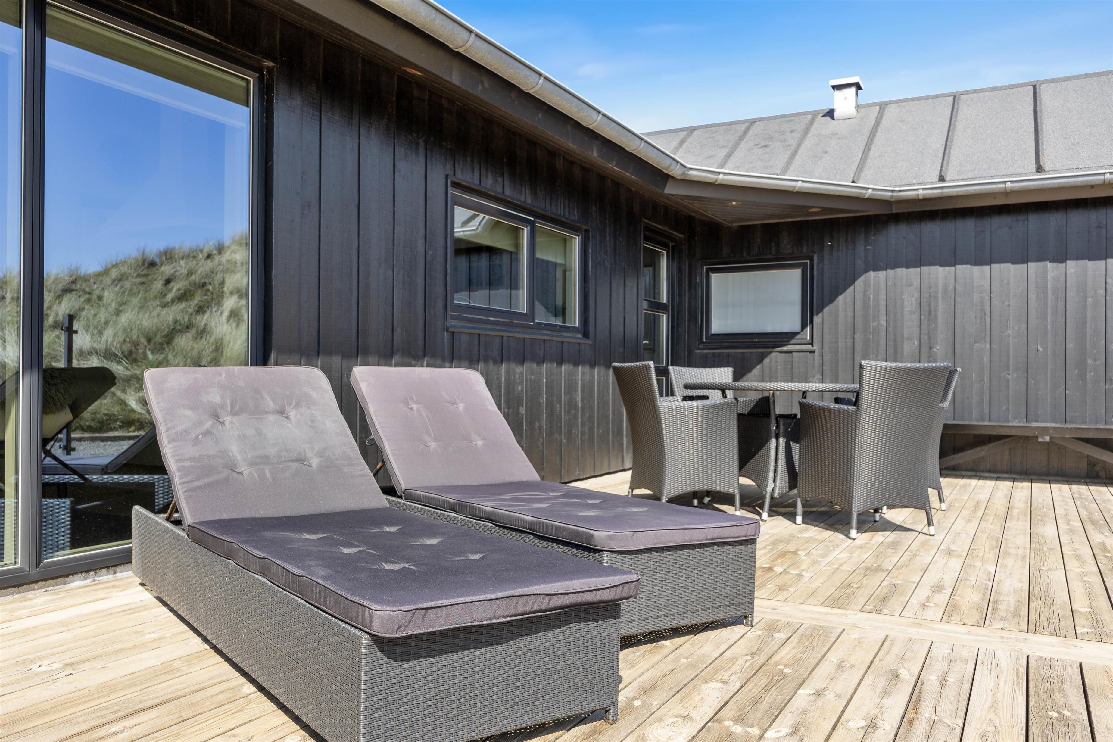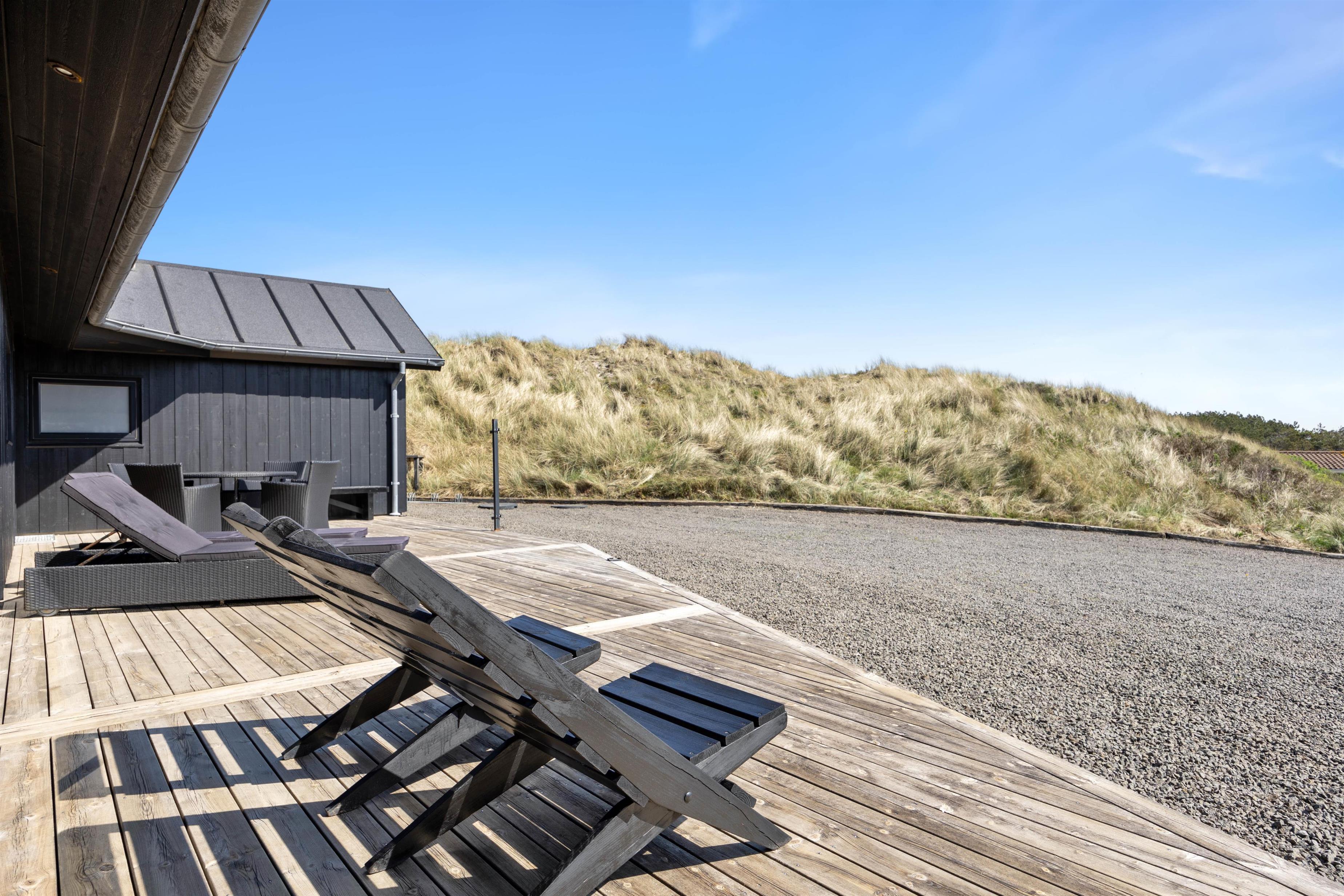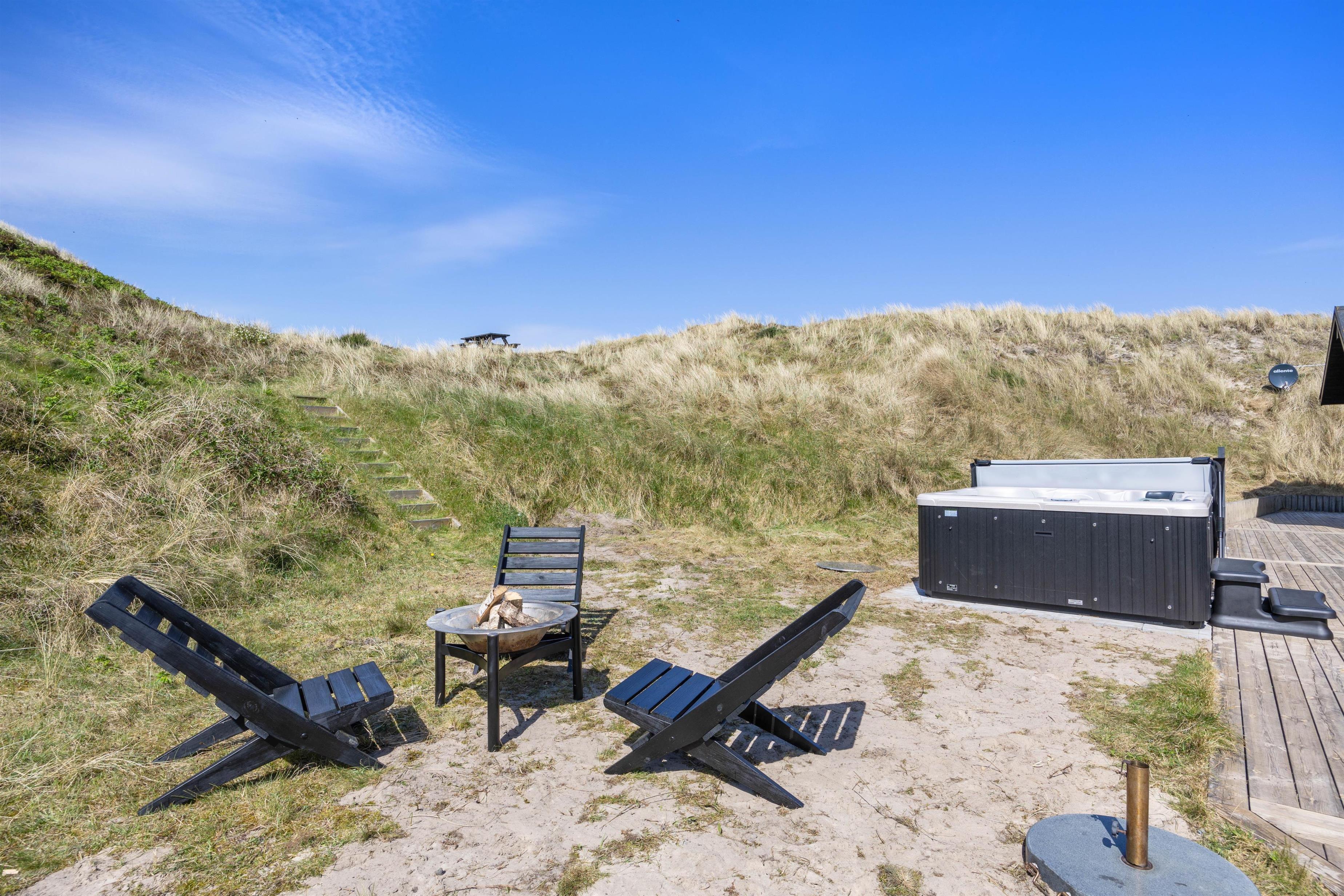 På den 10725 m2 klitgrund finder du en afskærmet og overdækket terrasse med både havemøbler, solvogne, udespa og grill. Her vil det altså være perfekt at tilbringe tiden på de lune sommerdage og -aftener. Når det bliver lidt koldere, kan I tænde for terrassevarmeren og fortsætte jeres aften her, for terrassen er endda spotbelyst.