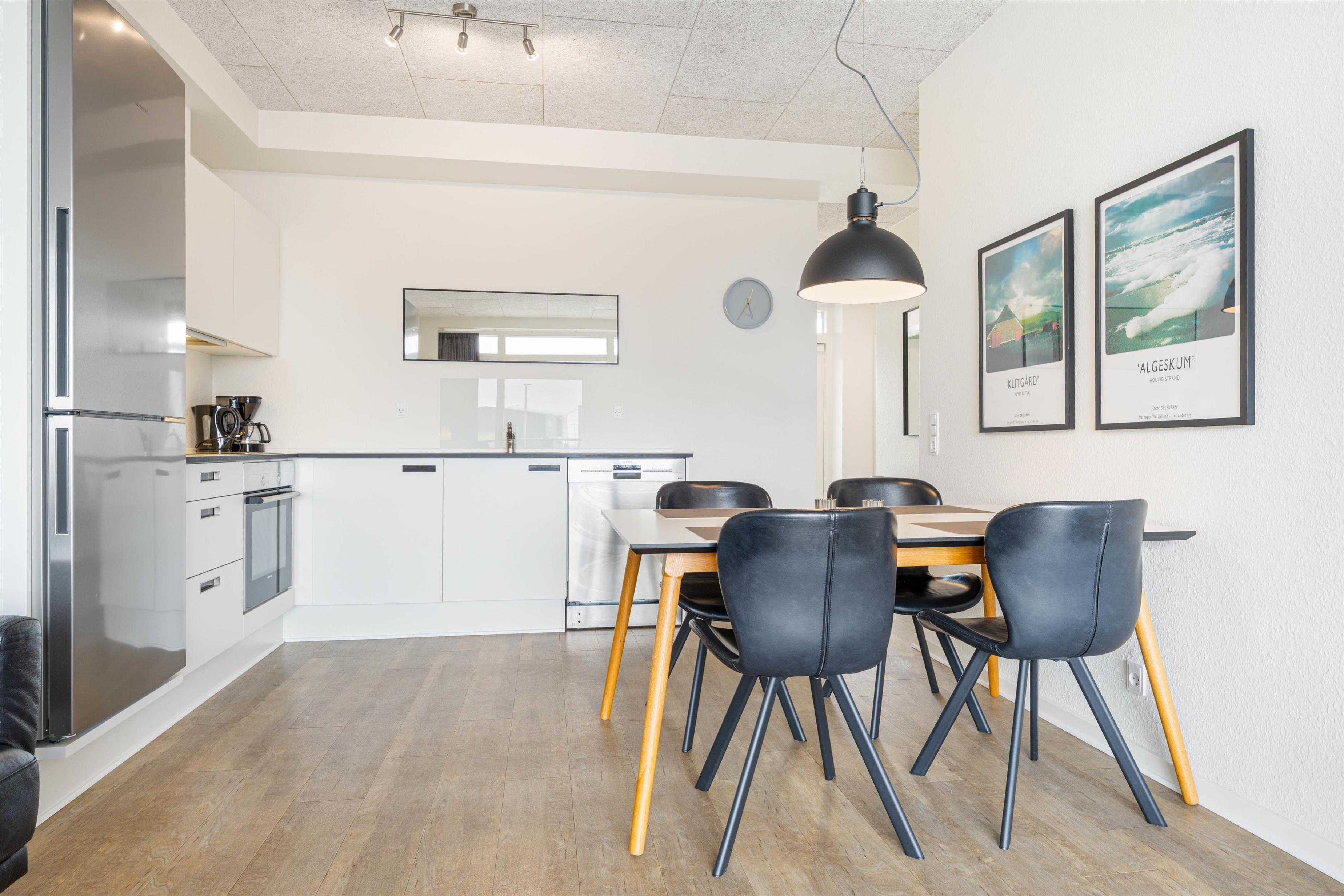 Den hyggelige køkken/stue afdeling indbyder til familiehygge. Her kan alle samles og være tæt, mens maden tilberedes i det dejlige, lyse køkken eller familien får lyst til et spil omkring spisebordet. I køkkenet er der desuden opvaskemaskine, køleskab og fryser.