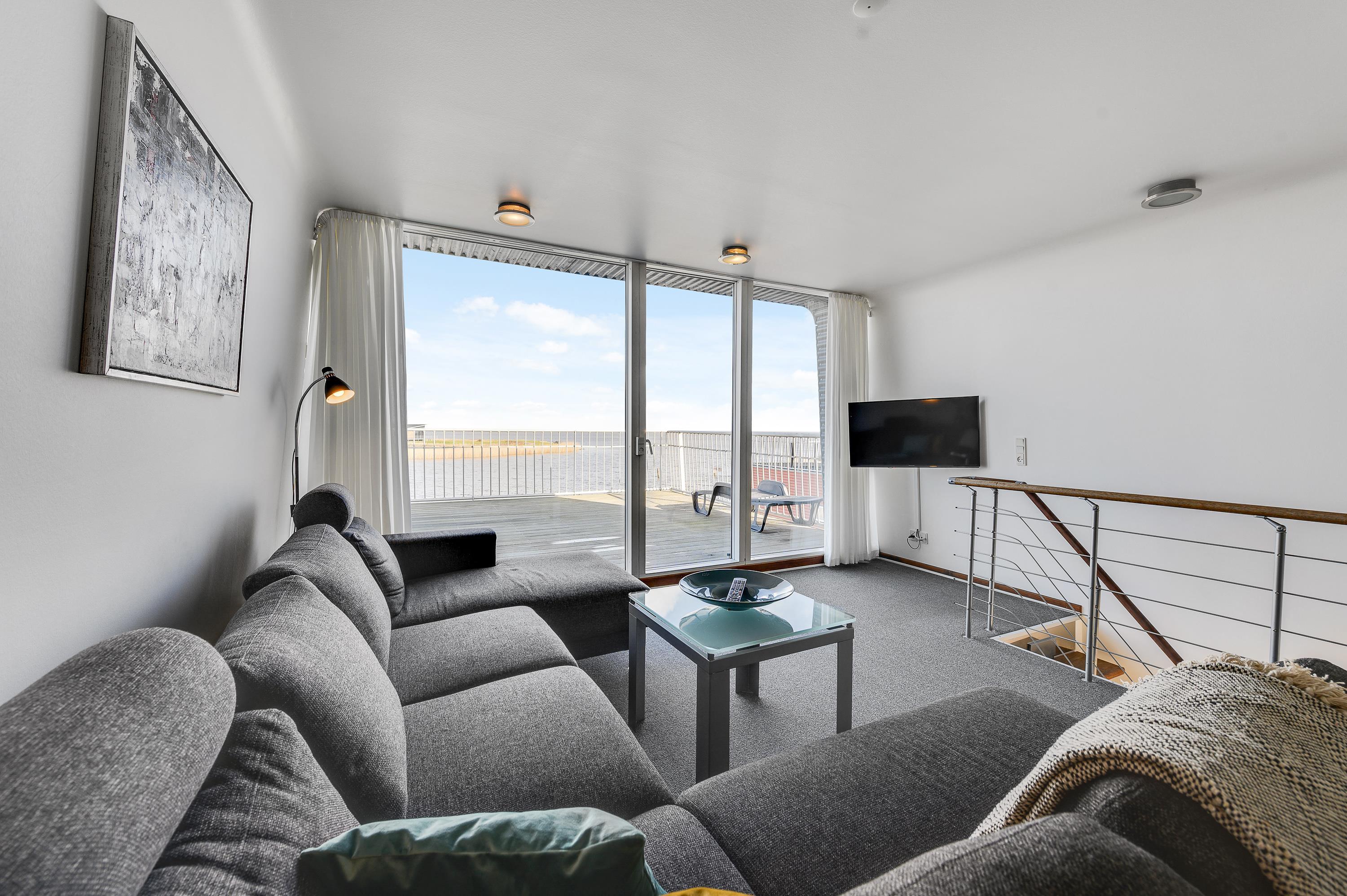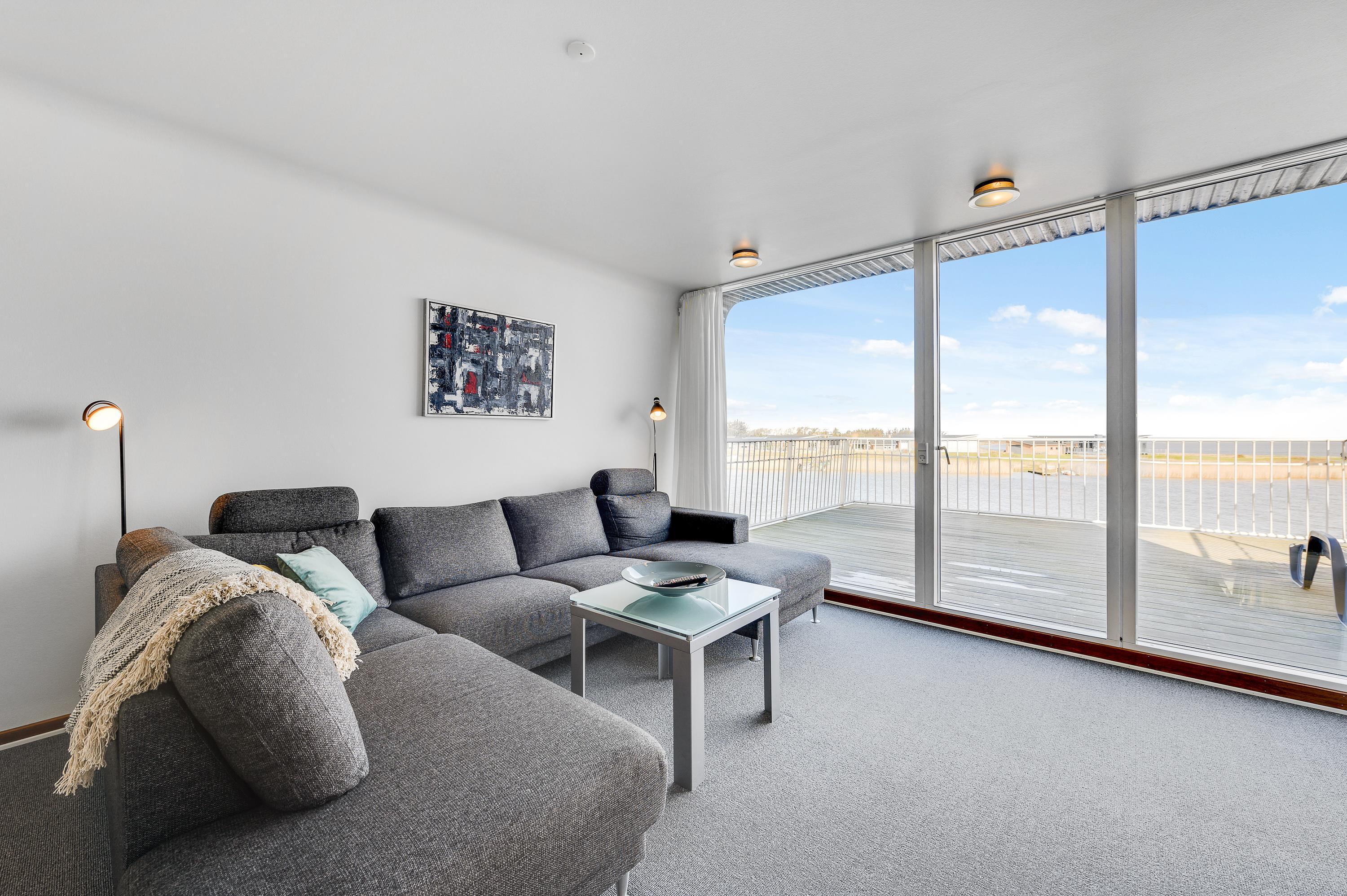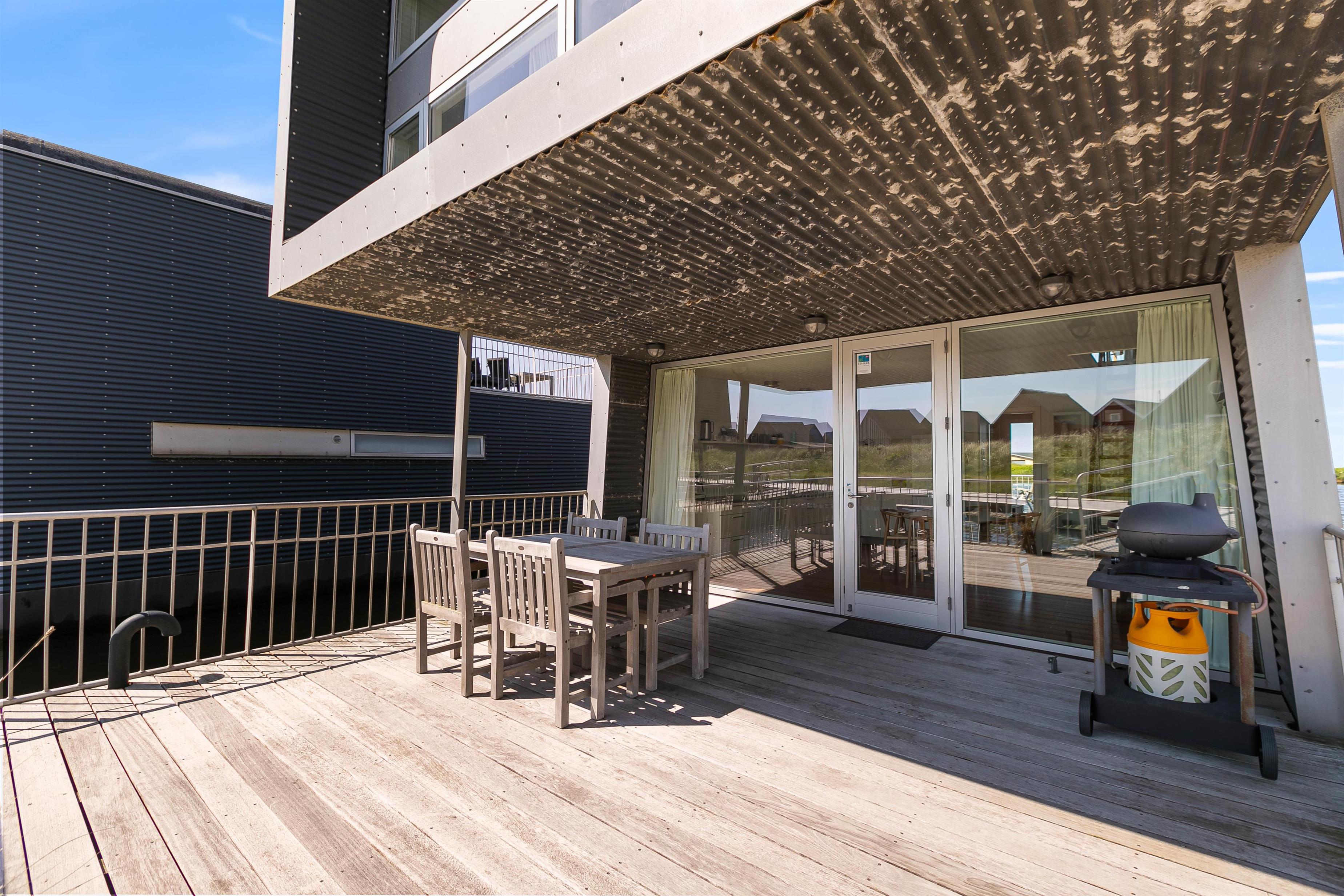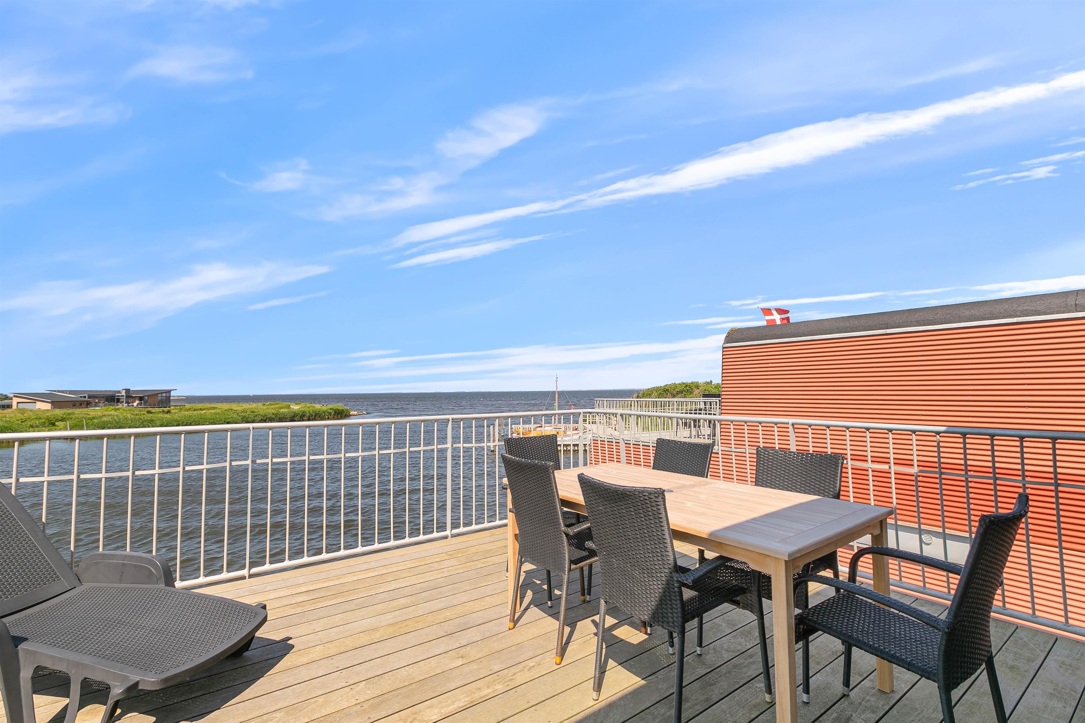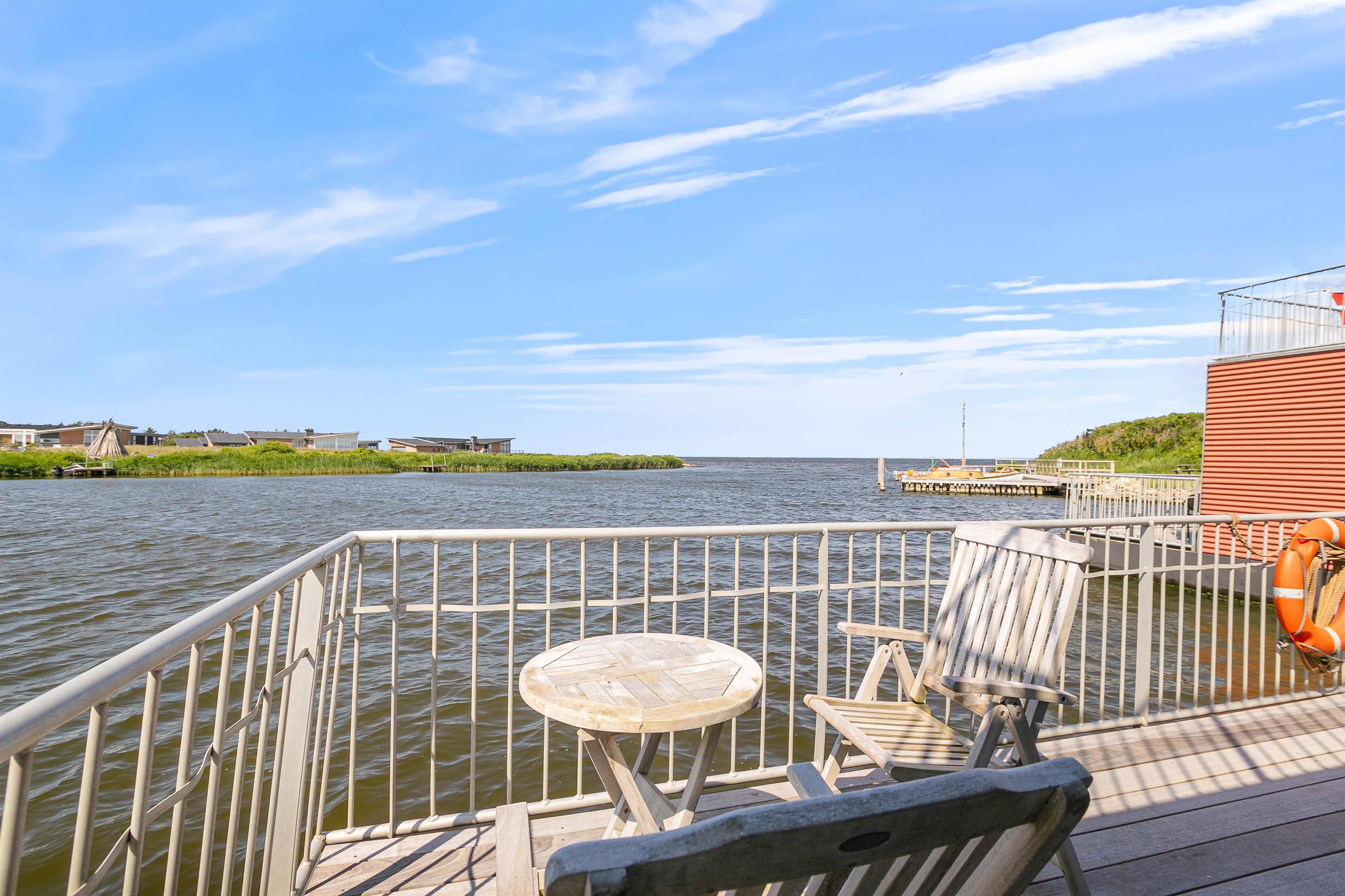 Der er 2 skønne terrasser på husbåden. En sydvendt i forbindelse med indgangspartiet, og en lukket terrasse på 1. sal med enestående panoramaudsigt over byen, havnen og Ringkøbing Fjord. Slå jer ned i havemøblerne eller på en solvogn og nyd denne udsigt med en god kop kaffe.