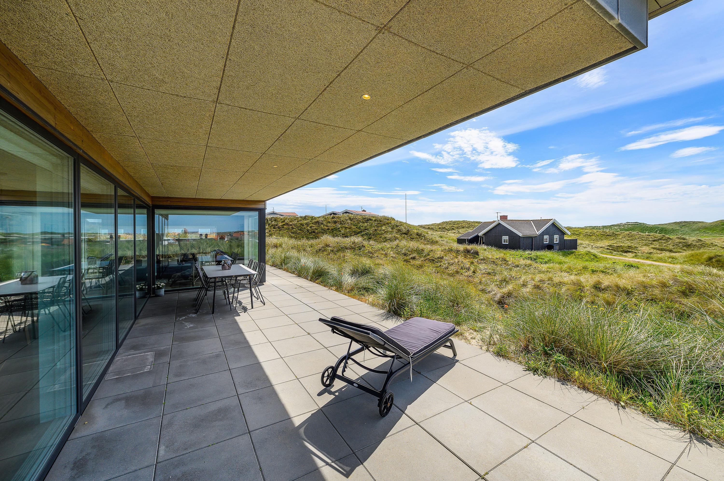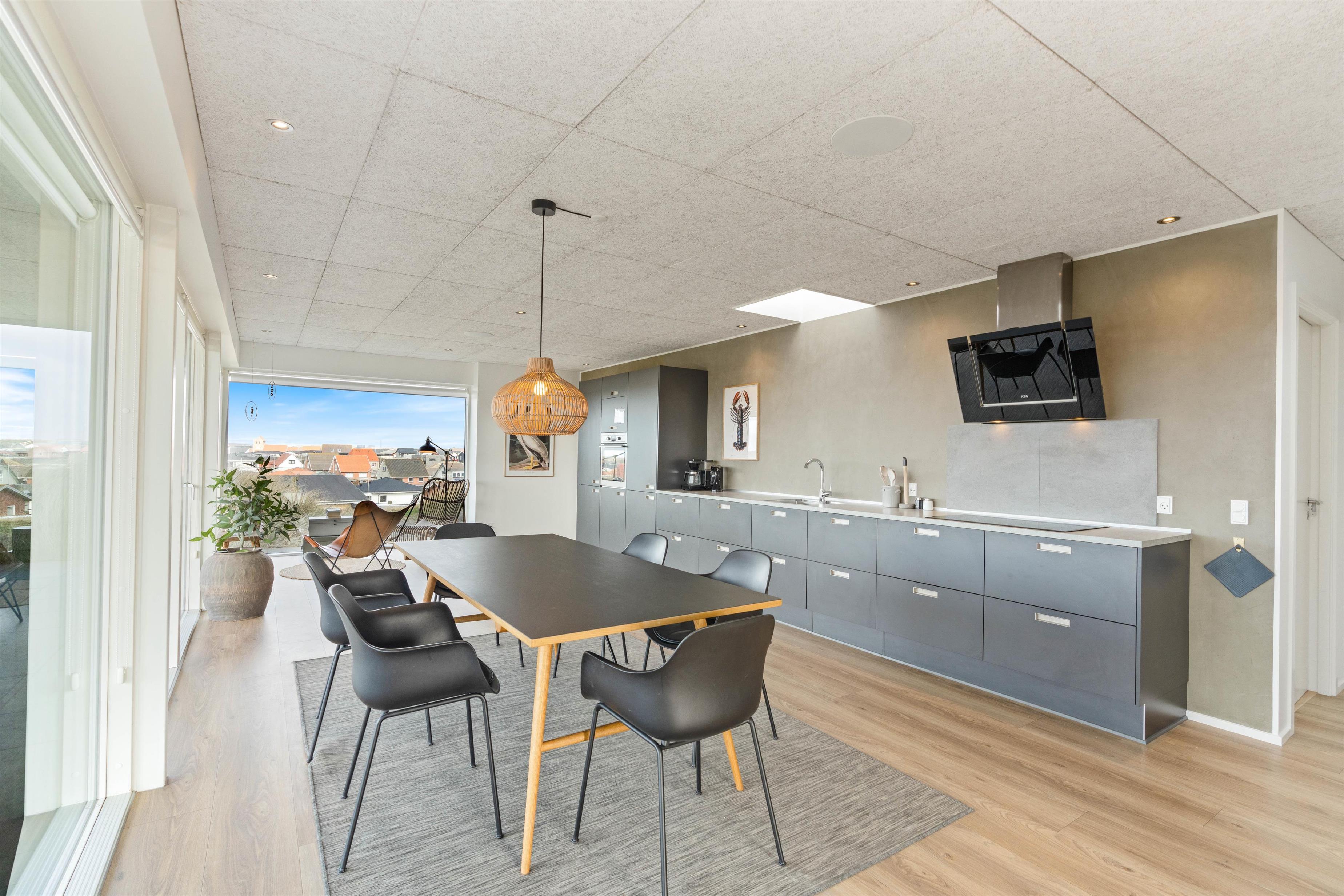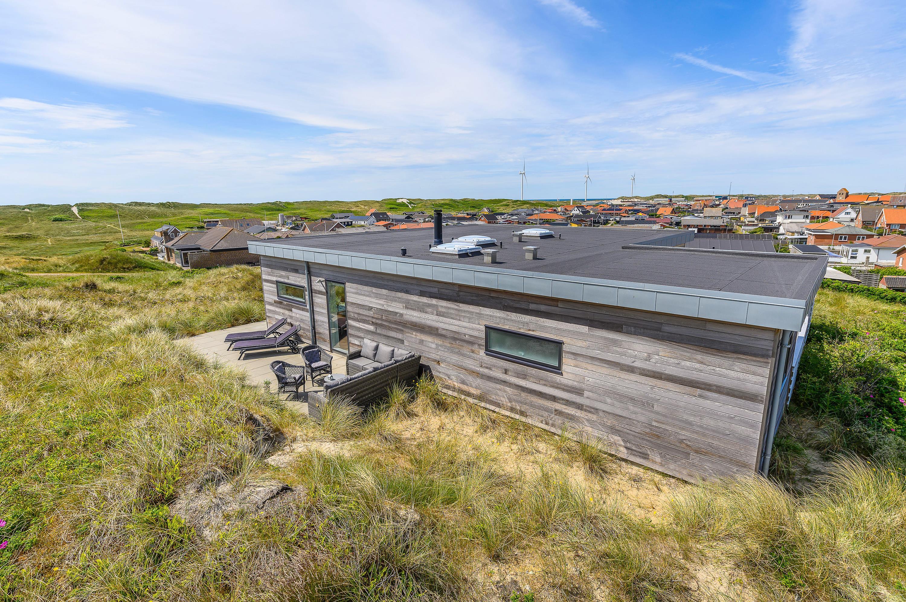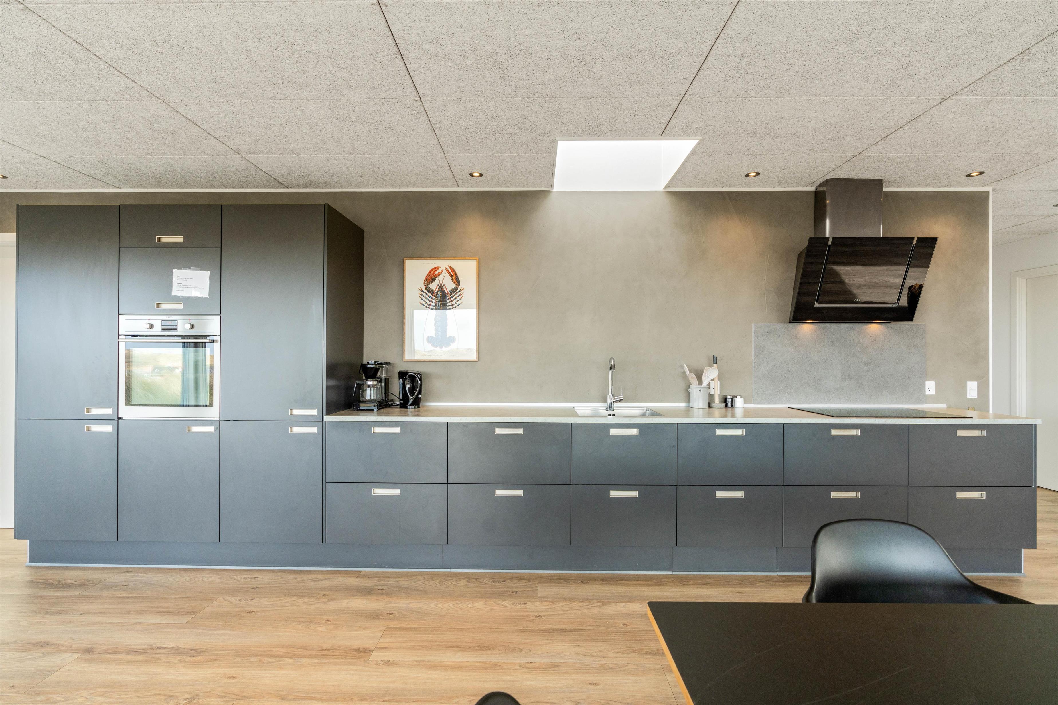Med dette feriehus er der garanti for velvære og skønne naturoplevelser. Fra opholdsrummet med køkken, spisestue og stue i ét, er der et fantastisk view udover sommerhusområdet og klitlandskabet igennem de store panoramavinduer mod vest. De både giver et rigtig dejligt lys til rummet – og samtidigt tager de naturen med helt ind i stuen – her mærker I virkeligt, at I bor på toppen af en klit – og med udsigt til andre klitter.