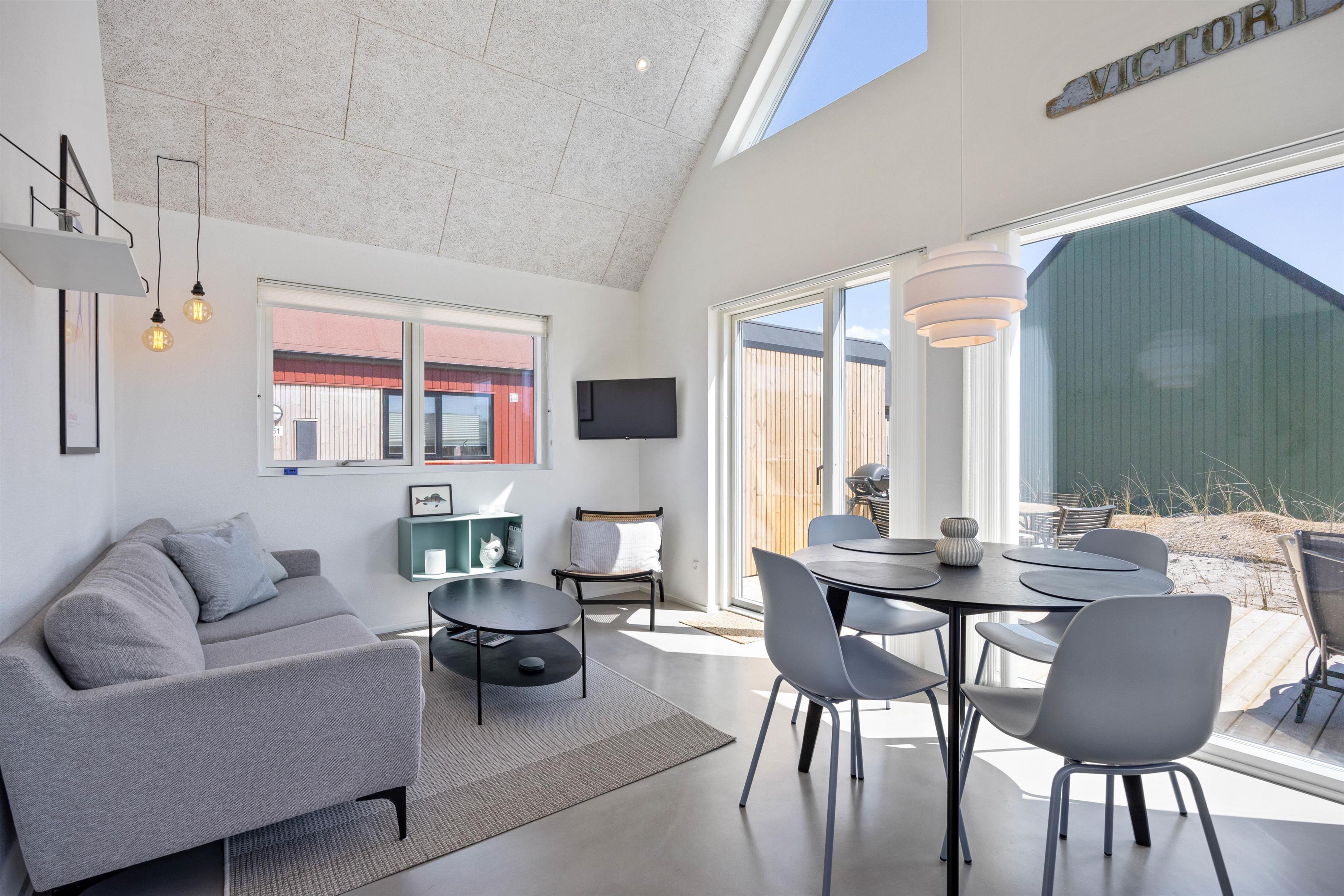 Det moderne sommerhus er lyst og indbydende indrettet med komfortable møbler. I køkkenalrummet med stue kan I samles om madlavning og hygge. Fra det store vinduesparti kan I sidde i sofaen eller ved spisebordet og nyde udsigten ud over Langsand. Om aftenen kan I samles til filmhygge og streame diverse film via feriehusets Chromecast. I sommerhuset finder I også en hyggelig hems med tv, hvor der er plads til afsplapning.