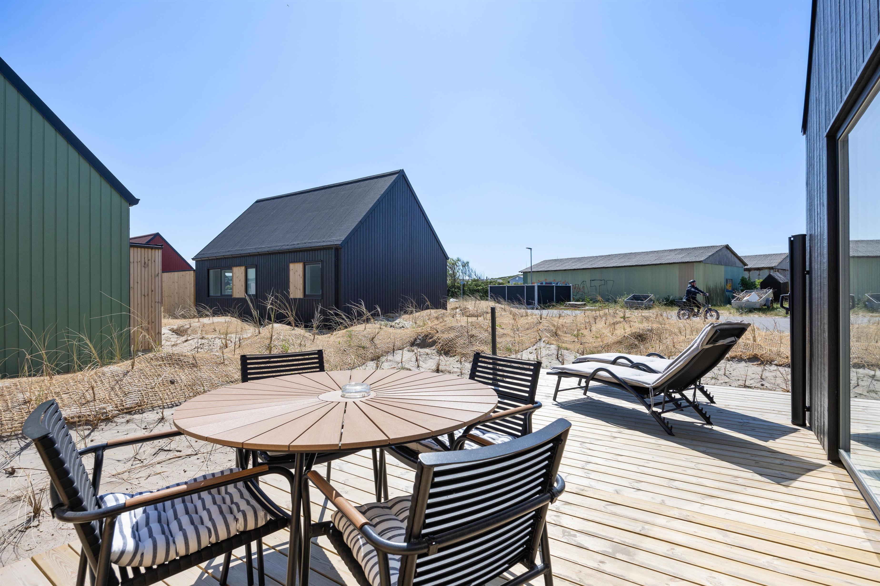Fra alrummet er der udgang til sommerhusets åbne og afskærmede terrasse. Her kan I sidde i læ og nyde morgenkaffen med udsigt til Langsand og Tyskerhavnen. Det er også muligt at tilberede en lækker middag på sommerhusets grill, og om sommeren kan I slå jer ned i sommerhusets havemøbler og nyde middagen på terrassen.
