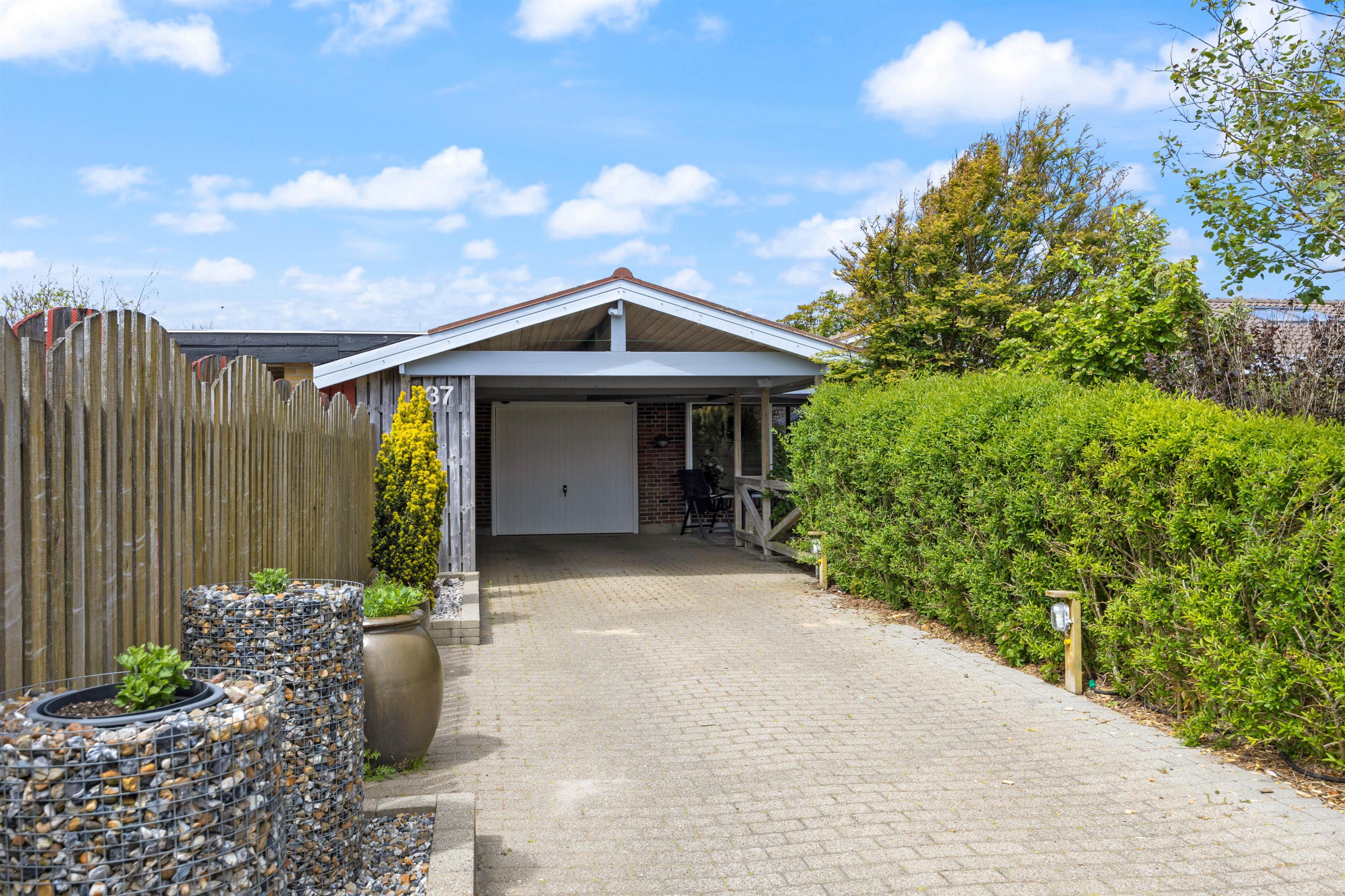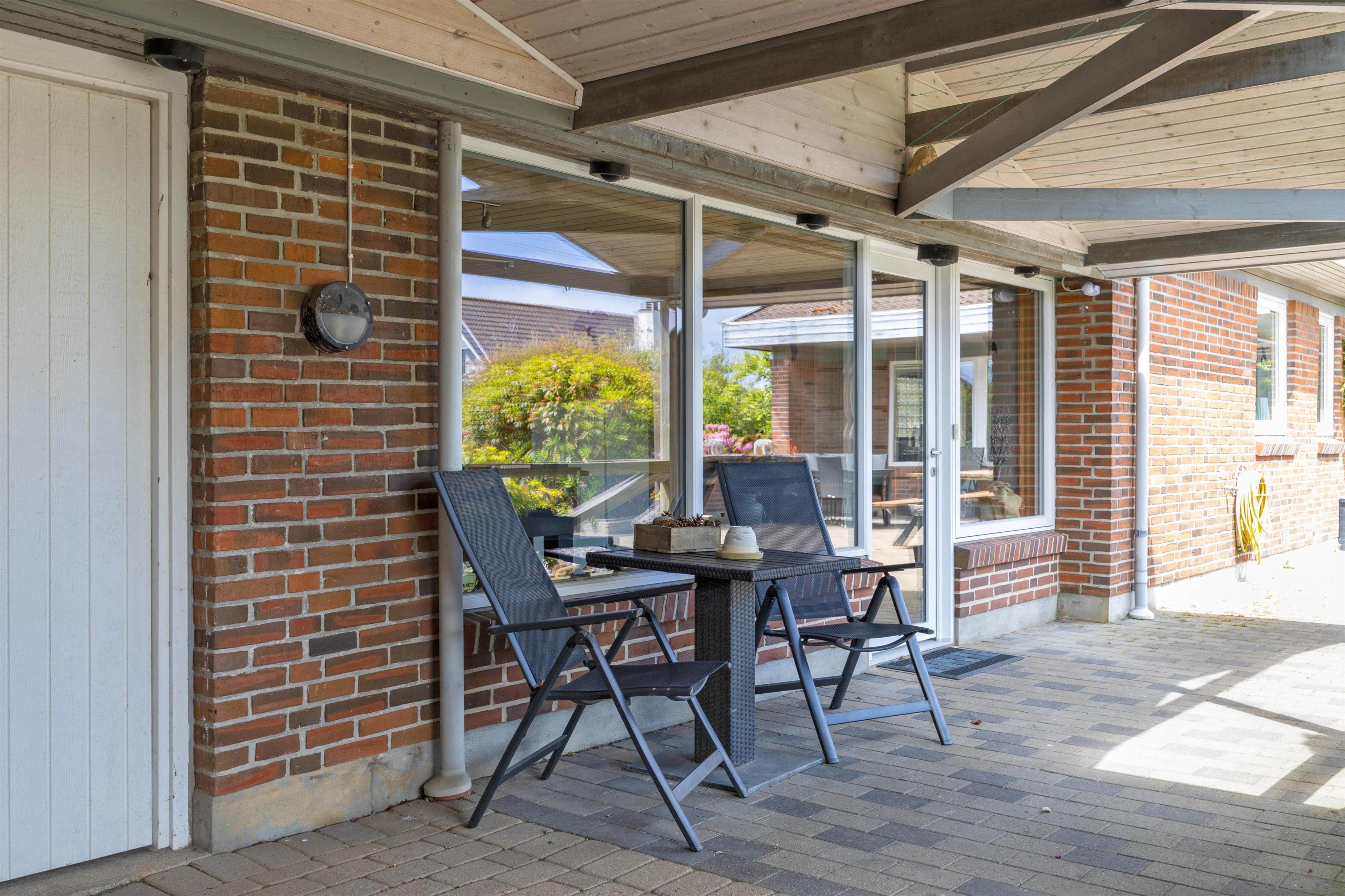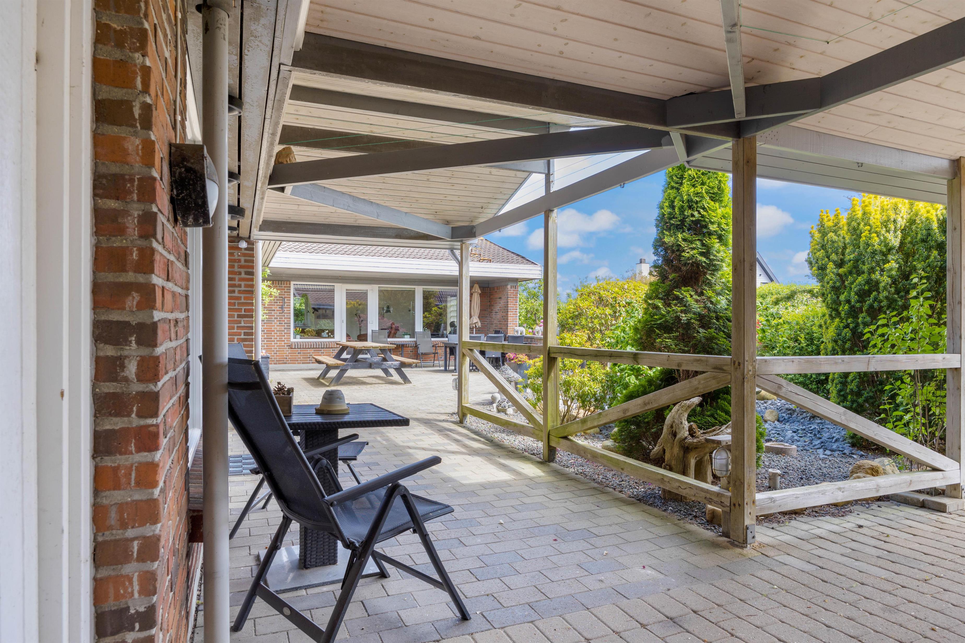I kan parkere bilen i carporten, og hvis det regner, kan I komme tørt ind i huset fra bilen, idet indgangspartiet er overdækket. Under carporten er også et lille havebord, hvor I kan nyde en kop kaffe om morgenen.