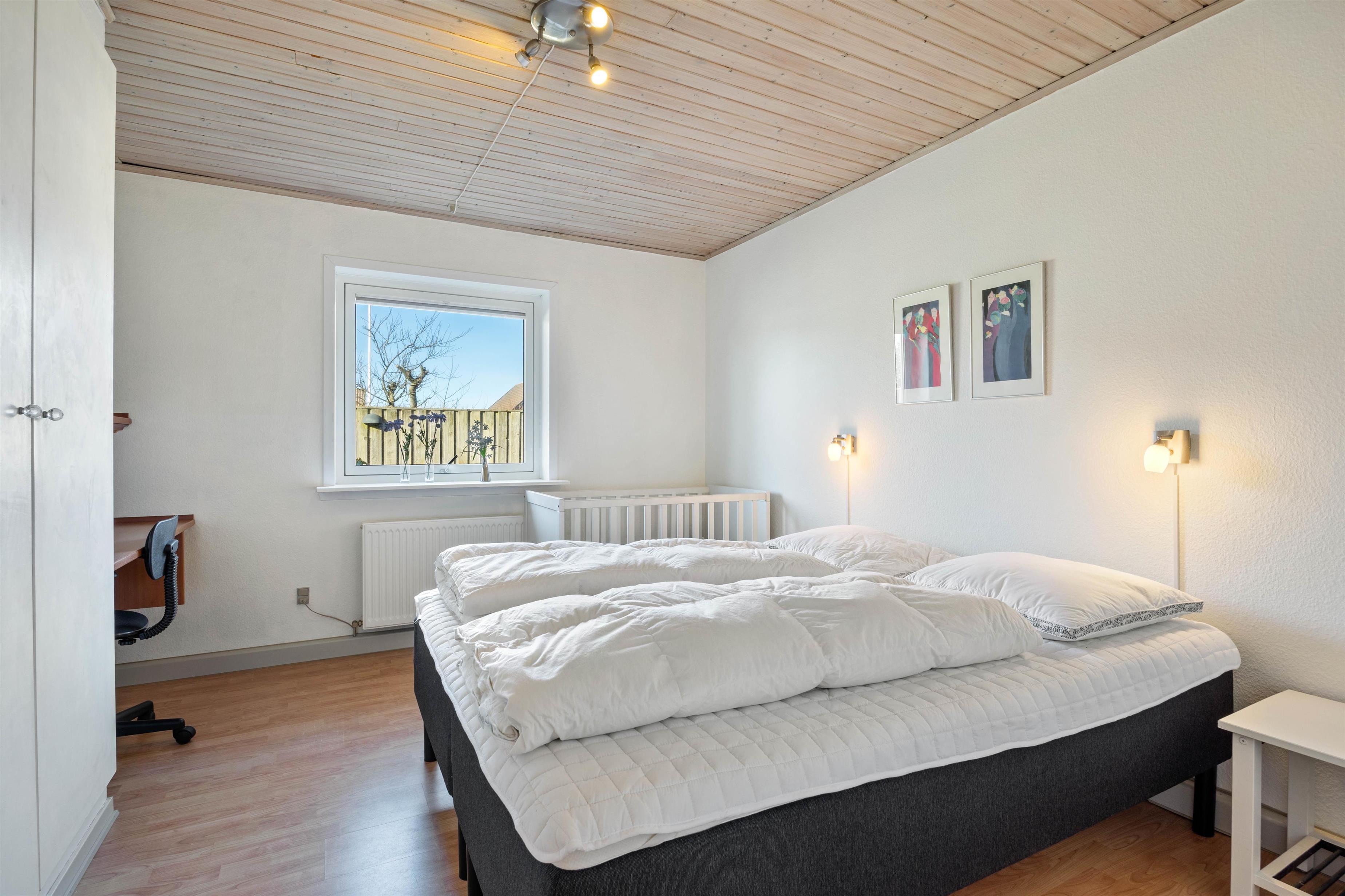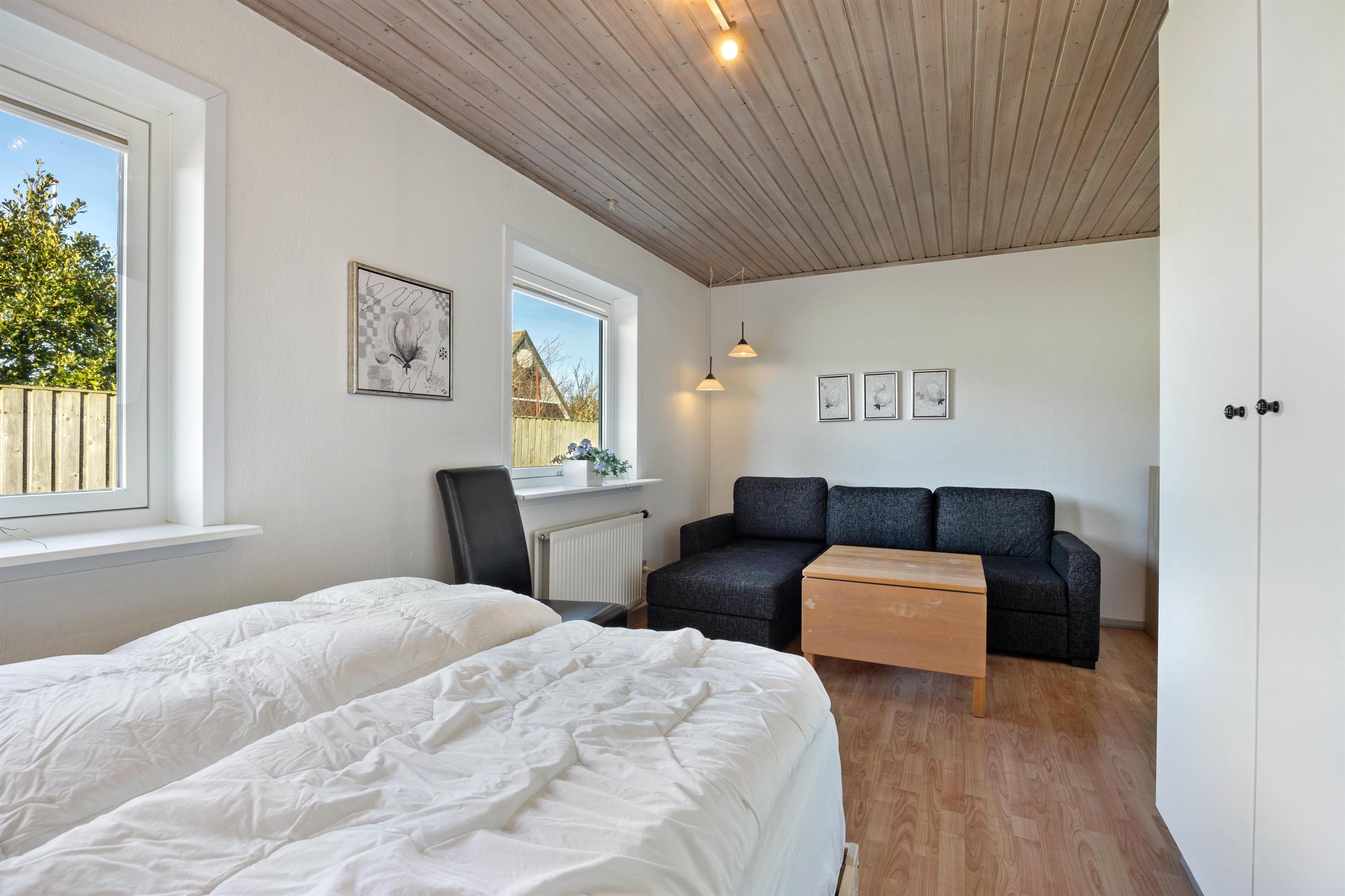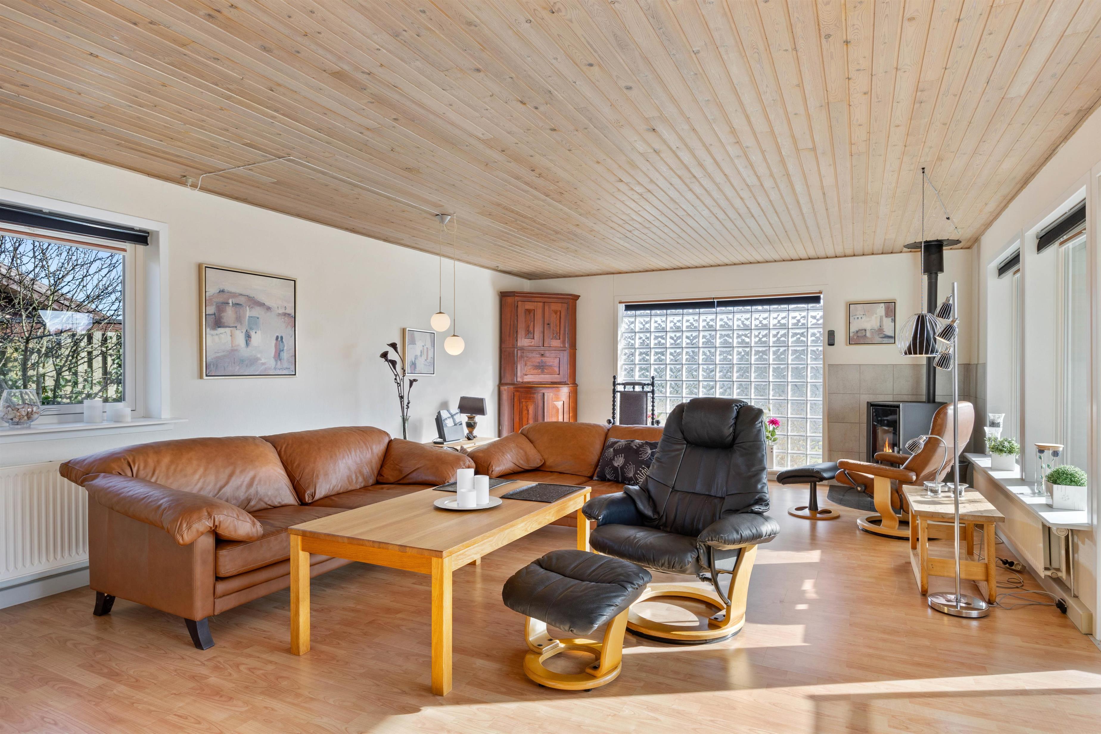 Stuen er desuden et stort, lyst rum med mange vinduer og behagelige siddepladser. Her kan du krølle dig sammen med et tæppe på sofaen sammen med din yndlingsbog, mens du kan høre træet knitre i brændeovnen i baggrunden. Der er 3 store soveværelser med dobbeltsenge til rådighed, hvor I alle kan få en god nats søvn. For at I kan starte dagen i ro og mag og uden stress om morgenen, er der to badeværelser med behagelig gulvvarme i dette feriehus. Derudover sørger husets vaskemaskine og tørretumbler for rent og tørt vasketøj.