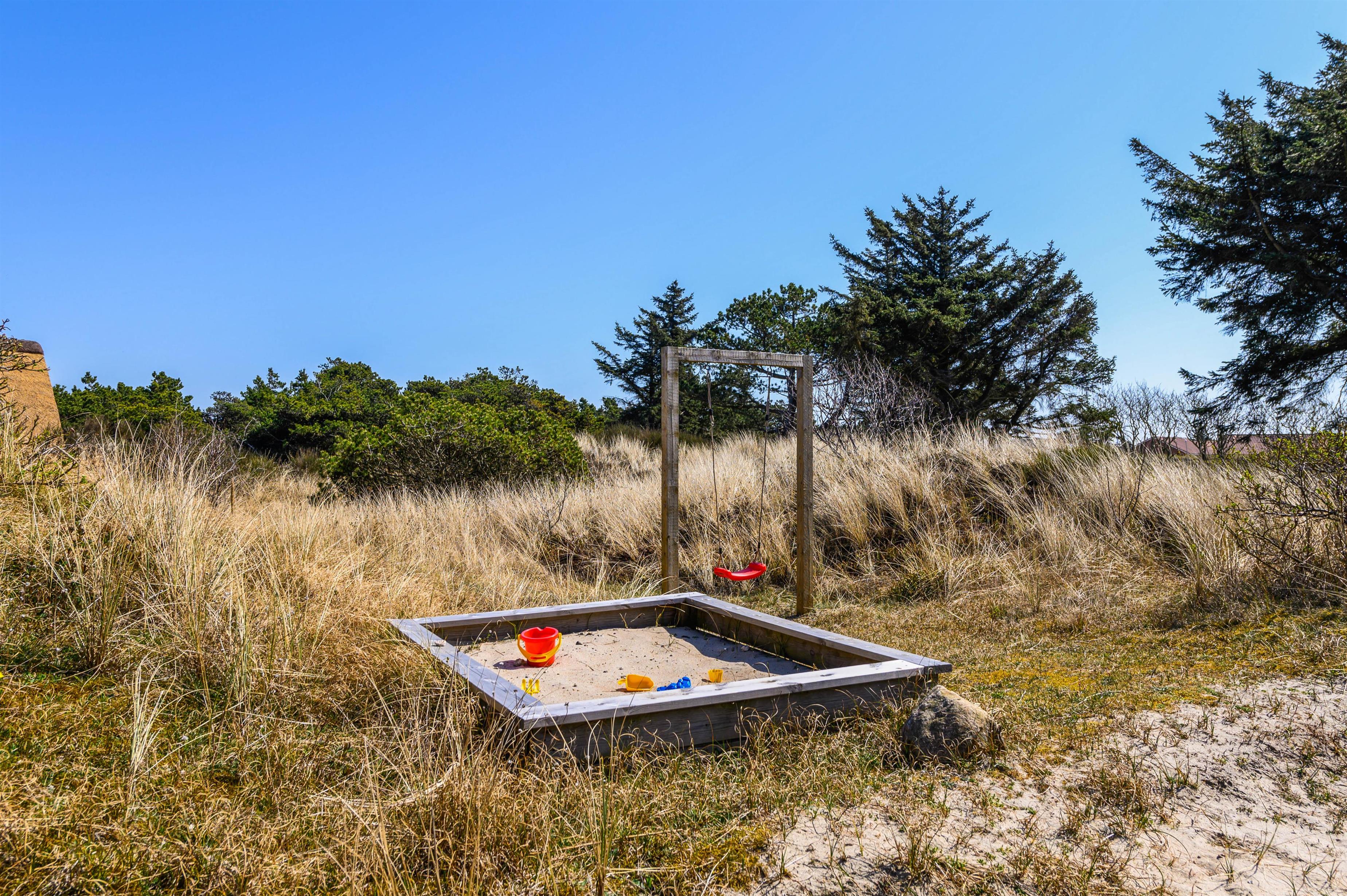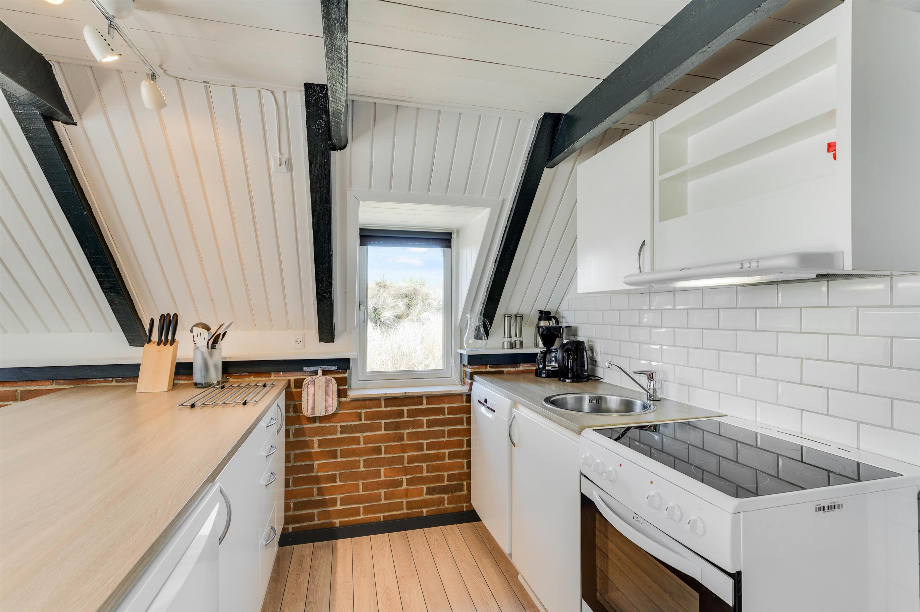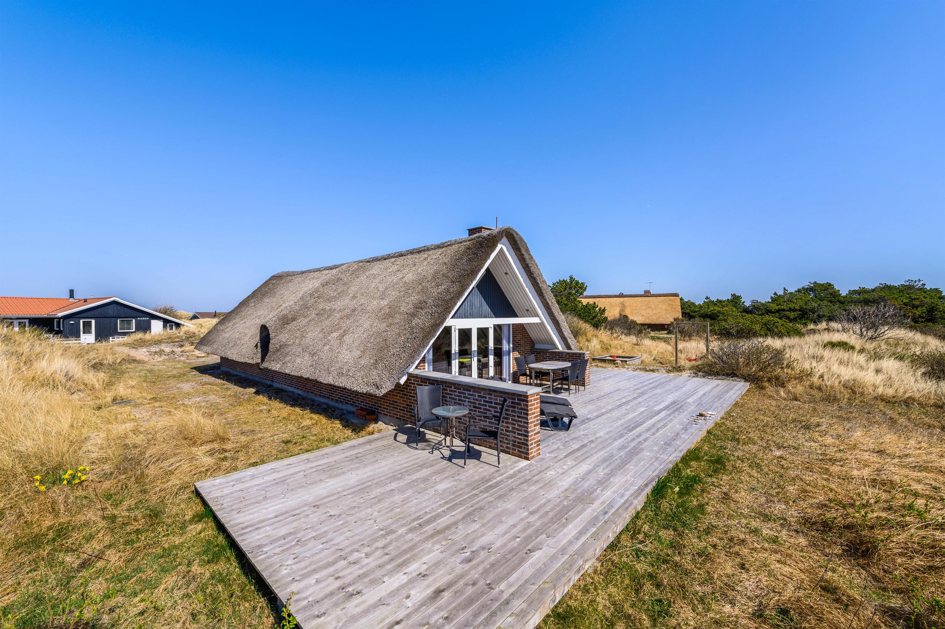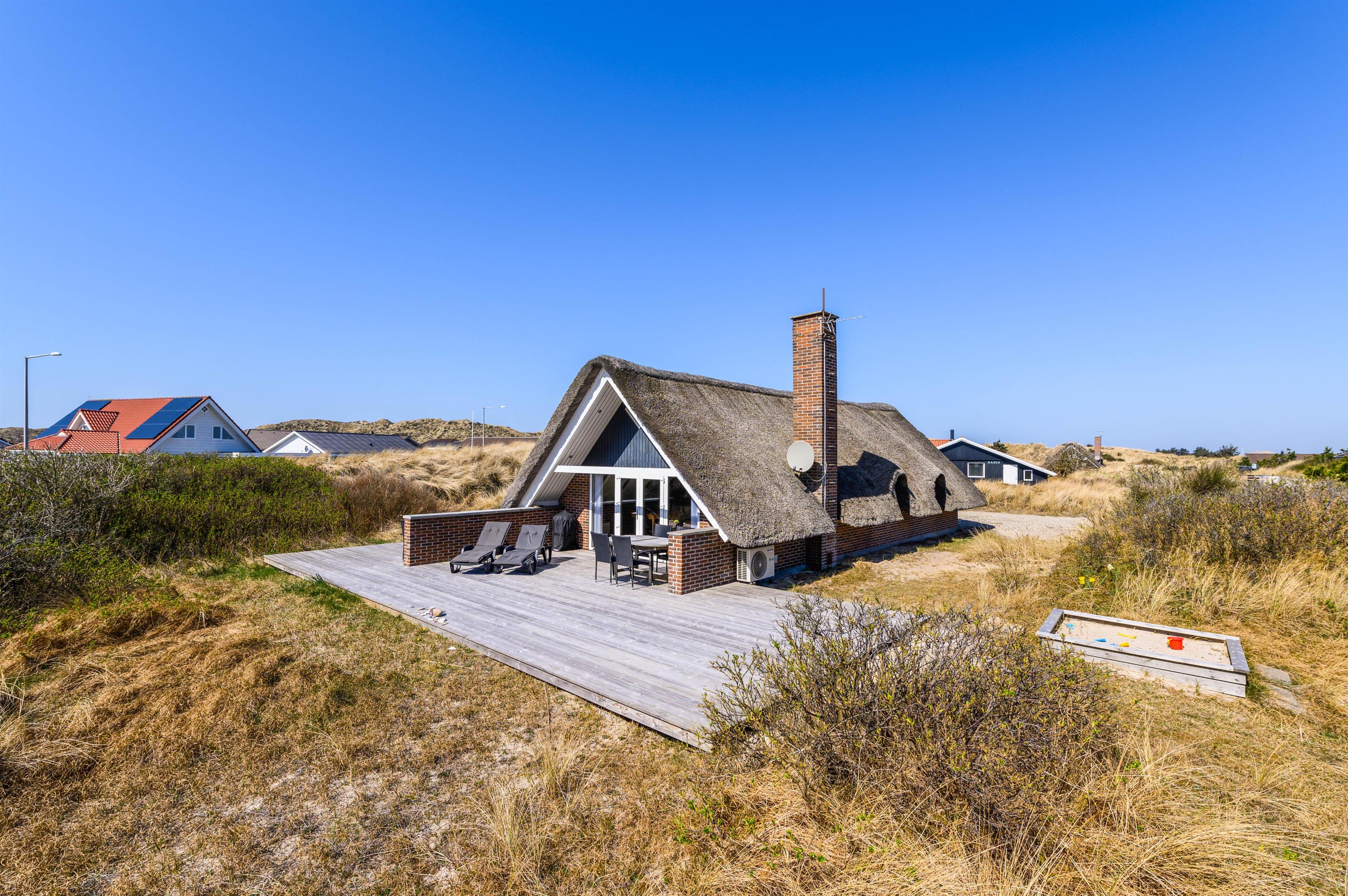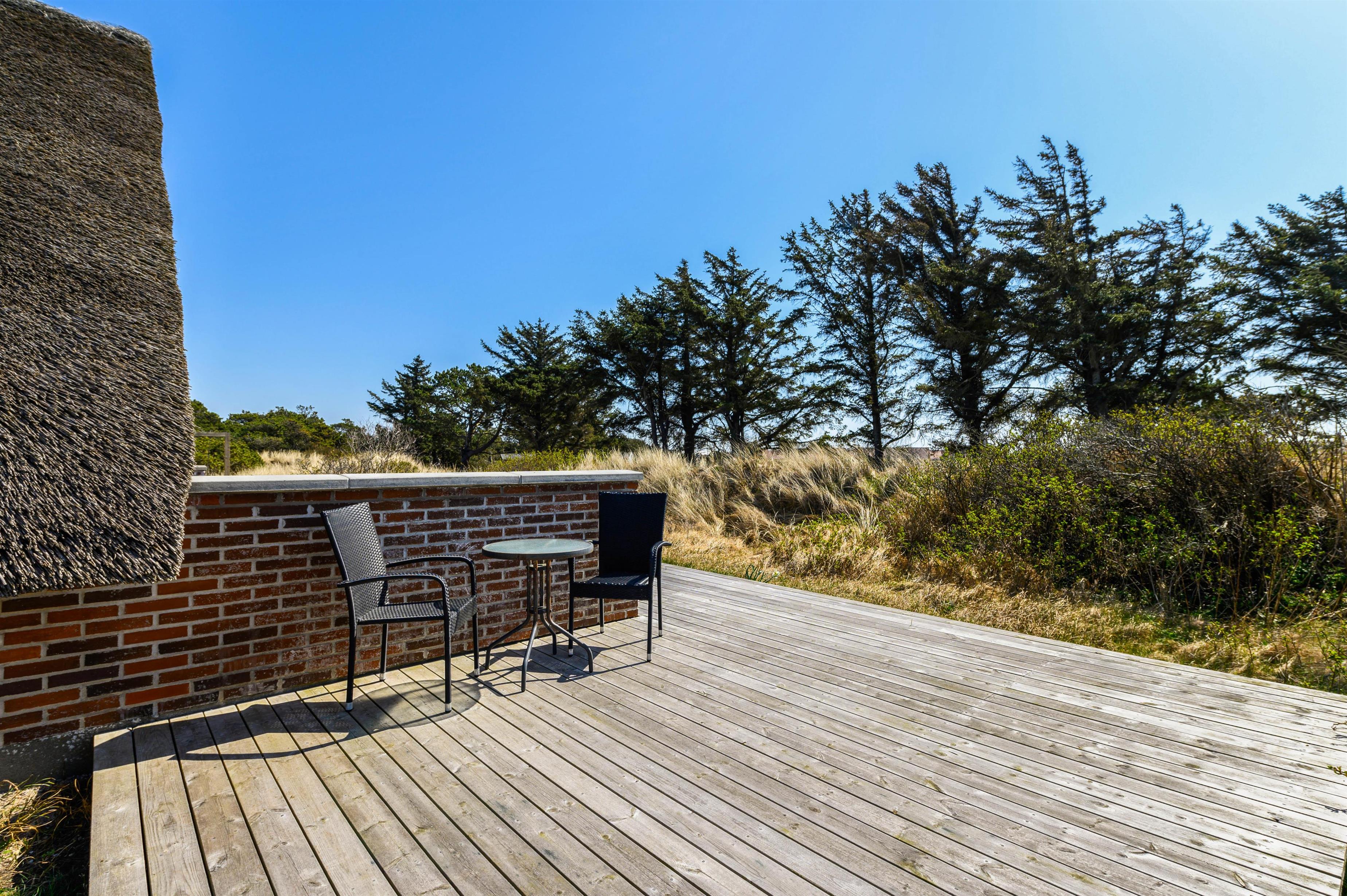 Fra stuen kommer I ud på den store, åbne træterrasse. Her finder alle en plads i solen, og på de ekstra varme dage kan I nyde solstrålerne fra liggestolene med en kold drink ved siden af. Til de mindste feriegæster står der et gyngestativ blandt klitterne.
