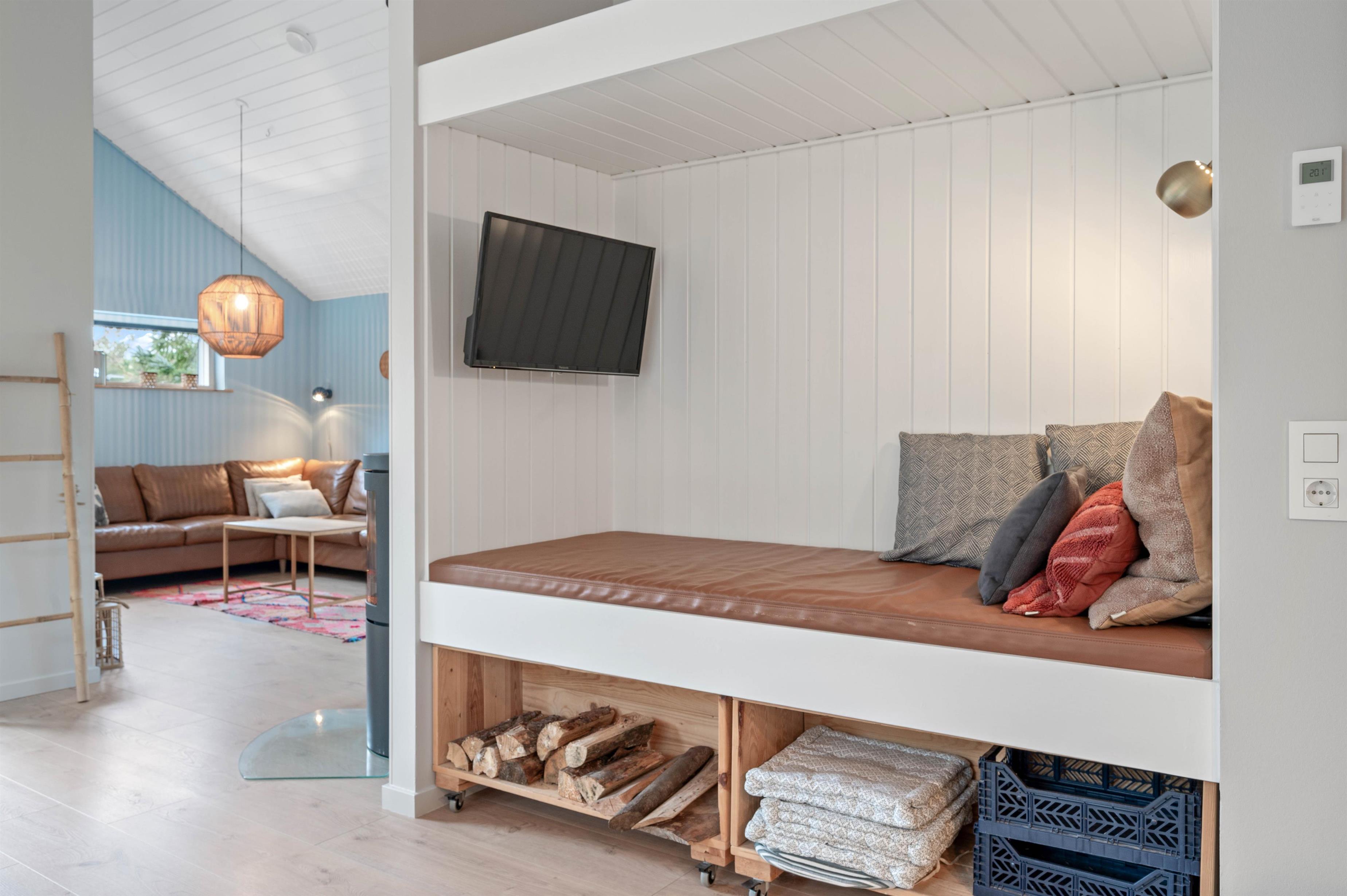 Samlingspunktet er det store hyggelige opholdsrum, hvor der ligesom i resten af sommerhuset, er åbnet op til kip. Her inviterer de store vinduespartier mod sydvest solen helt ind i huset for en lys og dejlig stemning.