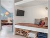 Badeværelset er flot og praktisk indrettet bl.a. med skydedøre, bag hvilke der gemmer sig opbevaringsplads, samt vaskemaskine og tørretumbler. Det vil nok især børnefamilier sætte stor pris på efter en lang dag ved stranden.