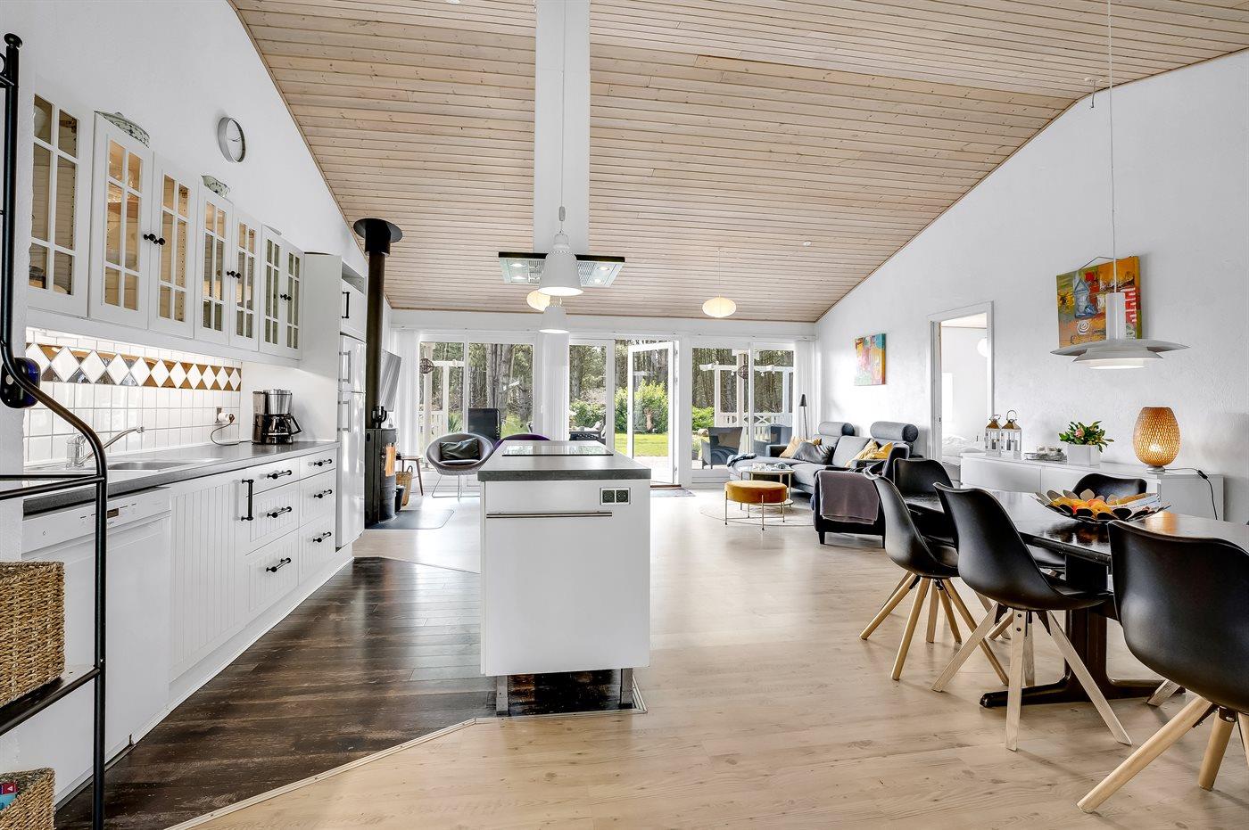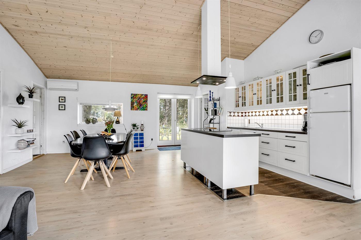 Køkkenet er udstyret med 1 køleskab. Der er 4 induktionskogeplader, varmluftovn, mikrobølgeovn samt opvaskemaskine.