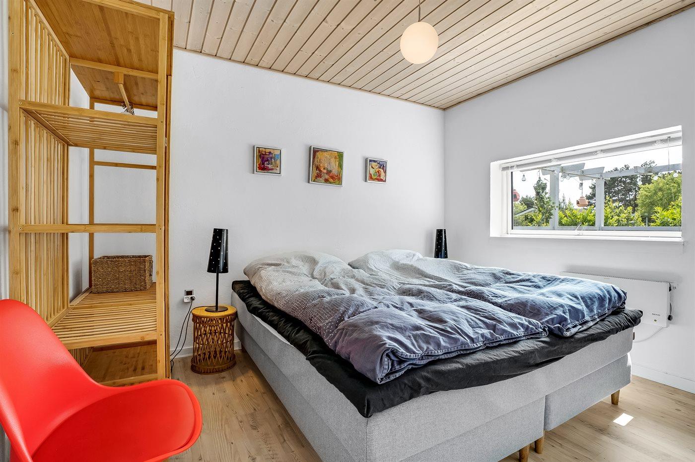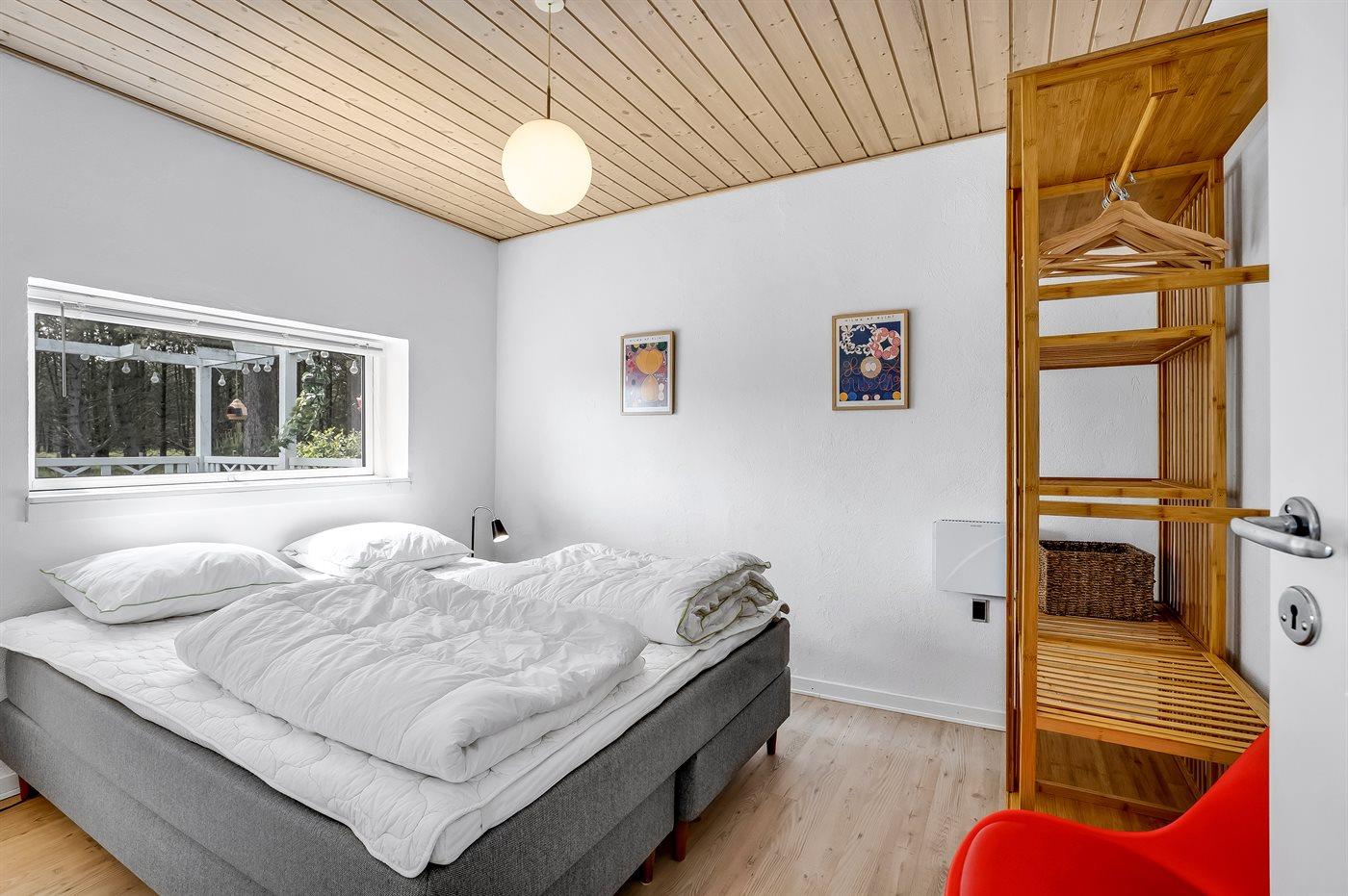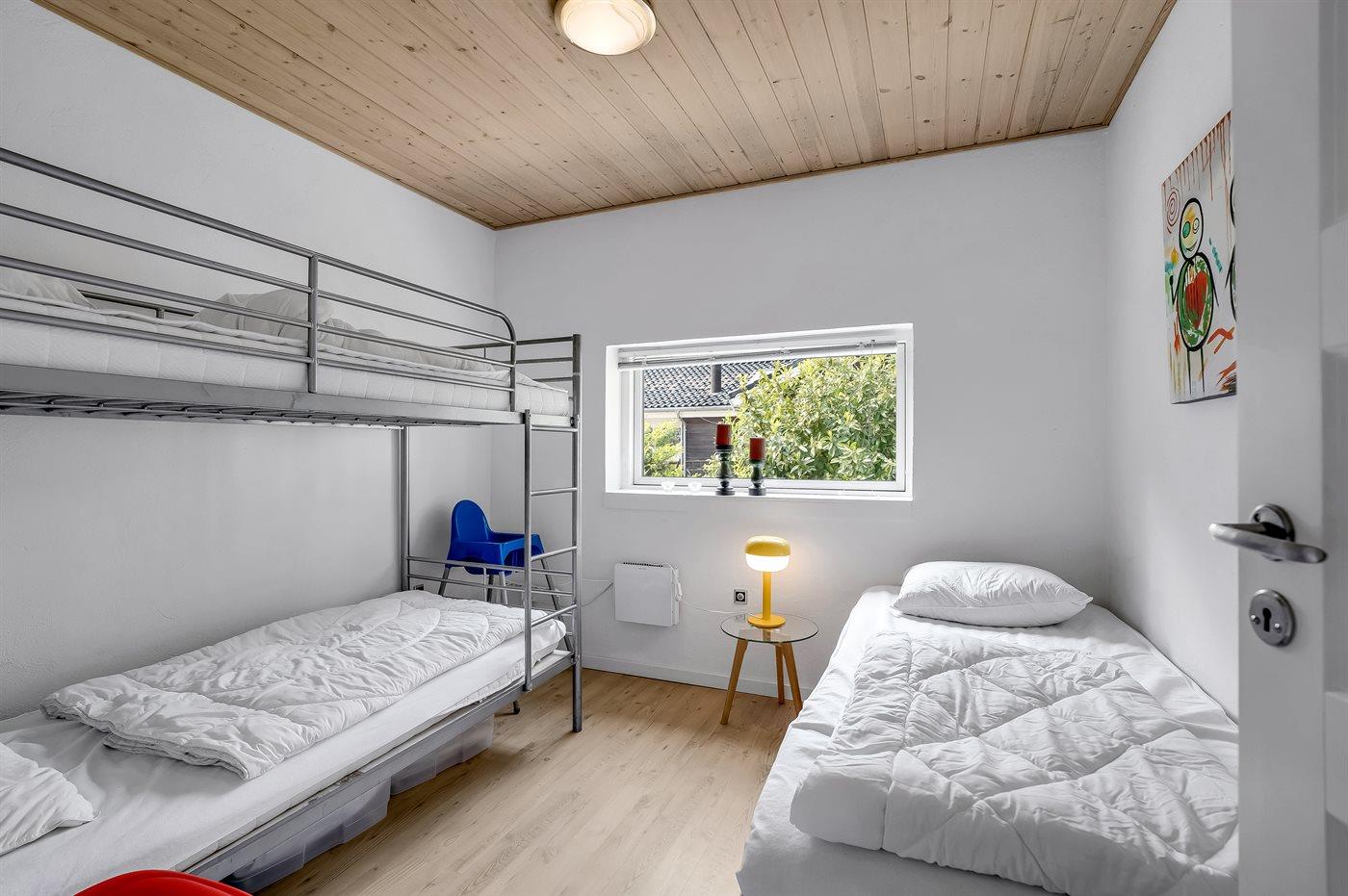 Der er i alt 3 soveværelser. Sovepladserne fordeler sig på: 4 sovepladser i dobbeltsenge. 1 soveplads i enkeltseng. 2 sovepladser i køjeseng. Derudover er der 1 stk. barneseng.
