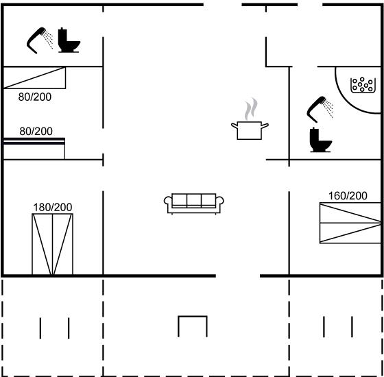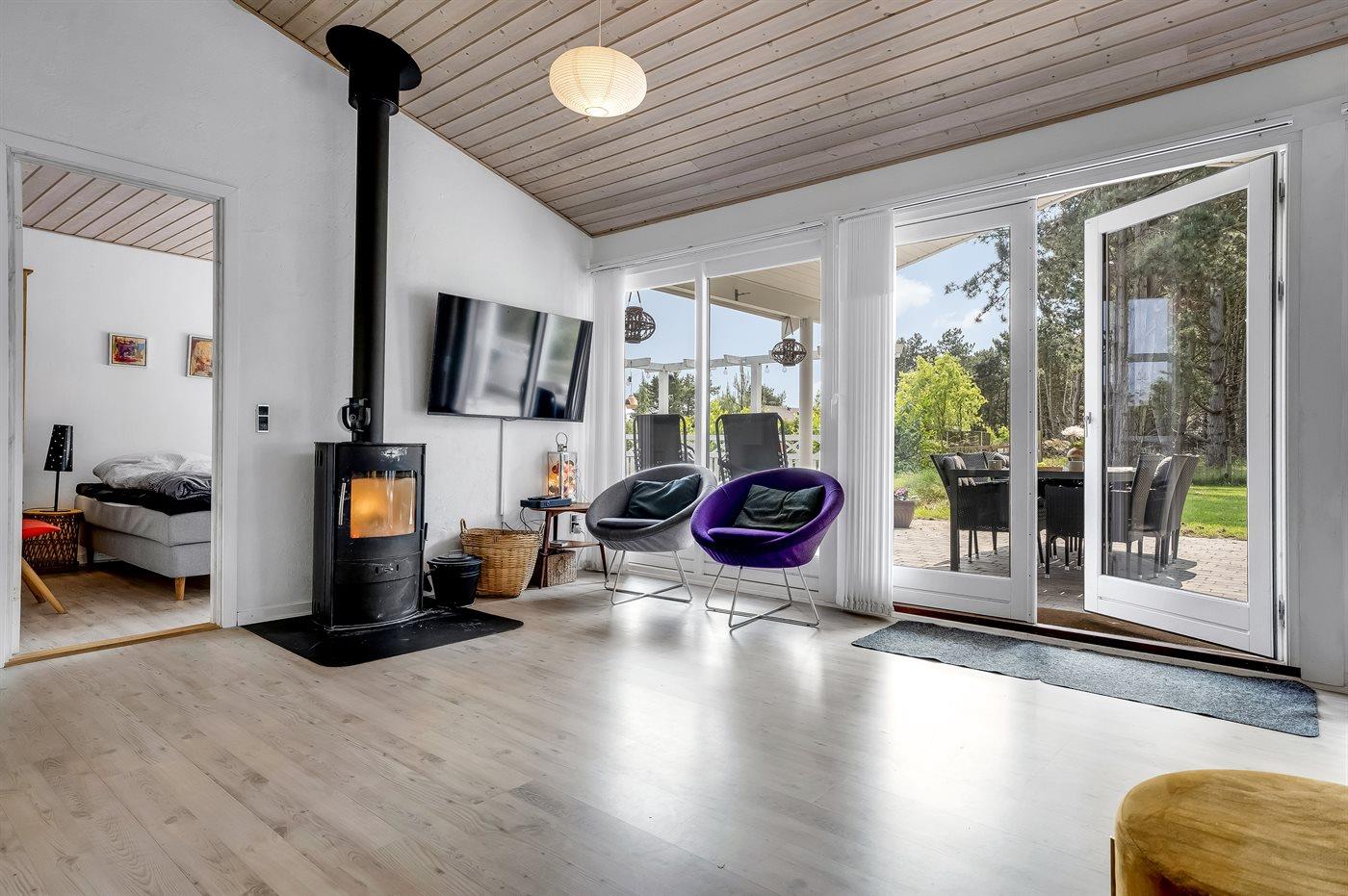 Opholdsstuen er hyggeligt indrettet med en brændeovn, hvor I kan varme jer på kølige aftener, og køkkenafdelingen er veludstyret med alt, hvad I har brug for til madlavning. Tre soveværelser, en soveplads (en opredning) på en fold-ud-madras og to badeværelser, hvoraf det ene er med spa.