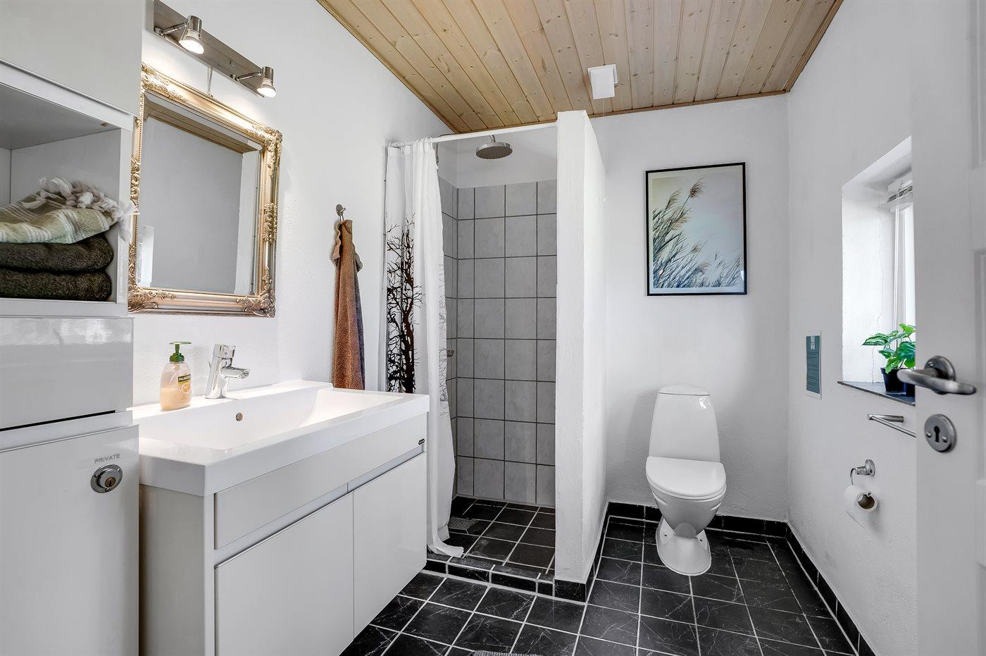 Der er 2 badeværelser med bruseniche og 2 toiletter. Der er gulvvarme på 2 badeværelser.