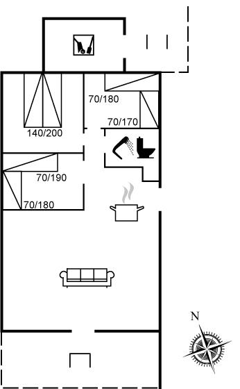 Der er i alt 3 soveværelser. Sovepladserne fordeler sig på: 2 sovepladser i dobbeltseng. 4 sovepladser i enkeltsenge. Derudover er der 1 stk. barneseng.