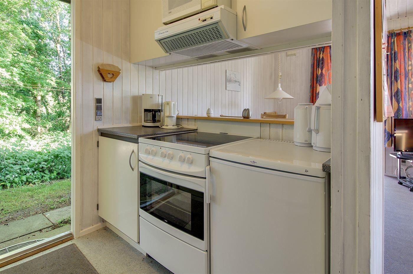 Køkkenet er udstyret med 1 køleskab. Der er 4 keramiske kogeplader, varmluftovn, mikrobølgeovn.