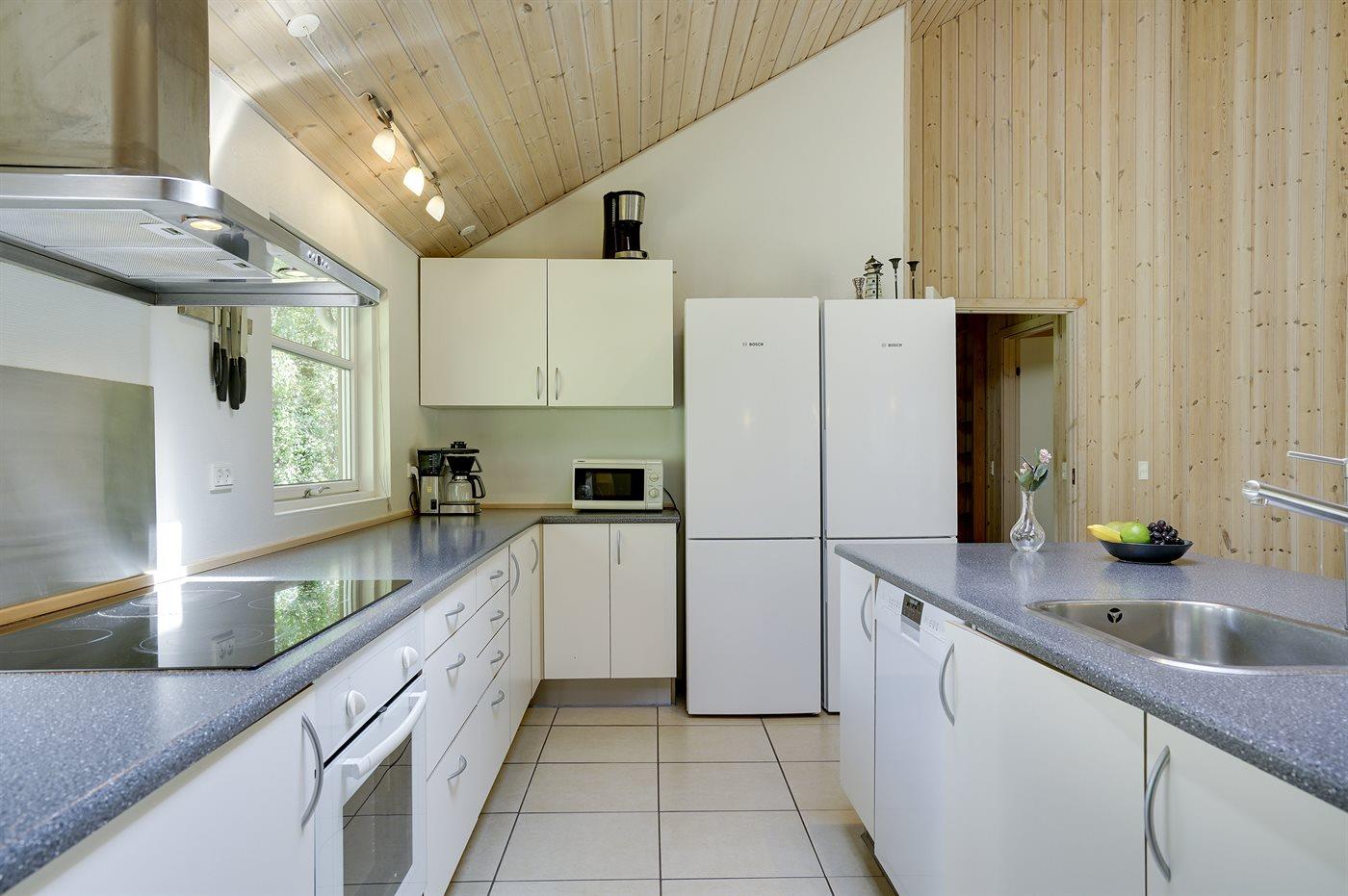 Køkkenet er udstyret med 1 køleskab. Der er 4 keramiske kogeplader, varmluftovn, mikrobølgeovn samt opvaskemaskine.