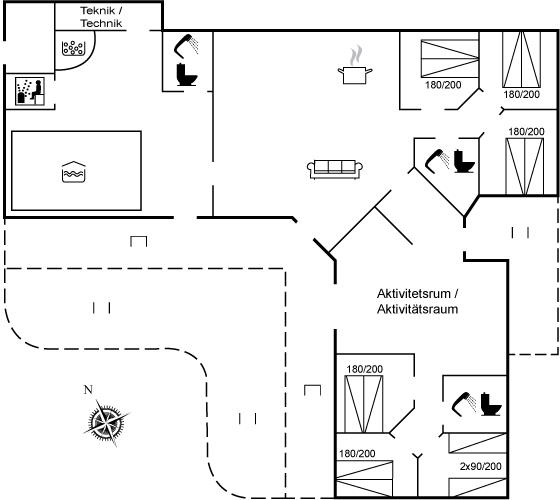 Der er i alt 6 soveværelser. Sovepladserne fordeler sig på: 10 sovepladser i dobbeltsenge. 2 sovepladser i enkeltsenge. 6 sovepladser på madrasser. 6 af disse sovepladser fordeler sig på 2 hemse. Derudover er der 1 stk. barneseng.