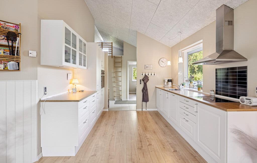 Den fredelige beliggenhed af jeres feriehus i et charmerende feriehusområde og den korte gåtur til Limfjorden skaber optimale betingelser for afslappende dage. Læn jer tilbage i den rummelige opholds- og spisestue, som er indbydende takket være de store vinduer, lyse farver og åbne planløsning. Brug de komfortable sofaer til rolige stunder og server måltider sammen ved det lange spisebord. Tilbered jeres måltider i det åbne køkken, som har rigelig bordplads og apparater af høj kvalitet. Om aftenen kan I slappe helt af i spabadet.