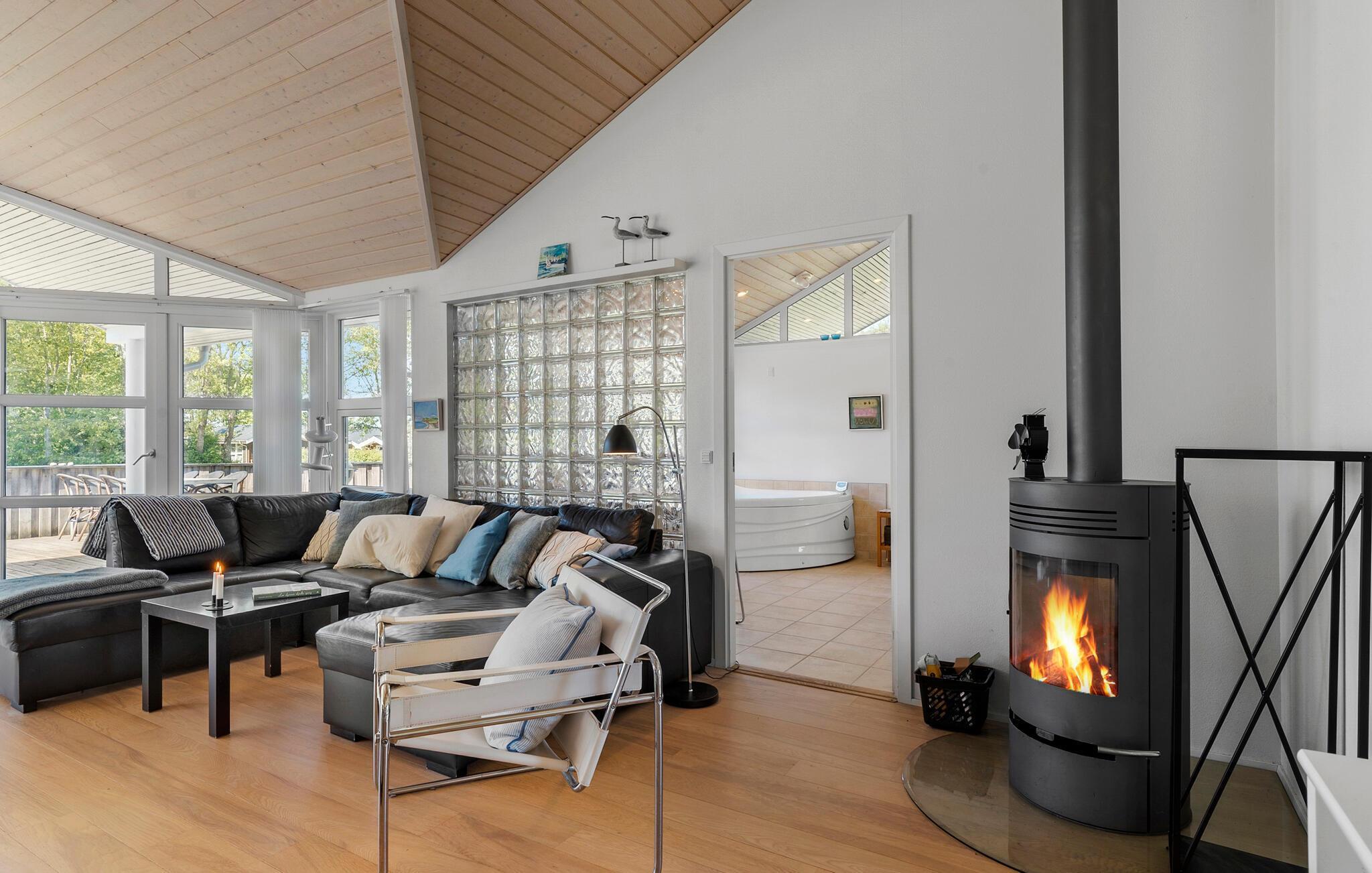 Flot feriehus nær Limfjorden med spabad, bålplads og store vinduer i grønne omgivelser.