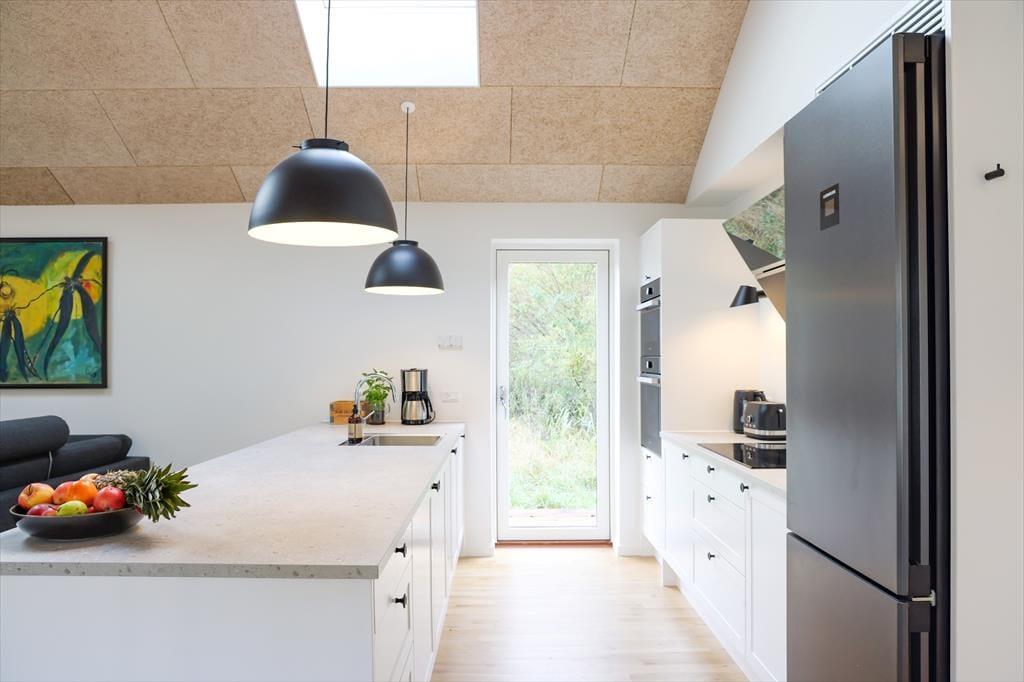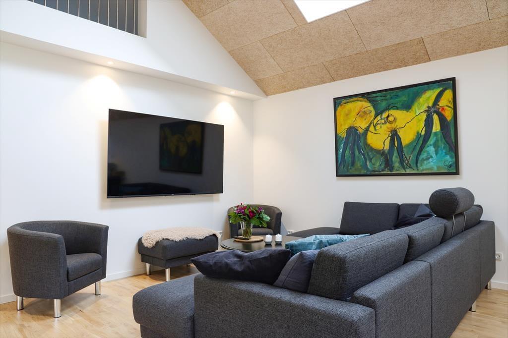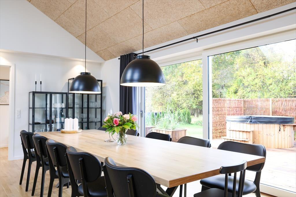 Indendørs i dette fantastiske sommerhus mødes du af lyse og indbydende rum med højt til loftet. Sommerhusets hjerterum er helt centralt i huset, nemlig det store køkken/alrum som inviterer til mange hyggelige stunder med madlavning og afslapning ved det store spisebord. I aktivitetsrummet kan I slippe konkurrencegenet løs og dyste i både pool og dart, hvis der da ikke skal slappes af i sofaen. Med sommerhusets gode planløsning og de mange kvadratmeter, kan venner og familie samles til en hyggelig ferie.
