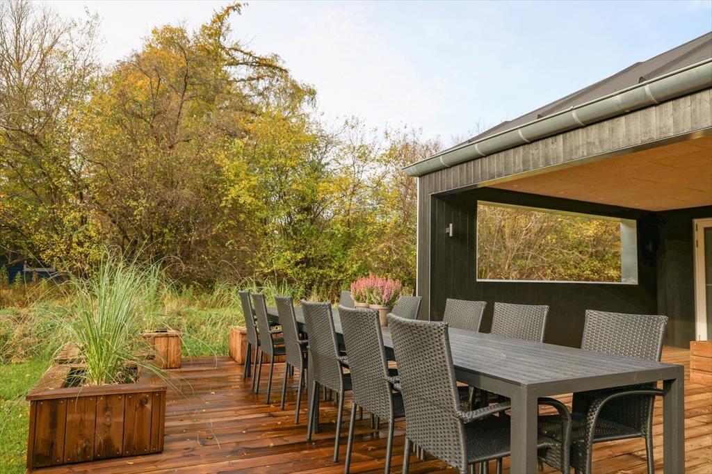 Her har I muligheden for en både sjov og afslappende ferie. Dette store nybyggede sommerhus rummer nemlig et stort aktivitetsrum med poolbord og dart og udendørs en kæmpe terrasse med vildmarksbad. Husets størrelse giver jer muligheder for at invitere venner og familie med på ferie.
