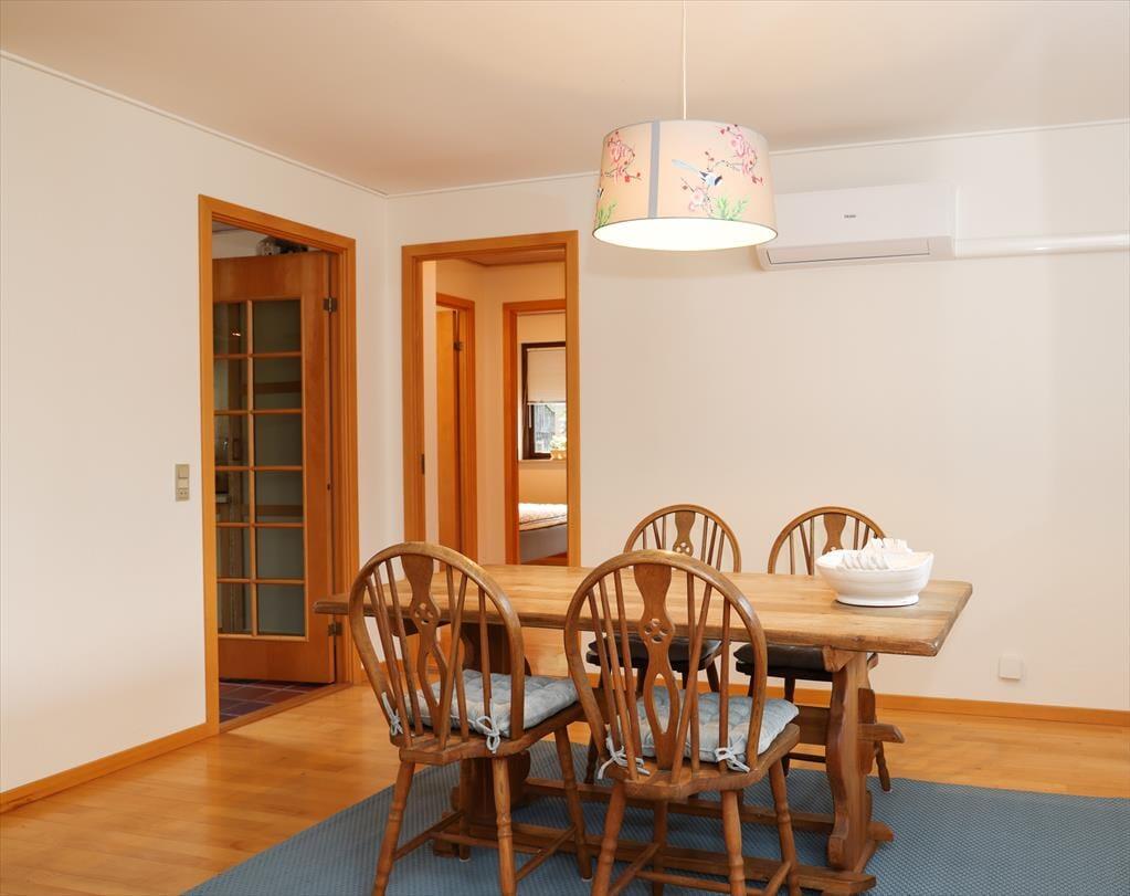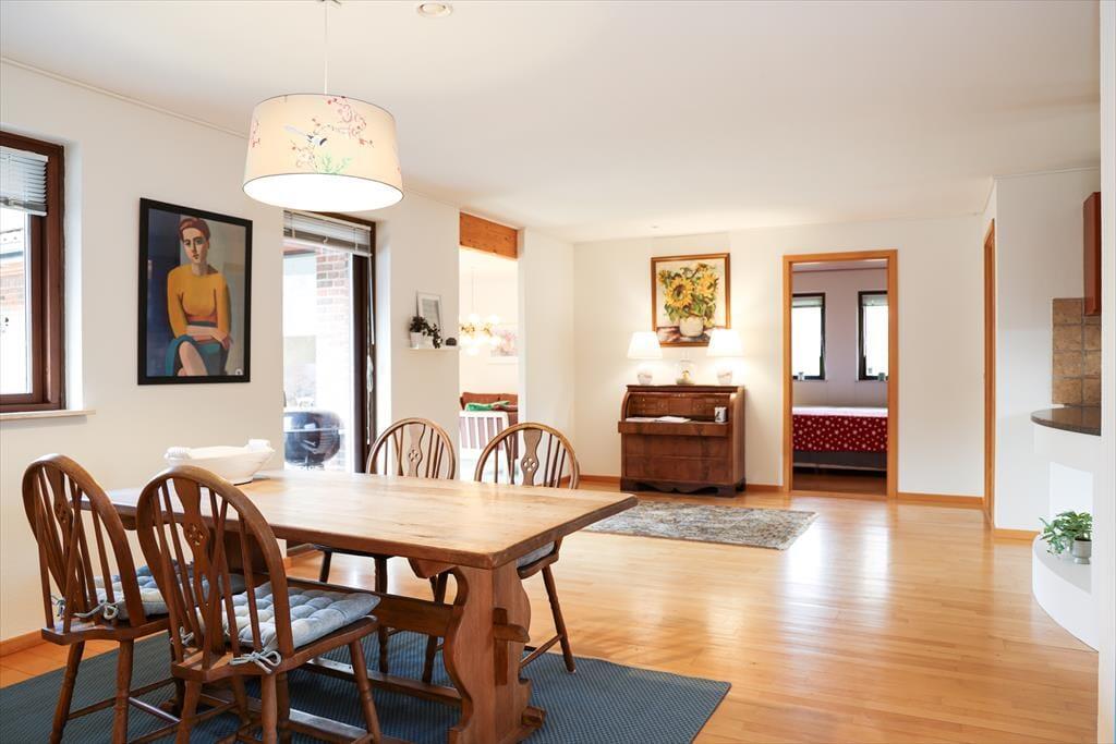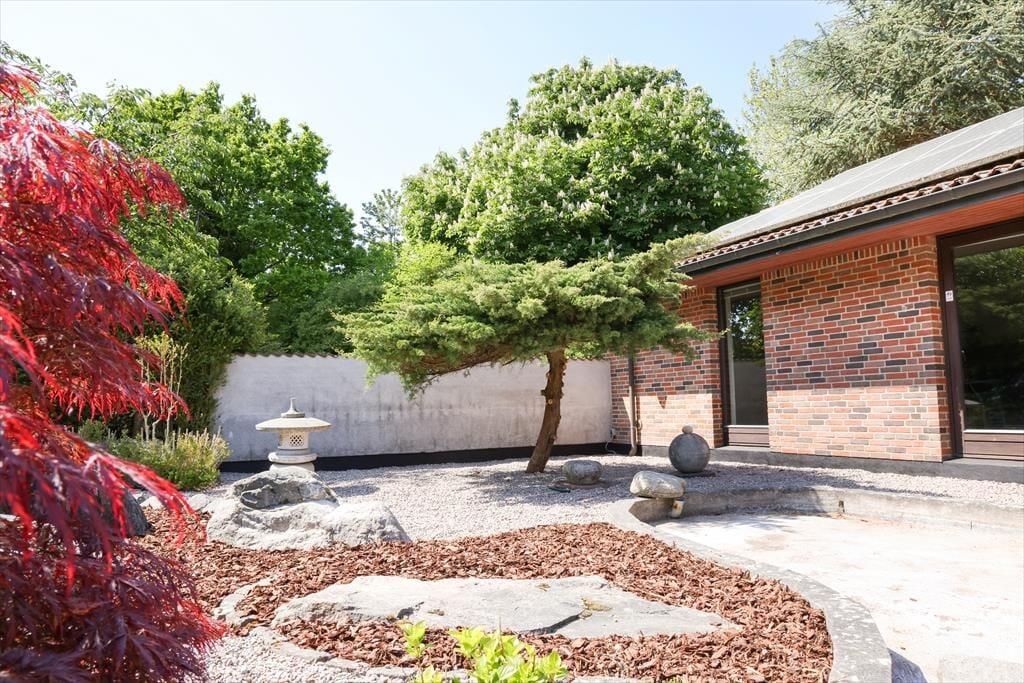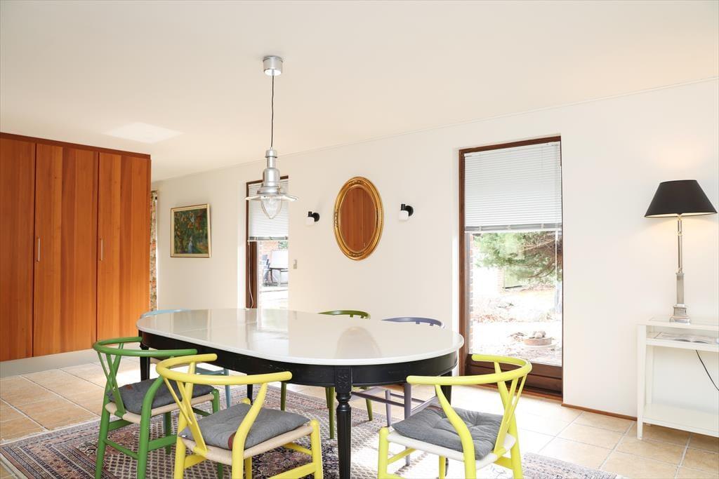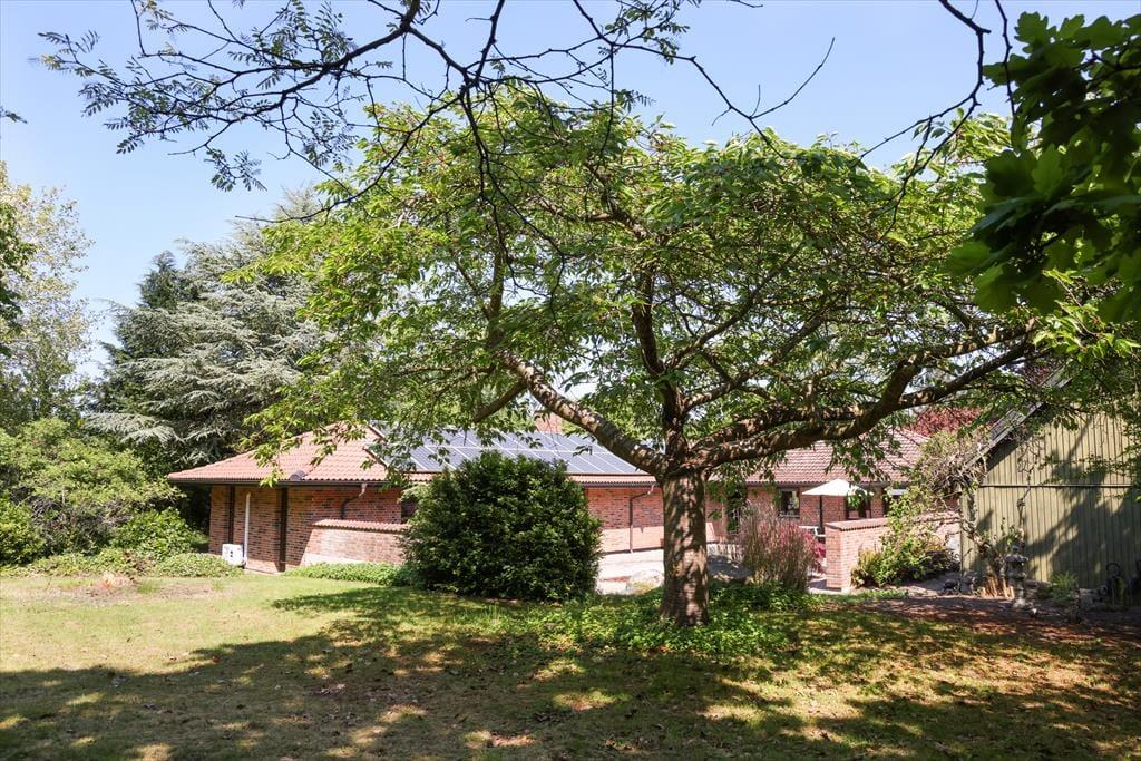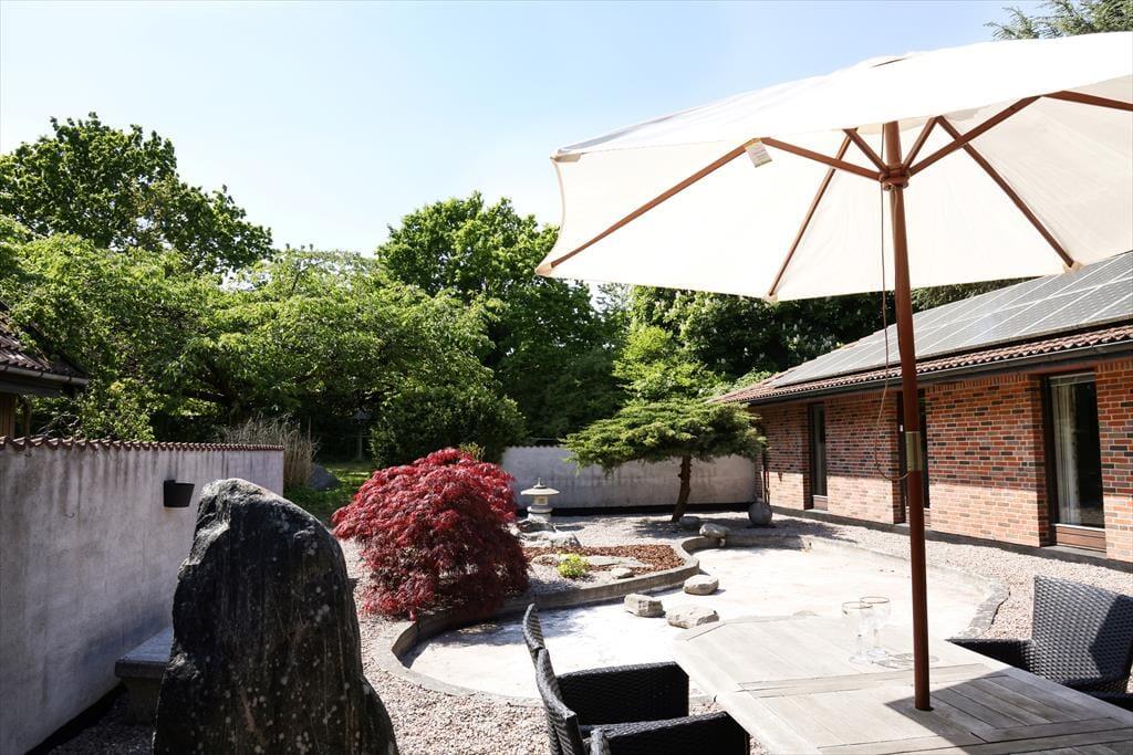 Huset indeholder 3 gode soveværelser med rigelig skabsplads og dobbeltsenge på henholdsvis 140cm,140cm og 180 cm. Der er 2 stuer, den ene med brændeovn og fjernsyn samt briks og den anden med siddepladser til 8. Det meget rummelige køkken og en almindelig spisestue er ud i et. Der er både opvaskemaskine, mikroovn, 1 alm køleskab samt 1 amerikansk køleskab og stor fryser. I den lyse herskabelige spisestue, er der plads til 6 personer omkring bordet samt udgang til terrassen. Der er 2 badeværelser, det ene med brus og i forbindelse med master bedroom og det andet med brus og badekar. Den smukke og hyggelige terrasse i forbindelse med det dejlige gårdmiljø har både, grill og havemøbler. Her kan der dases fuldstændig uforstyrret i liggestolene med en god bog. Alt i alt et dejligt hus med god mulighed for at fordele sig i forskellige rum. Grunden er stor med rigtig mange kringelkroge, hvor børnene kan lege uden opsyn, idet haven er indhegnet. Der er et rigt dyreliv på grunden og det er ikke ualmindeligt at kunne betragte rådyr og harer lige uden for vinduerne.