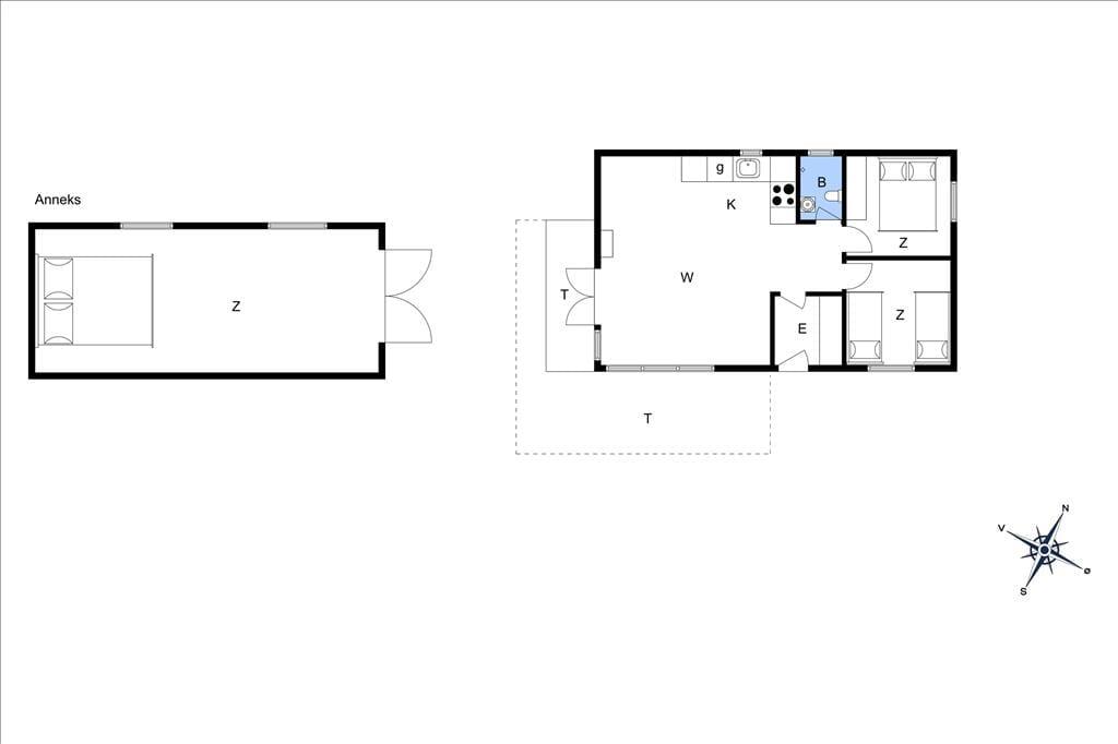 Huset indeholder 2 gode soveværelser med henholdsvis 1 dobbelt og 2 enkeltsenge og god skabsplads. I stuen er der fjernsyn med chromecast til streaming af fjernsynskanaler og åbent køkken. Fra stuen er der udgang til den hyggelige overdækkede terrasse, hvor du kan grille, hygge og se børnene lege i den store dejlige have med hyggeligt legehus med loft til kip samt fodboldmål. Det rummelige anneks indeholder dobbeltseng og TV .