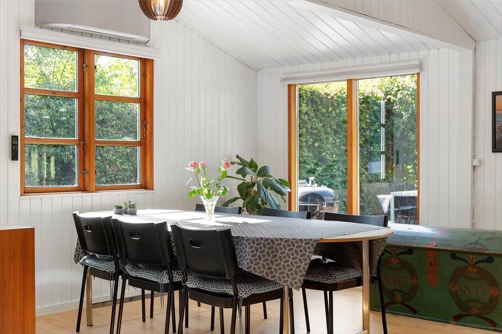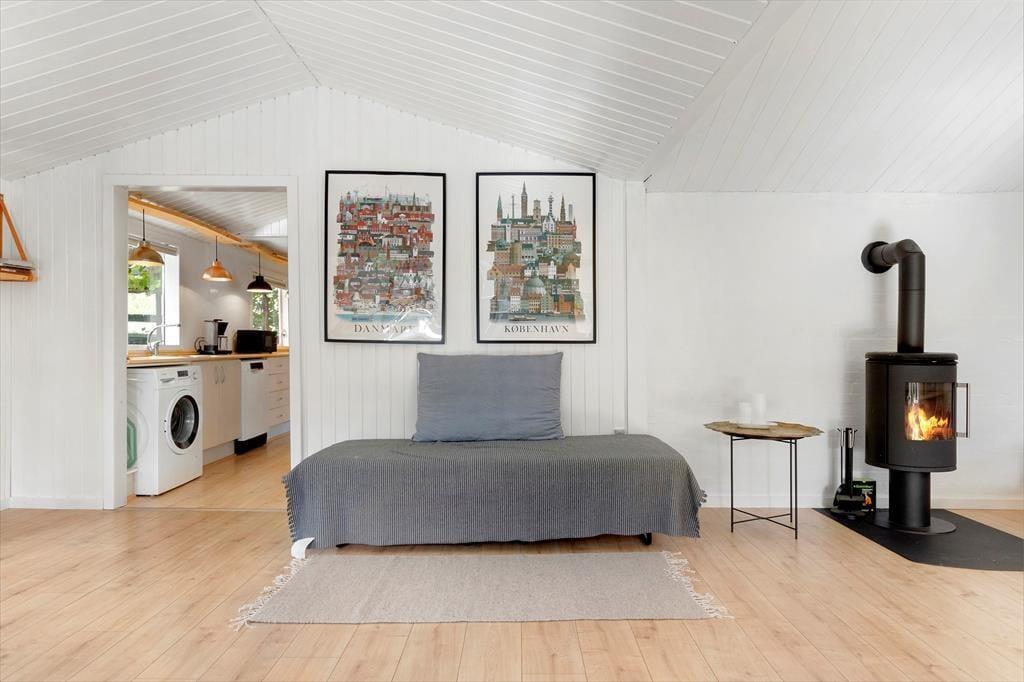 Dette enkle sommerhus vil glæde jer med sin lyse stue og smagfulde dekorationer. Her finder I frem for alt rummelighed og komfort hyggelig brændeovn og separat spisepladsområde, skabt af det raffinerede arrangementer og valg af æstetiske møbler.