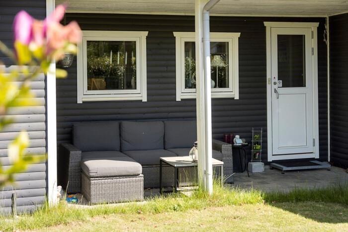 -på en af husets 3 terrasser hvoraf den ene er lukket og afskærmet for vinden. Den forreste terrasse er super velegnet til at nyde morgensolen mens man indtager sin morgenmad. Haven er lukket med stor græsplæne uden så meget andet end god plads.
