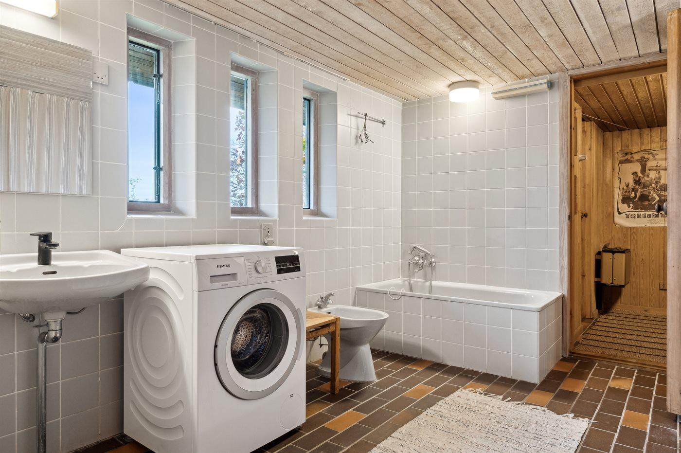 Der er 2 badeværelser med bruseniche og 1 toilet.. Badekar. I saunaen er der mulighed for afslapning.