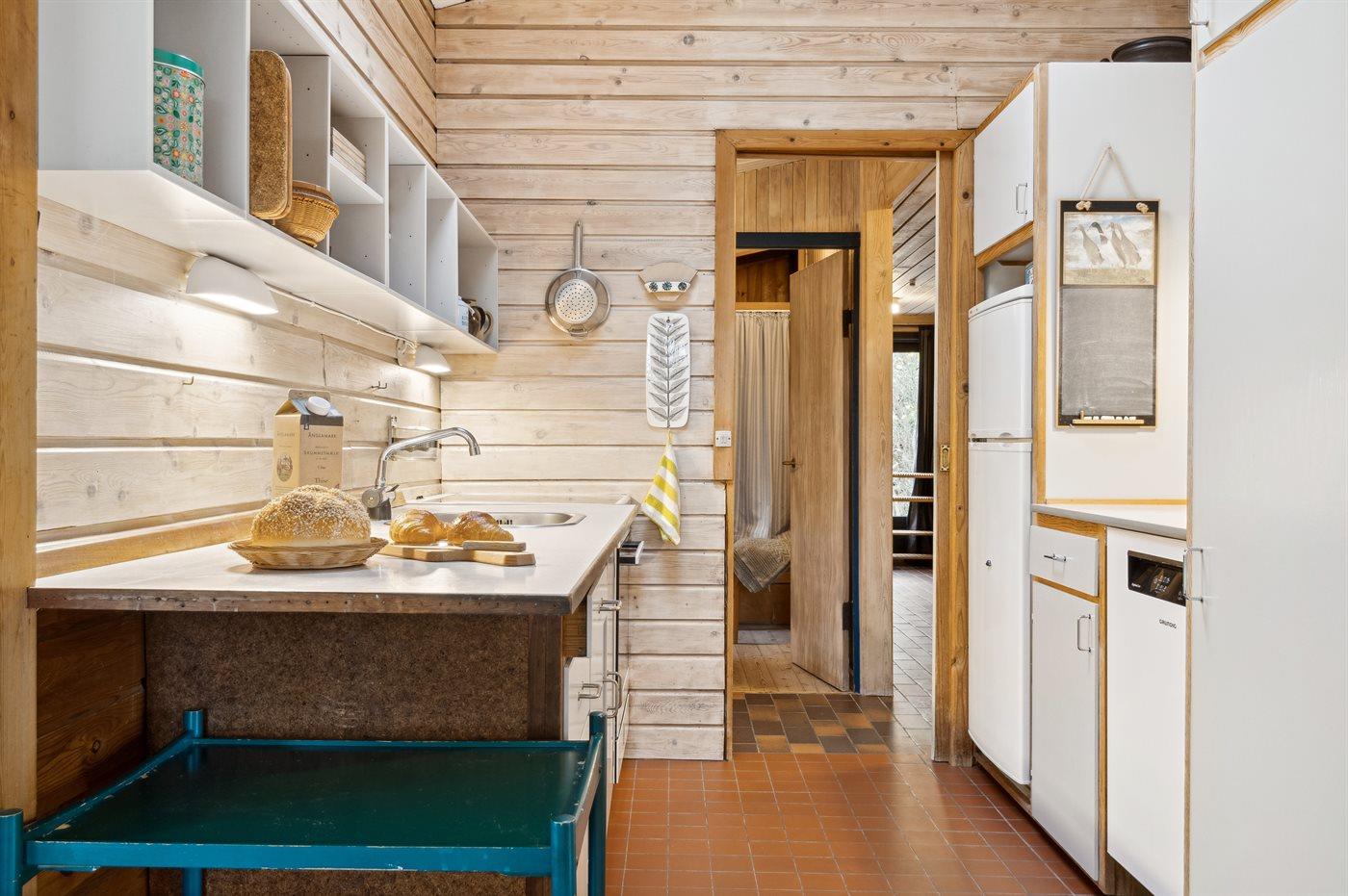 Køkkenet er udstyret med 1 køleskab. Der er 4 induktionskogeplader, varmluftovn samt opvaskemaskine.