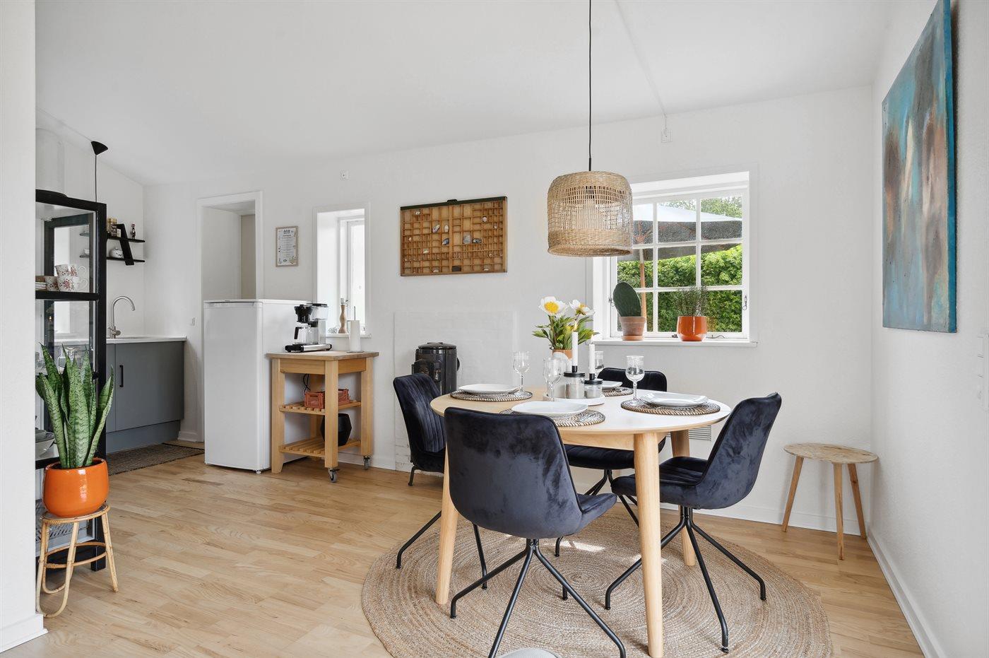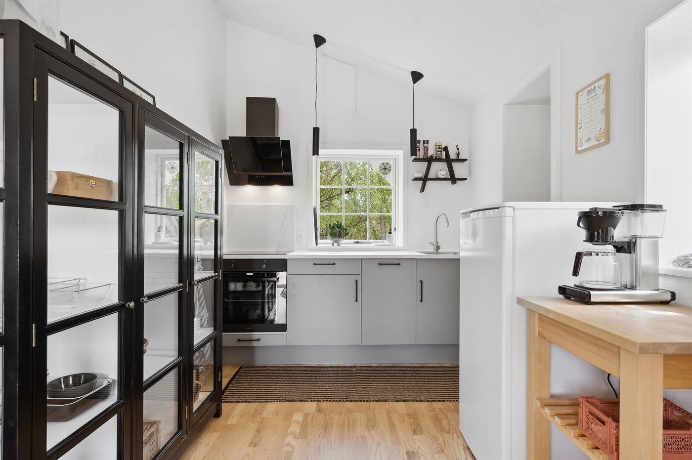 Køkkenet er udstyret med 1 køleskab. Der er 4 keramiske kogeplader, varmluftovn samt opvaskemaskine.