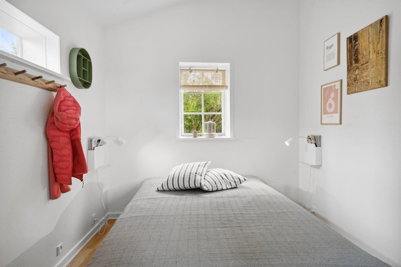 Der er i alt 1 soveværelse. Sovepladserne fordeler sig på: 2 sovepladser i dobbeltseng. 1 soveplads i sovesofa (enkelt). 1 af disse sovepladser befinder sig i stuen.