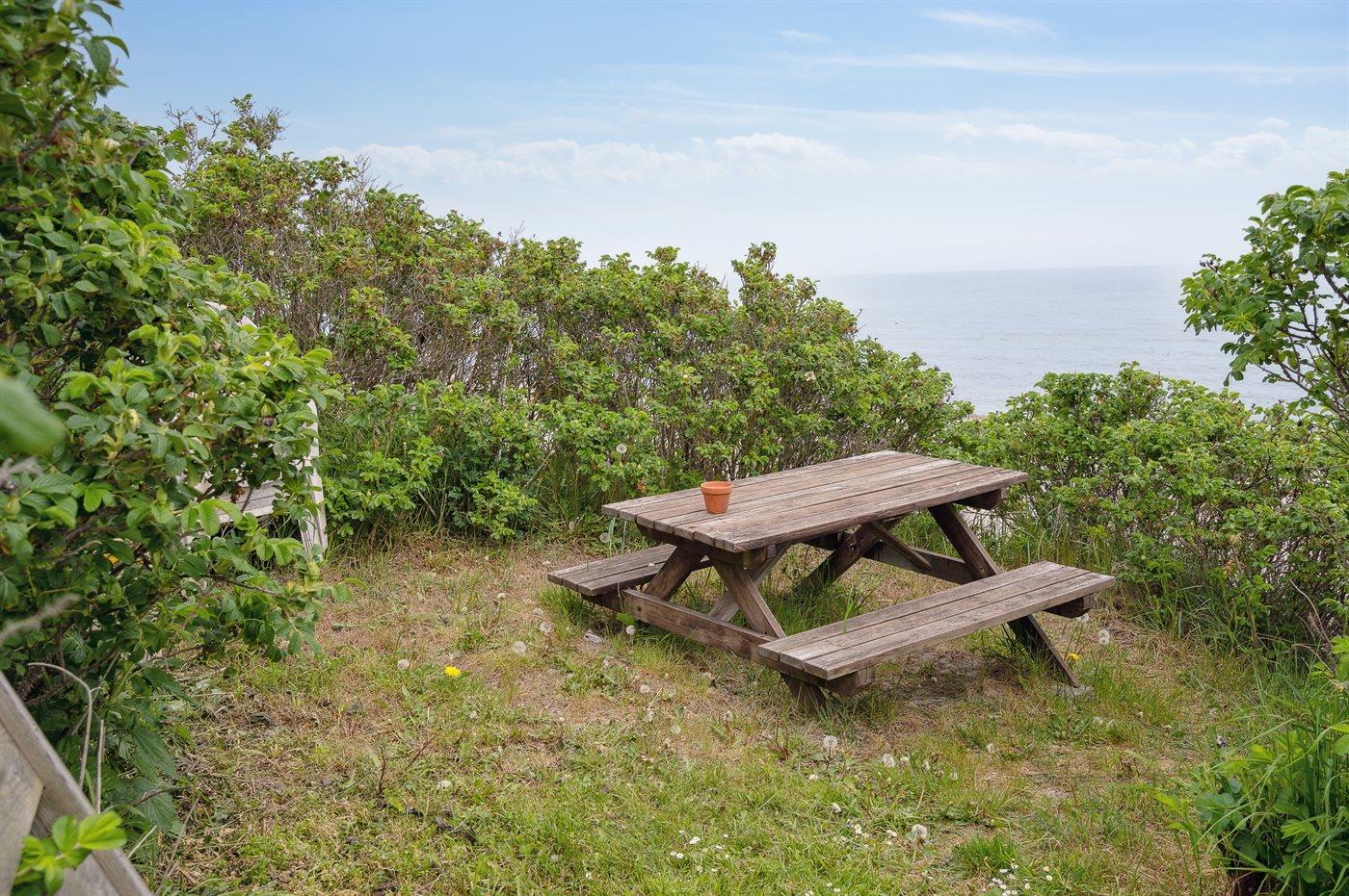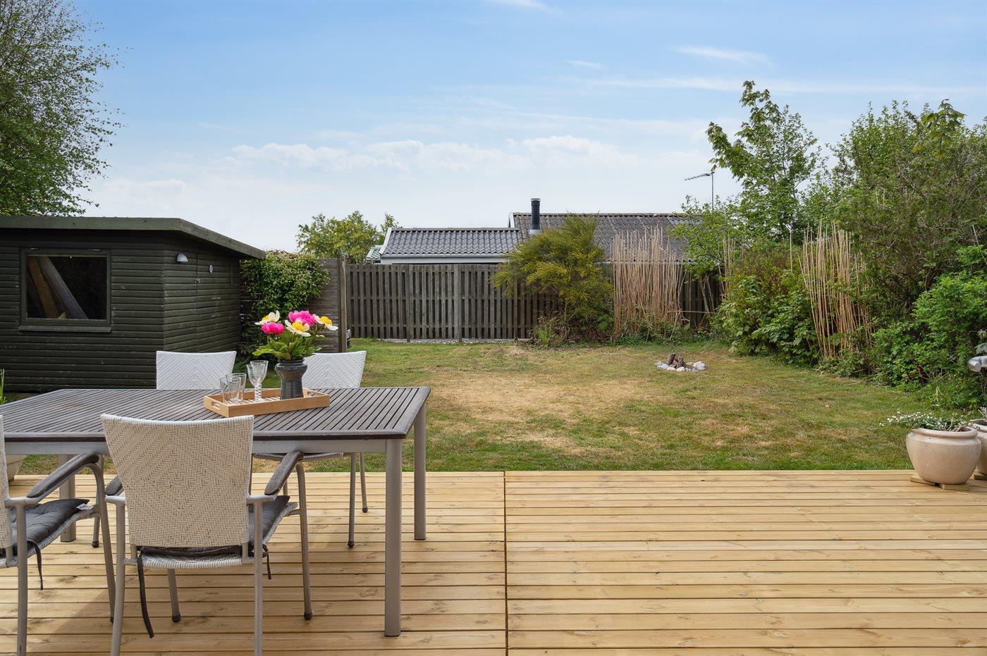 Ferieboligen er beliggende på en 419 m² stor havegrund. Der er 50 m til havet. Nærmeste forretning er beliggende i en afstand af 2500 m. Til ferieboligen hører åbent terrasseareal. Desuden er der overdækket terrasse. Bålsted. Grill til rådighed. Parkering ved ferieboligen.