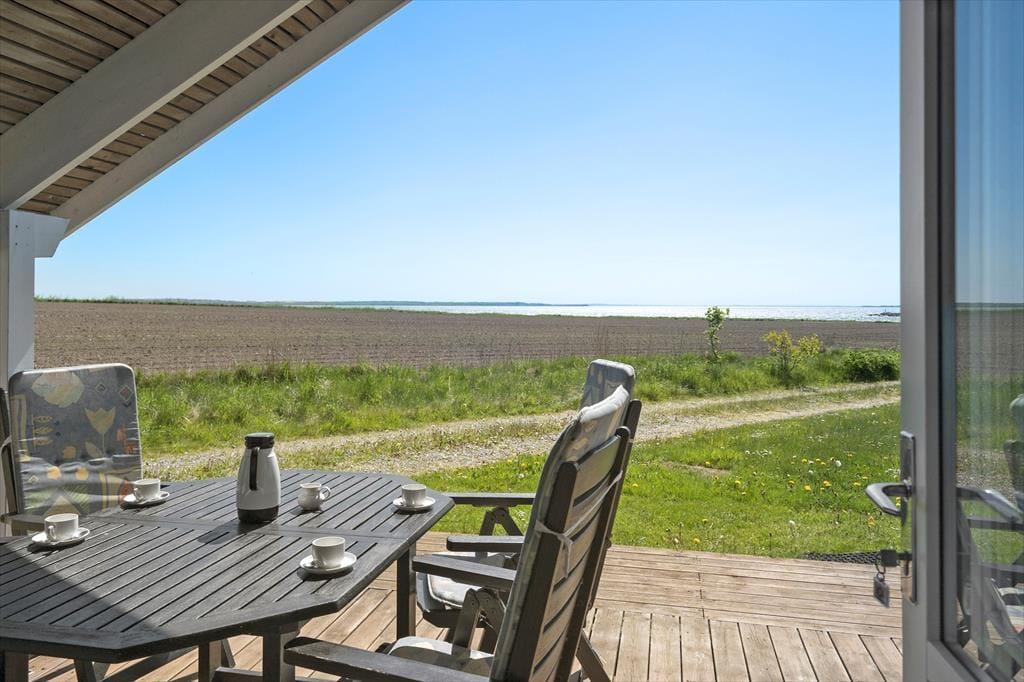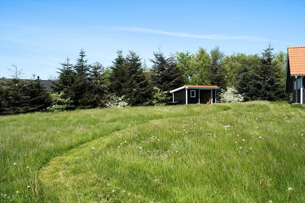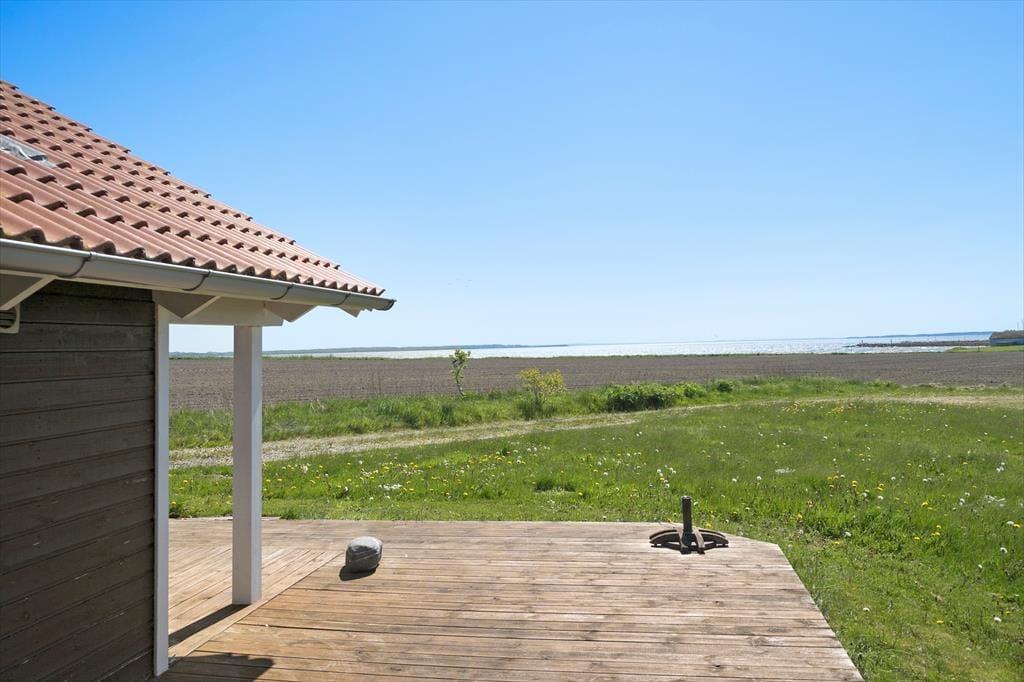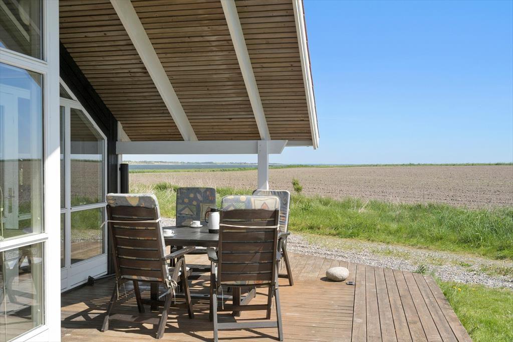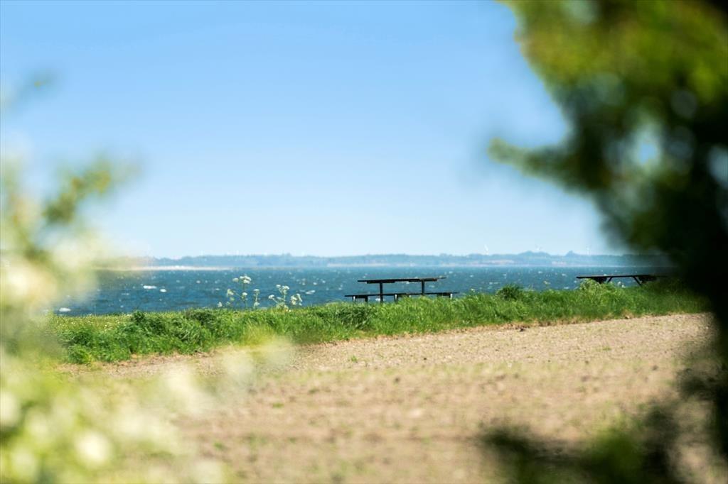 Sommerhuset ligger helt fredfyldt placeret for enden af Markvejen, og grunden er helt enkelt anlagt, så der er ikke noget, der skærmer for fjordudsigten mod øst og syd. En omgang vikingespil eller andre havelege er der god plads til på havens græsplæne, og hvis du foretrækker at nyde den friske luft på mere tilbagelænet vis, kan du sætte dig godt til rette på terrassen i stedet. Den store træterrasse breder sig om tre af husets sider, så du kan oplagt flytte havestolen i takt med solen – hvis ikke du går efter at finde skygge under overdækningen i stedet.