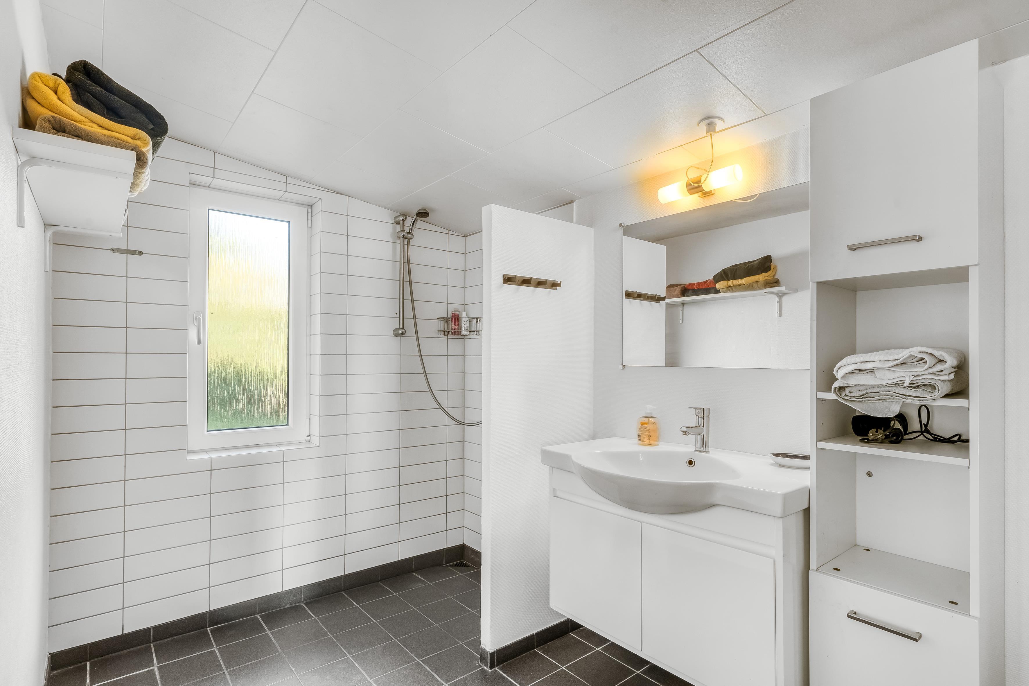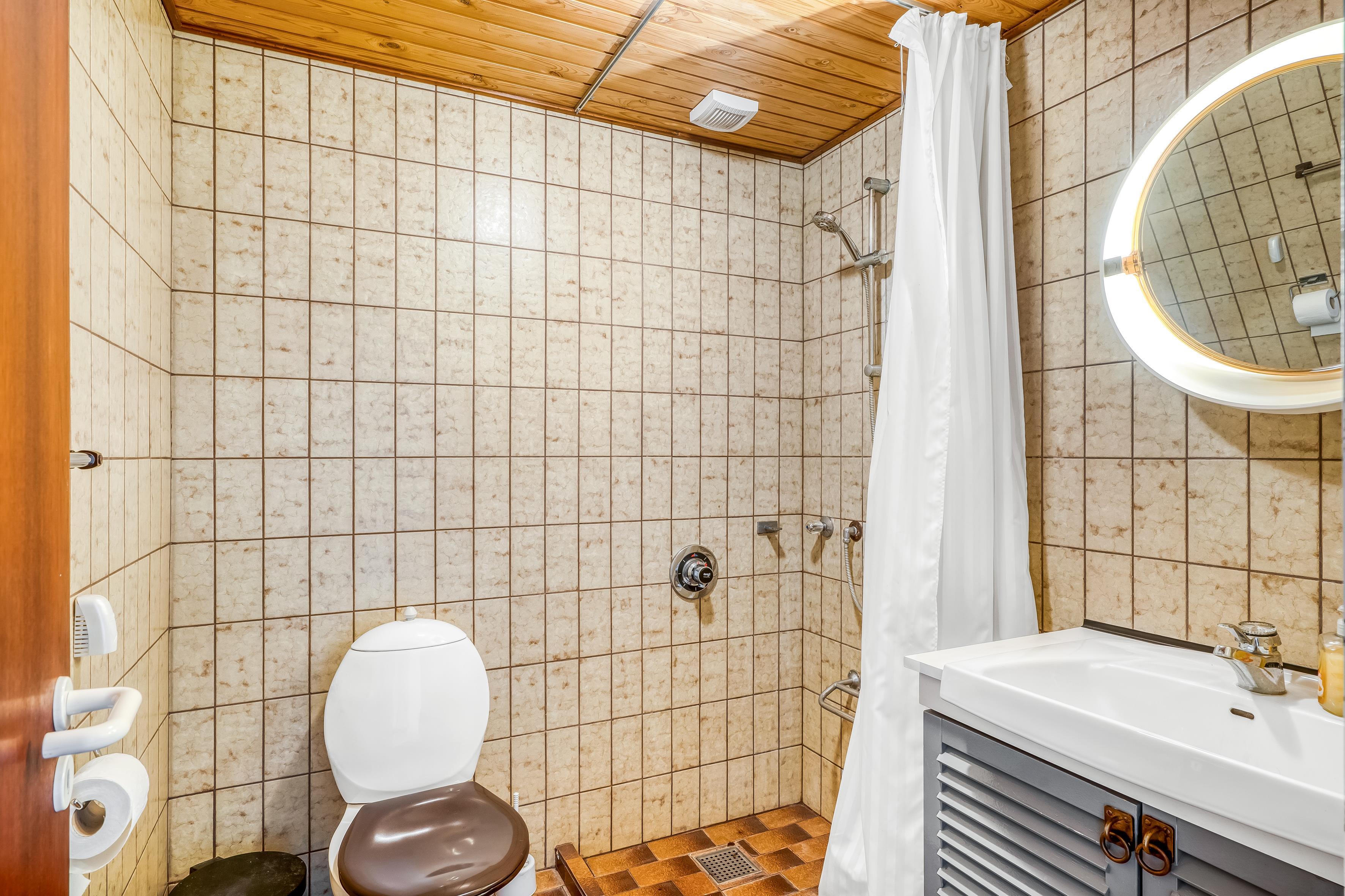 Der er 2 flotte badeværelser, begge med toilet, håndvask, bruseniche og gulvvarme – ideelt for komfort og velvære. Udendørs kan I slappe af i det store 6-personers vildmarksbad på terrassen, hvor I kan nyde den friske luft og den fantastiske udsigt over fjorden.