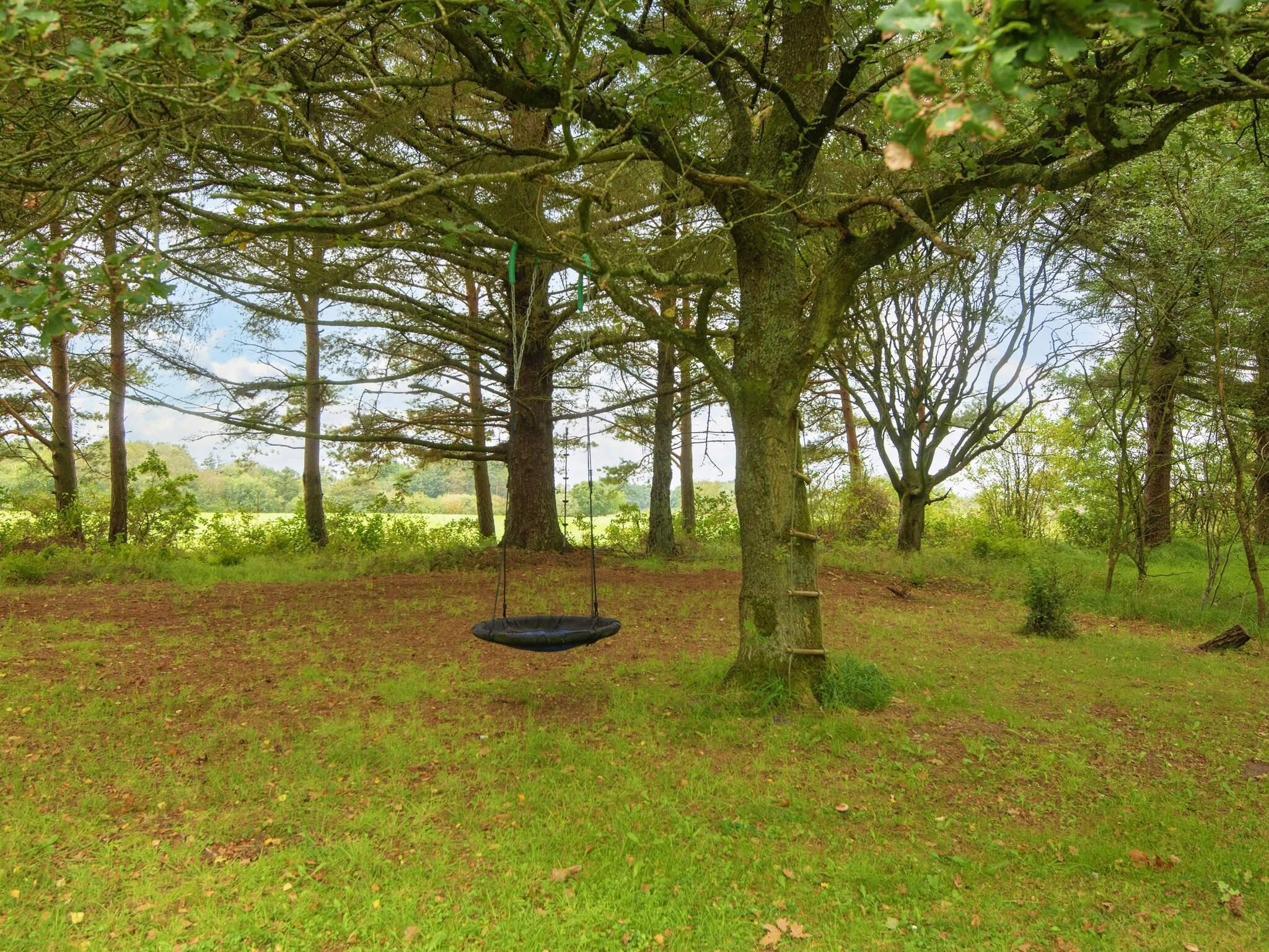Fra stuen har gæsterne adgang til en delvist overdækket terrasse, perfekt til at nyde solrige dage eller måltider tilberedt på grillen. Den store have har en gynge og en trampolin (brug på eget ansvar), samt rigelig græsplæne til boldspil og udendørs aktiviteter. Hjemmet giver komfortable, praktiske rammer for familieafslapning og sjov.