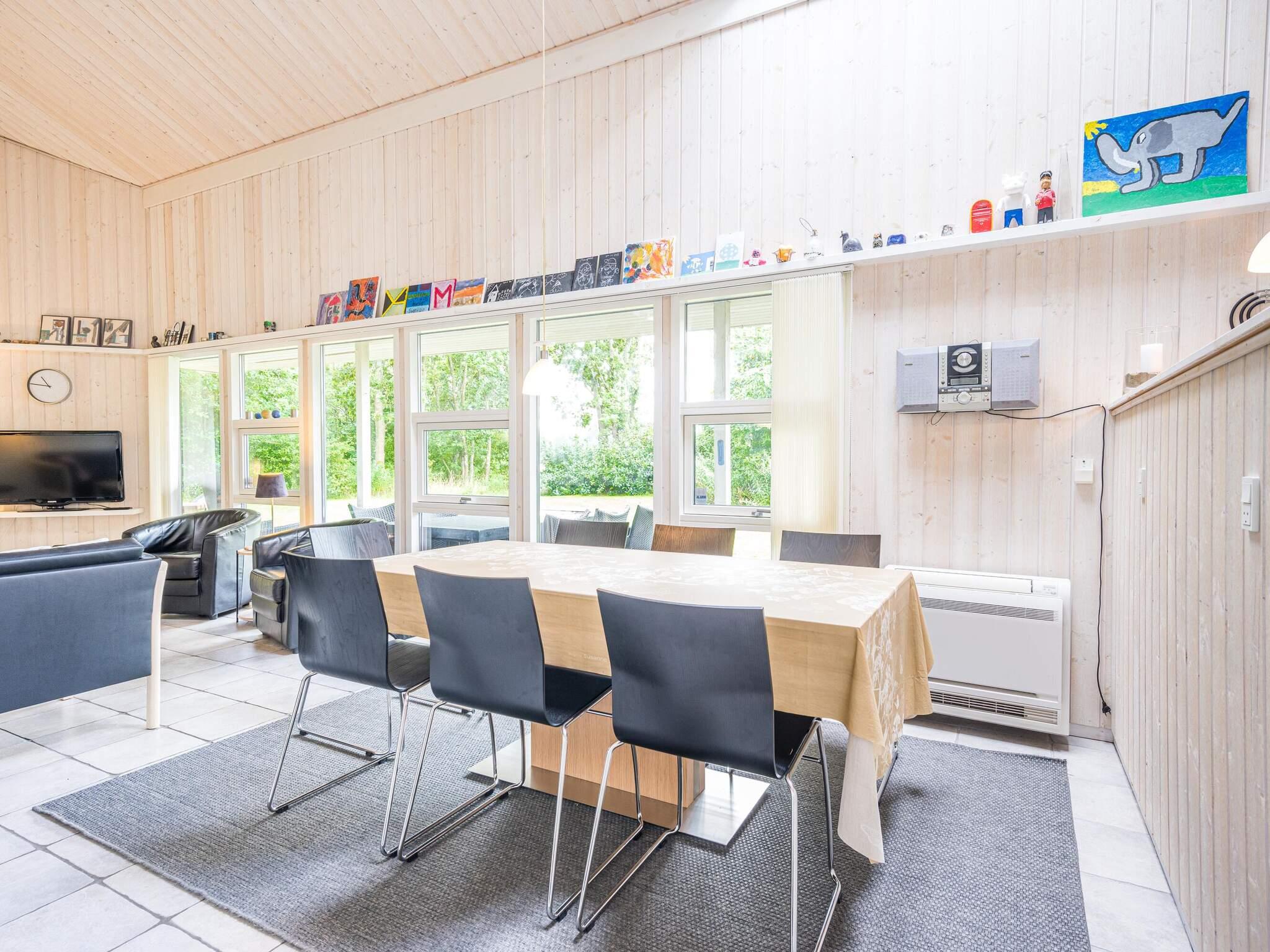 Sommerhuset er smagfuldt indrettet med et lyst og åbent opholdsrum, hvor køkken, spiseplads og stue smelter sammen i ét – her kan I være sammen om madlavningen, mens børnene spiller spil, hygger med en film eller slapper af. Spisebordet er placeret centralt, så måltider og samvær altid er i fokus.