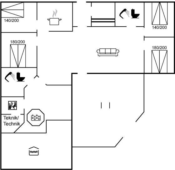 Der er i alt 5 soveværelser. Sovepladserne fordeler sig på: 8 sovepladser i dobbeltsenge. 2 sovepladser i køjeseng. Derudover er der 1 stk. barneseng.