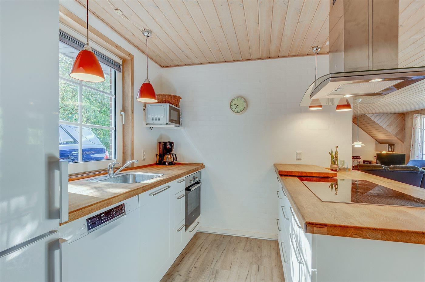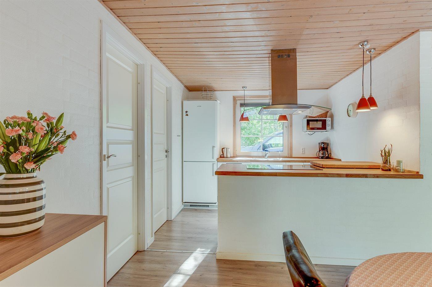 Køkkenet er udstyret med 1 køleskab. Der er 4 keramiske kogeplader, varmluftovn, mikrobølgeovn samt opvaskemaskine.