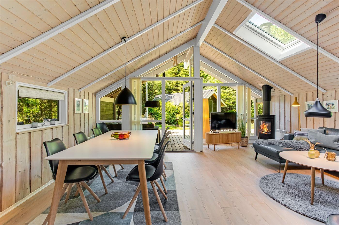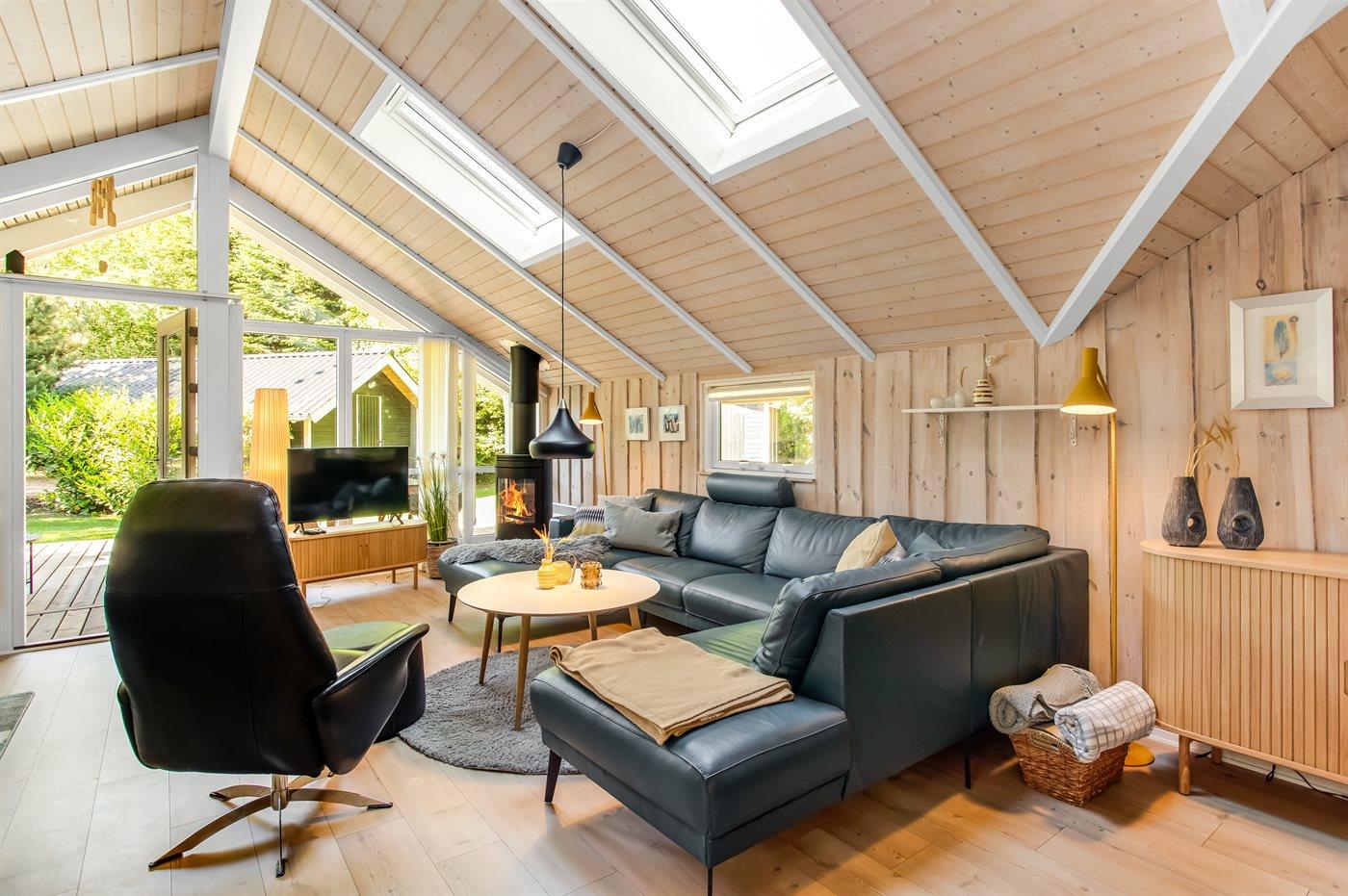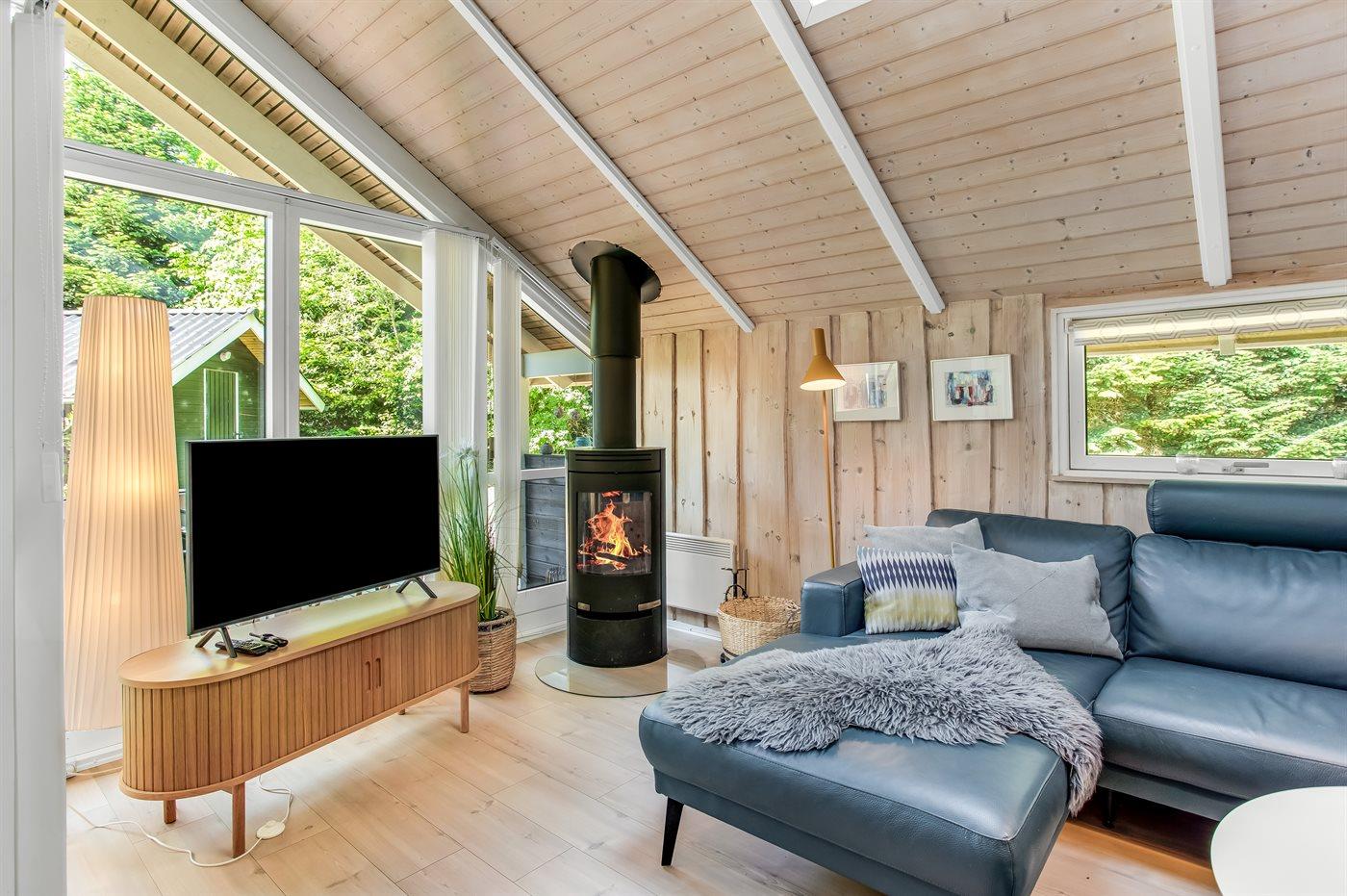 Dette er et sommerhus man kan nyde året rundt, om vinteren kan man nyde smukke spadsereture samt den overdækkede terrasse. Man kan også finde ly og varme ved brændeovnen, der hurtigt varmer hele huset op. Her er plads til at hele familien kan nyde den lækre lædersofa med udsigt til den unikke og grønne have, nyde flammerne i brændeovn eller se en god film på fjernsynet.