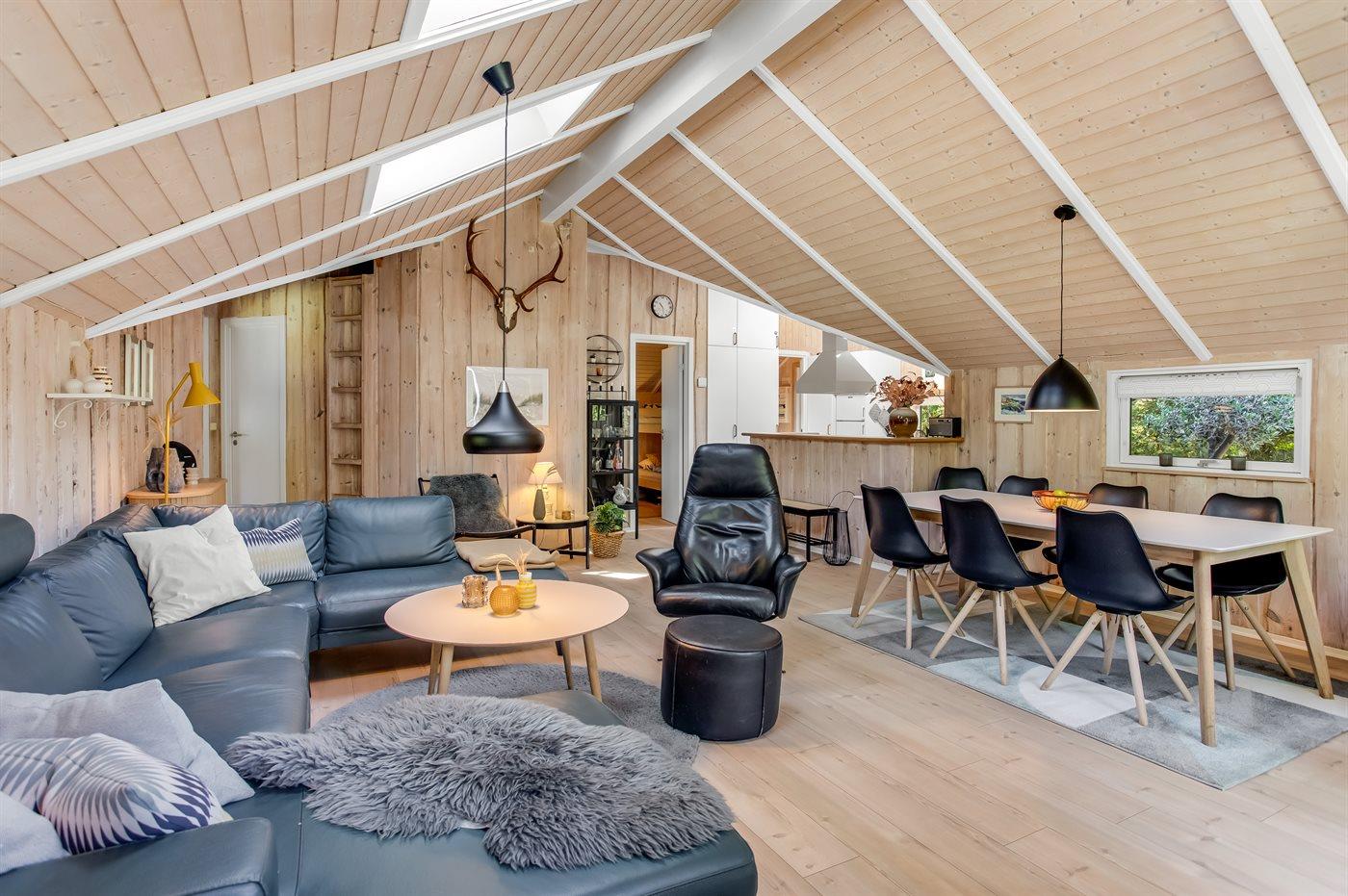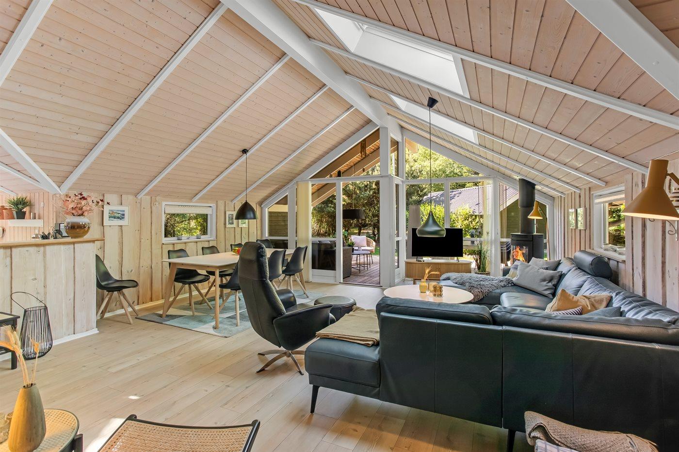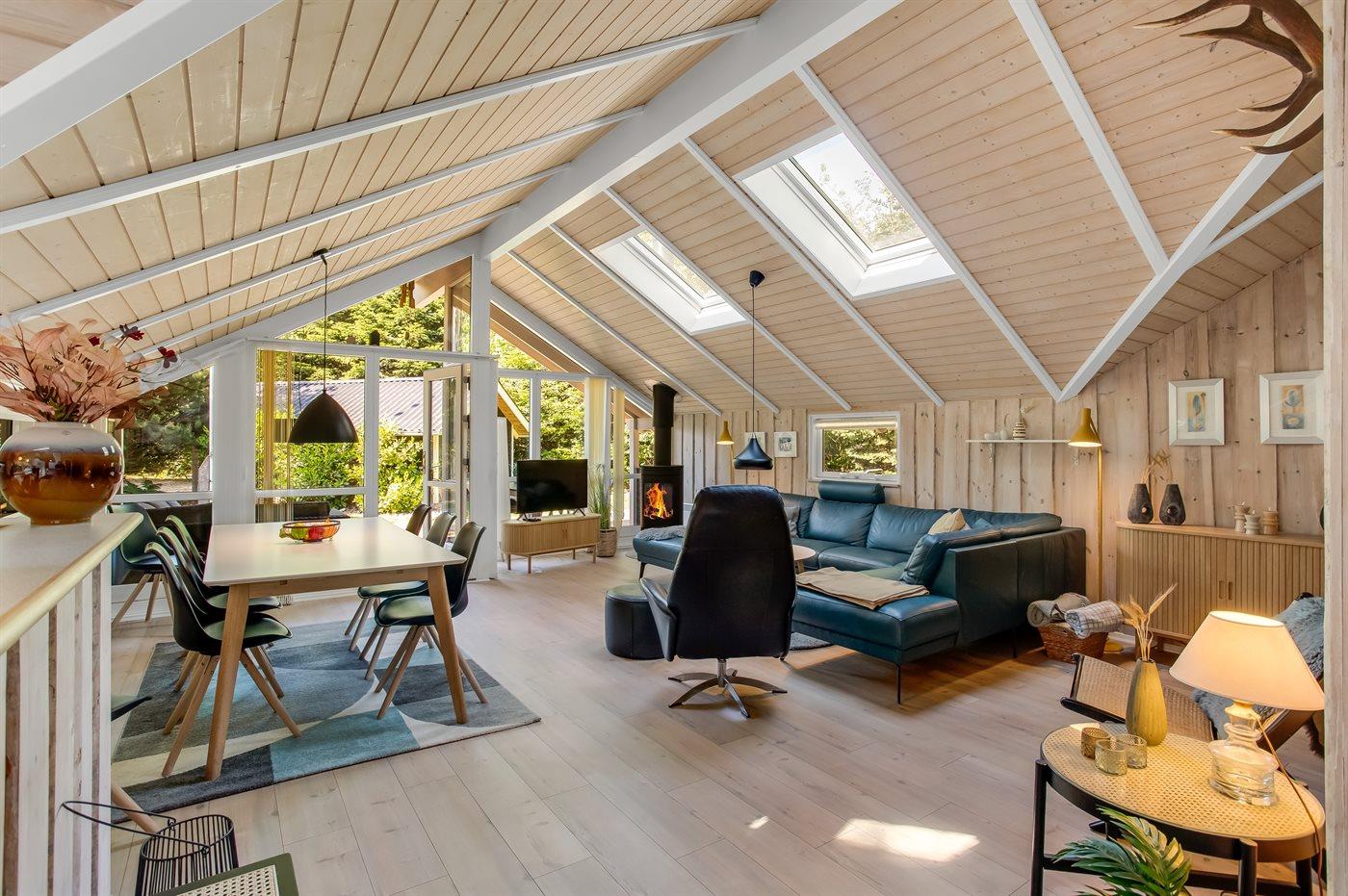 Dette er et sommerhus man kan nyde året rundt, om vinteren kan man nyde smukke spadsereture samt den overdækkede terrasse. Man kan også finde ly og varme ved brændeovnen, der hurtigt varmer hele huset op. Her er plads til at hele familien kan nyde den lækre lædersofa med udsigt til den unikke og grønne have, nyde flammerne i brændeovn eller se en god film på fjernsynet.