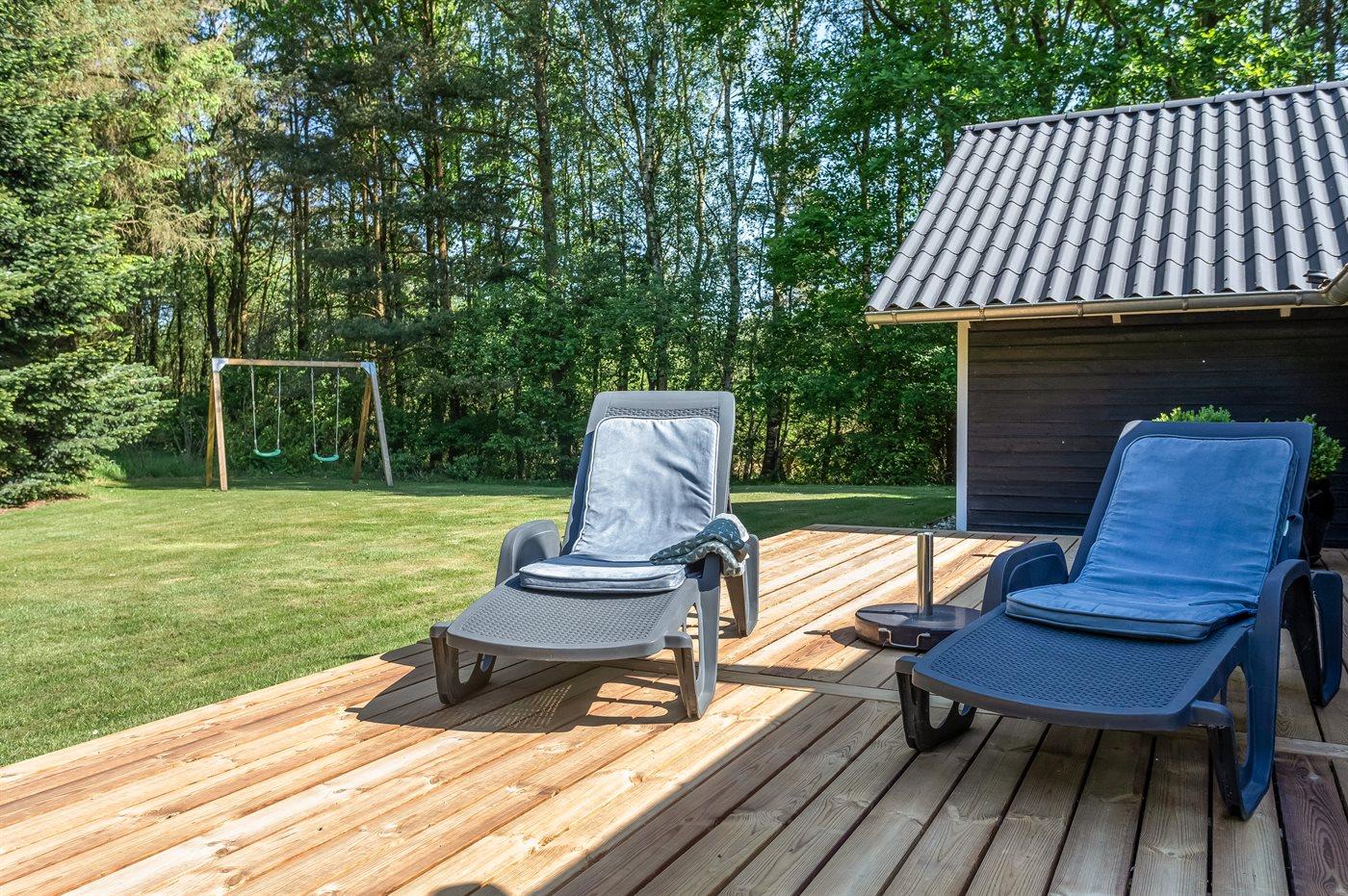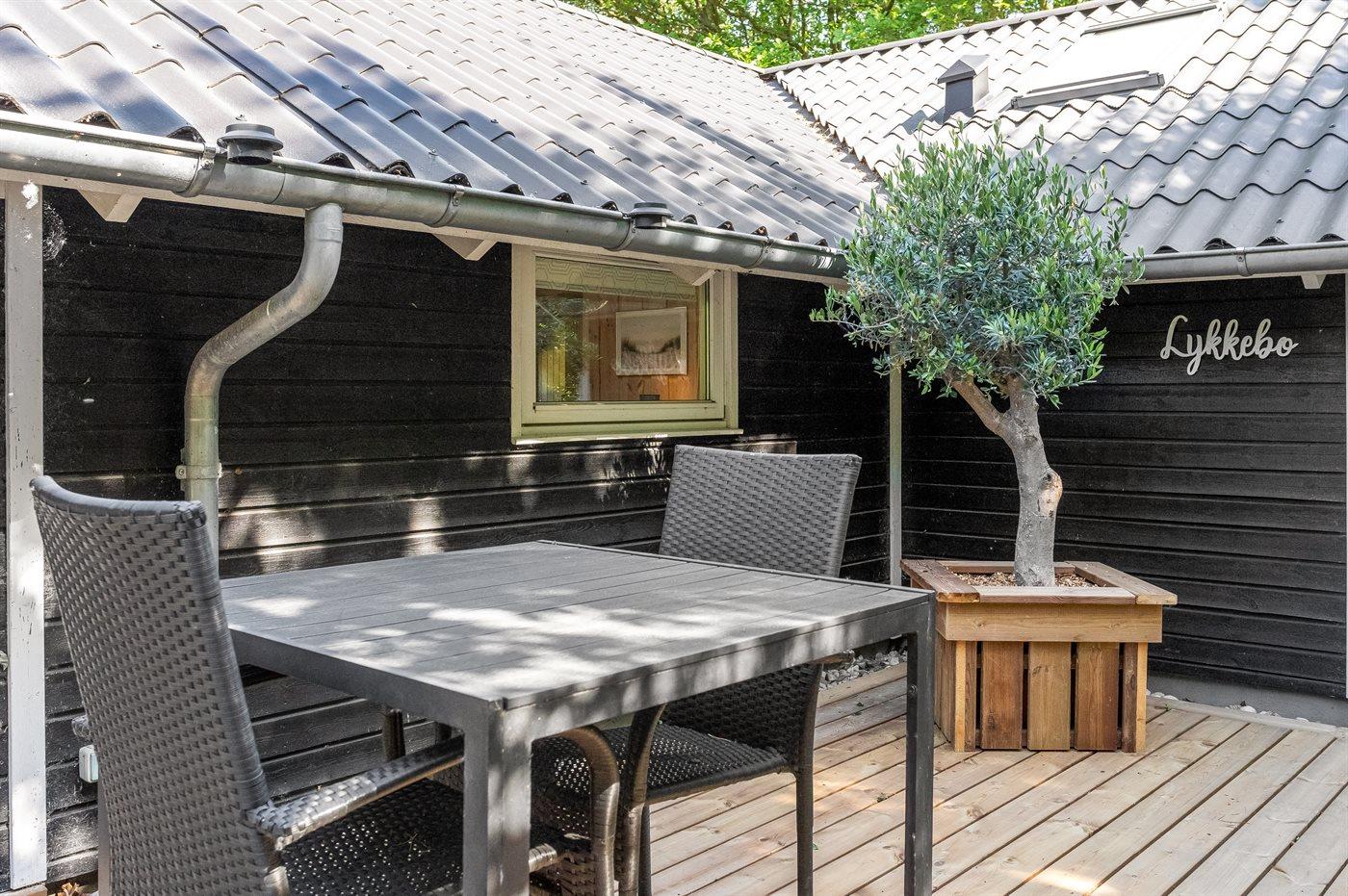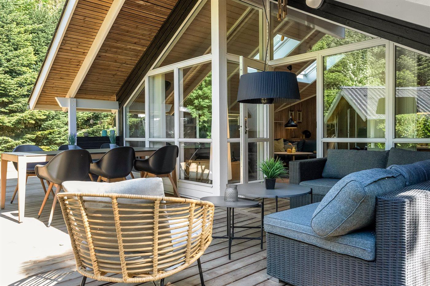 Når man ankommer til dette sommerhus, bliver man budt velkommen af en pragtfuld have, som er utrolig velplejet med blomster i krukker og træterrasse. Her kan man parkere sin bil sikkert i carporten. Et sommerhus, der emmer af eksklusivitet og varme. I huset finder man spil, så man kan nyde gode aftner om spisebordet med et glas vin og en smuk brændeovn i baggrunden.