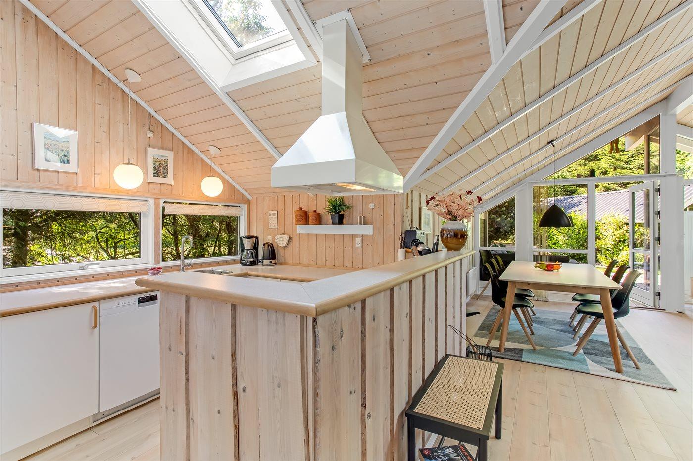 Køkkenet er udstyret med 1 køleskab. Der er 4 elkogeplader, varmluftovn, mikrobølgeovn samt opvaskemaskine.