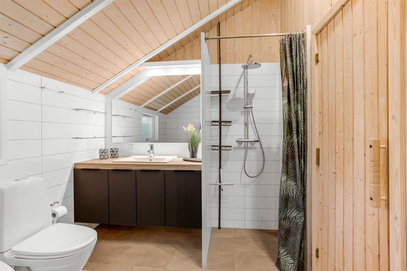 Der er 1 badeværelse med bruseniche og 1 toilet.. Der er gulvvarme på 1 badeværelse. I saunaen er der mulighed for afslapning.