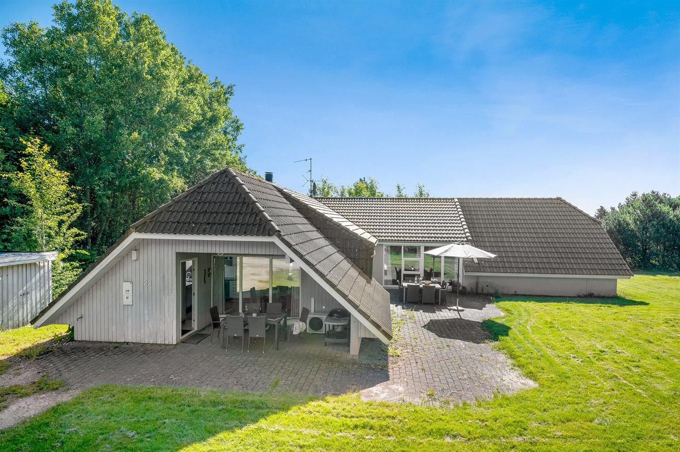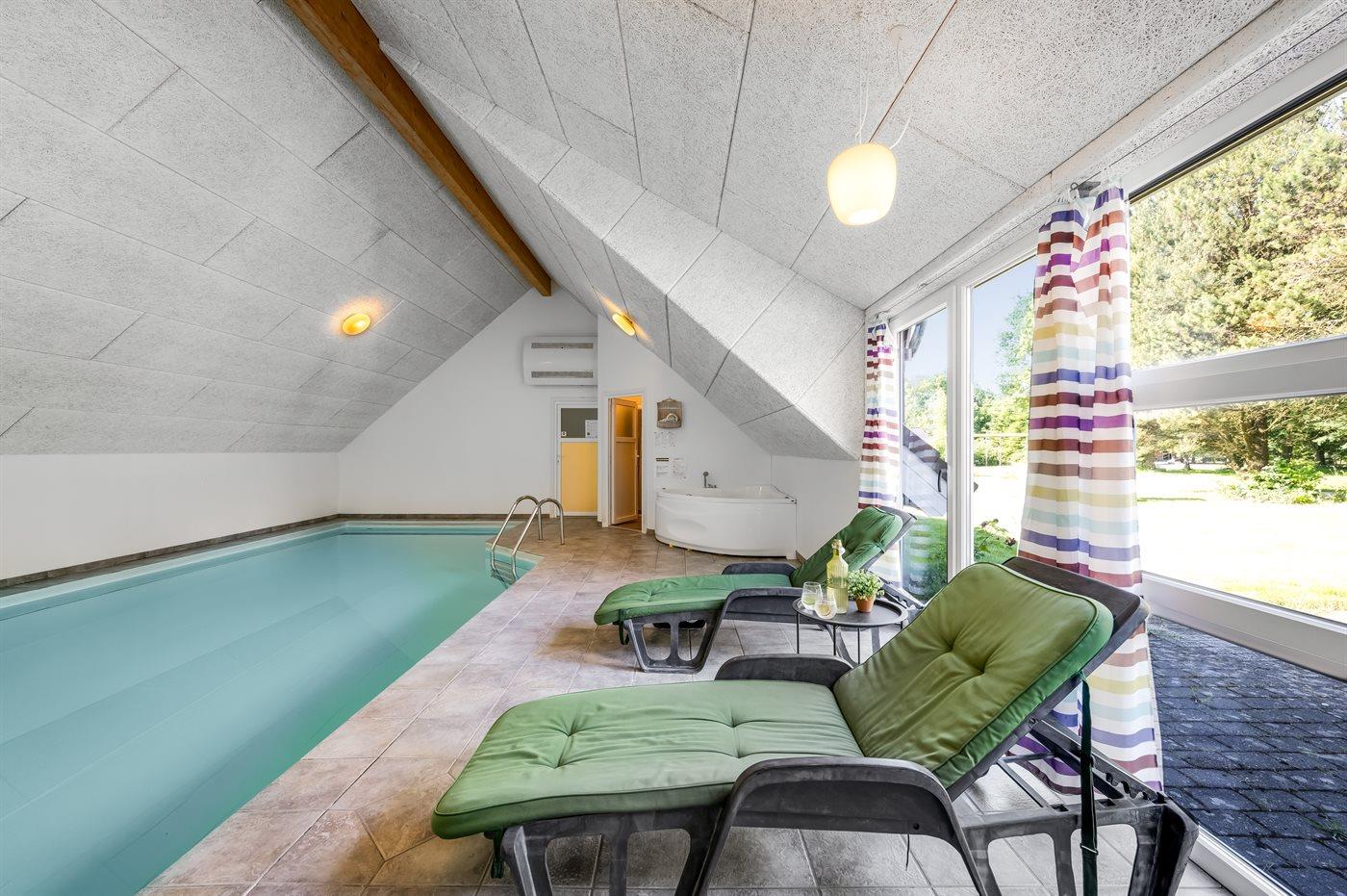 Rummeligt sommerhus i Jegum Ferieland med indendørs pool, spa, sauna og stor naturgrund med legeplads.